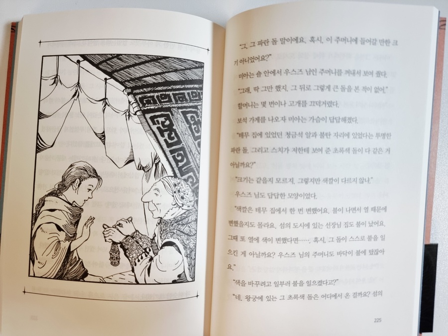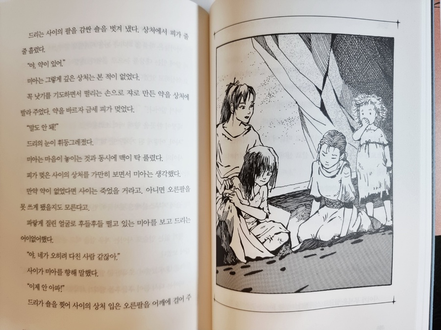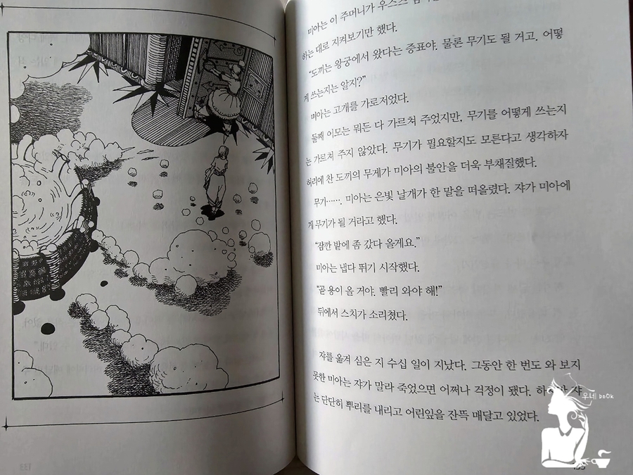 용이 부른 아이 1권의 가장 큰 사건은 바로 전설의 용사 우스즈와 별의 소리 마녀에 관한 내용일 것이다. 과거 활마녀 때문에 우스즈와 별의 소리 마녀 그리고 우스즈의 용이 저주를 받게 된다. 어디로 사라진 것인지 알 수 없는 상황이다. 우스즈의 성에서 우는소리가 난다는 것 때문에 마녀들을 비롯한 왕궁 사람들은 공포에 질려있는데, 바로 그 일을 해결하기 위해 골짜기 출신인 미아가 선택된 것이다. 우스즈의 방에 들어가게 된 미아는 무섭긴 했지만, 하루 종일 긴장상태였기 때문에 너무 피곤했다. 마침 근처에 있던 보자기를 풀고 나니, 불에 타서 구멍이 난 주머니가 들어있었다. 주머니는 책상에 넣고 보자기를 펴고 잠을 잔 미아. 동쪽 궁이 먼 관계로 달의 궁인 서쪽 궁에서 지내게 된 미아는 마녀들이 만든 죽이 입에 맞지 않았다. 너무 썼다. 그렇다고 안 먹기에는 배가 고팠다. 다행히 착한 마녀가 미아를 안타깝게 여겨 식재료와 낡은 화로를 준다. 하지만 보리를 많이 담아 갈 수 없었고, 미아에게 재료를 나눠주는 마녀를 만날 수 없었기에 미아는 힘든 시간을 보낸다. 고민하던 미아는 자신의 옷을 꿰매서 주머니를 만든다. 또한 소금을 담을 주머니가 없었기에 전에 책상에 넣어둔 주머니를 꿰맨다. 주머니를 꿰매는 순간 이상한 일이 벌어지는데... 겁쟁이 미아가 어려움을 헤쳐나가면서 우스즈와 별의 소리 마녀를 찾아내는 데 큰일을 한다. 한발 늦어 왕궁이 불길에 휩싸이고, 왕자와 아마다의 아들 코우가 큰 화상을 입어 사경을 헤맬 때 미아는 골짜기 마을의 만병통치약인 약초 쟈로 만든 연고를 가지고 있었다. 쟈는 오직 골짜기 출신이 사용해야 약효가 나는데, 활 마녀에 의해 왕궁으로 이어지는 다리가 끊긴 상황이었다. 과연 미아는 왕자와 코우를 구할 수 있을까? 사건이 해결된 후, 예상치 못한 반전을 맛보게 된다. 그토록 미아를 미워하고 괴롭혔던 릴리트의 정체가 밝혀진 것이다. 그리고 릴리트는 이 일로 인해 왕궁에서 쫓겨나게 된다. 마지막 만남을 가진 릴리트와 미아 사이에 오고 간 대화와 상황들이 마음을 아프게 했다. 활마녀의 저주를 끊어내고, 우스즈와 별의 소리 마녀를 찾아내고, 우스즈의 용까지 찾아낸 미아. 과연 2편에서 미아는 어떤 활약을 할지 무척 기대된다. |