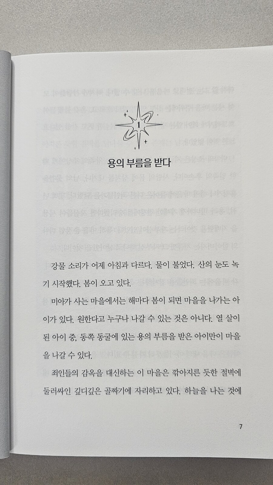 미아가 사는 마을에서는 해마다 봄이 되면 열 살이 된 아이 중, 동쪽 동굴에 있는 용의 부름을 받은 아이만이 마을을 나갈 수 있다. 한 명도 부름을 받지 못하는 해도 있고, 두세 명이 부름을 받는 해도 있다. 용의 부름을 받는 것은 명예로운 일이다. 올해 열 살이 된 미아는 자신은 용의 부름을 받지 못할 거라고 생각하고 있었다. - '용의 부름을 받다' 중에서