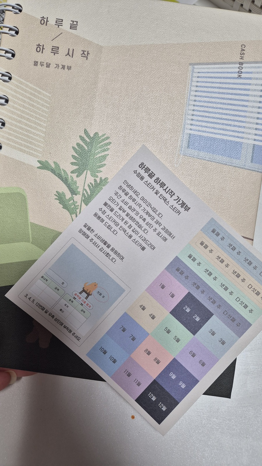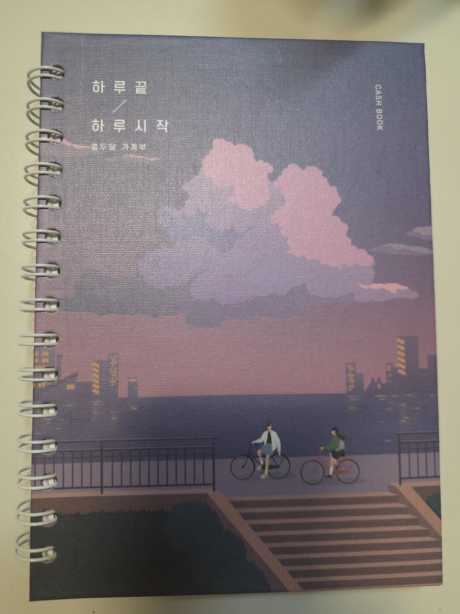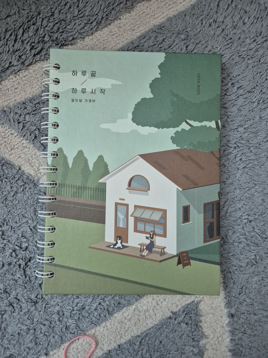 | 스프링으로 된 가계부는 처음입니다. 오타상품인 대신 저렴하니 12군데에 스티커 붙이는 5분짜리 수고만 하면 됩니다. 외부 표지도 내부 디자인도 귀엽고 구성도 괜찮아요. 조금 아쉬운 점도 있는데, 가계부 표지를 닫았을때 위쪽 커버가 완전히 닫히지 않고 살짝 떠요. |