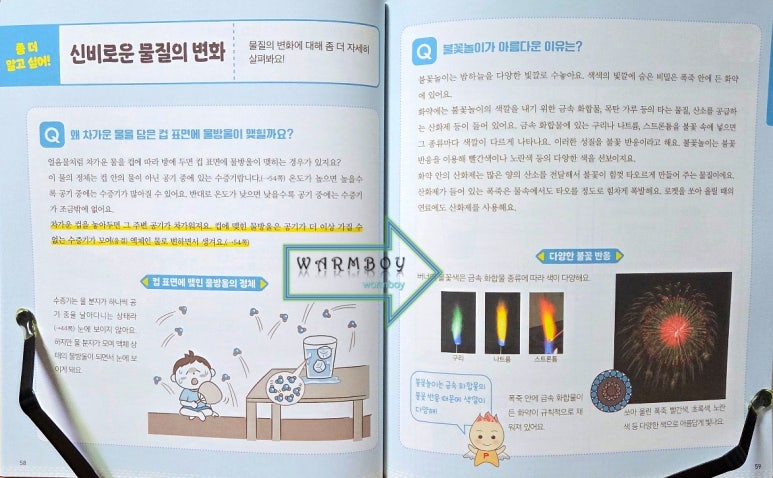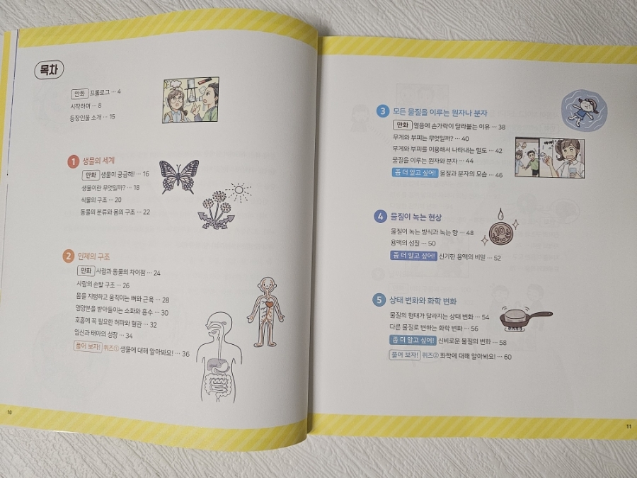 처음에는 만화로 되어 있어서 초등학생도 부담 없이 흥미를 가질 수 있도록 구성 된 점이 좋았어요. 아직 1학년이라 내용이 어려운 부분도 있지만 만화로 먼저 호기심을 자극하고 해서 좋았어요. 그리고 나서 글과 도표를 통해서 과학 개념을 설명해 주기 때문에 아이가 자연스럽게 내용을 받아들일 수 있어요! 평소 궁금해하던 일상 속 과학 현상들에 대해서도 이 책에서 쉽게 찾아볼 수 있다는 점이 정말 좋았어요. 집에서 물고기와 곤충을 키우고 있어서 다양한 궁금증을 갖고 있는데 저도 모르는 부분은 검색하며 알려주곤 했거든요. 그런데 이 책은 그런 호기심들을 과학 개념과 연결해 쉽고 재미있게 설명해 주니 큰 도움이 됐습니다.