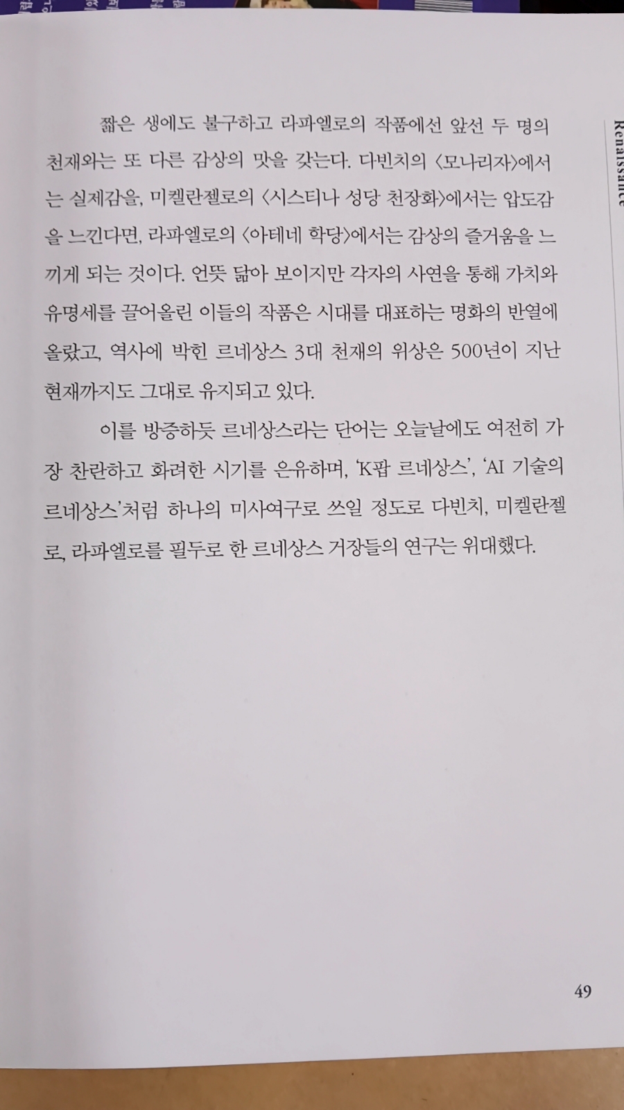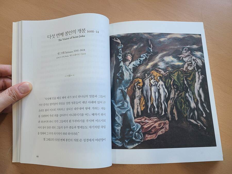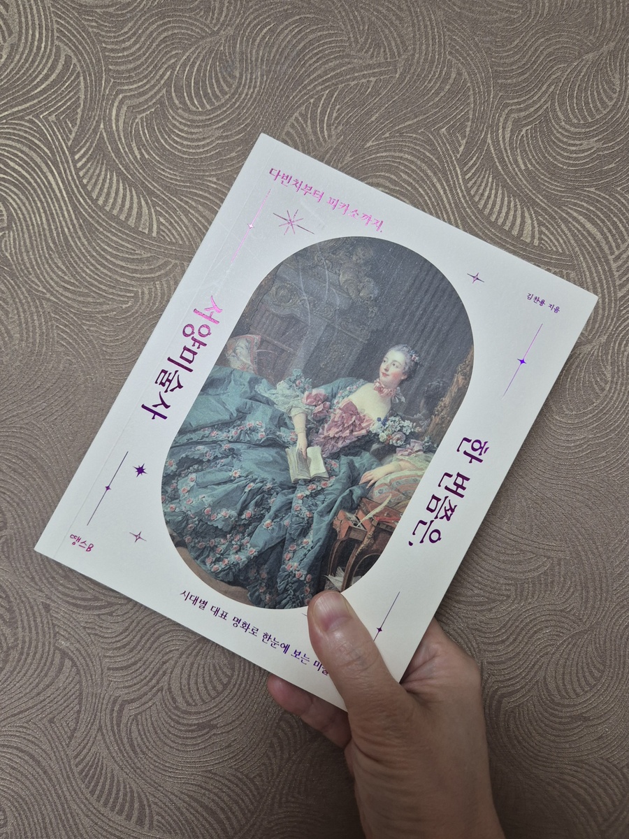 카페 책과콩나무의 서평단으로 출판사로부터 도서를 제공받아 직접 읽고 쓴 리뷰입니다. 《한 번쯤은, 서양미술사》는 대한민국 1호 전업 도슨트로 도슨트계의 시조새라고도 불리는 18년차 미술 전시 해설가 김찬용 님의 책이다. 14세기 말 르네상스부터 20세기 초 입체주의까지 시대를 대표하는 명화로 17개 사조 50명 작가의 작품을 각 한 개씩 실었는데, 머리말에서 다음과 같은 뜻을 전하고 있다. "각 시대의 미술적 특징이 복합적으로 잘 담긴 명화들을 선별해 작품을 시대순으로 보기만 해도 인간이 세상을 보고 관찰하며 표현하는 방식이 어떻게 변화하고 발전해왔는지 직관적으로 느낄 수 있는 책을 만들고자 했다." 2019년 생바나나를 테이프로 벽에 붙여놓은 마우리치오 카텔란의 <코미디언>이라는 작품과 관련한 미술계의 논란을 소개하며 이야기의 실마리를 풀어낸다. 시작부터 이미 흥미진진하다. 처음으로 소개되는 작품은 보티첼리의 <비너스의 탄생>이다. 이탈리아 여행 중 피렌체의 우피치 미술관에서 봤던 기억이 지금도 생생하다. 책을 펼치면 두 쪽 가득 그림이 실려 있는데 한 가지 아쉬운 점은 제본 과정에서 가려지는 부분이 생겨 작품의 중심인 비너스의 모습이 절반 가까이 보이지 않는다. 그러니 '베누스 푸티카'와 '콘트라포스토' 라는 자세에 대한 해설을 따라가기 불편하다. 다빈치의 <모나리자>는 '명화'의 개념에 대해 생각케 한다. 명화를 가늠하는 기준 중 하나는 유명세인데, 모나리자는 작품 자체에 더해 수많은 이슈로 세계적 명화가 되었다. 미켈란젤로의 <시스티나 성당 천장화>는 가십거리나 이슈 없이도 작품 그 자체만으로 유명세를 얻는 명화를 보여준다. 저자는 <시스티나 성당 천장화>가 같은 공간에 <최후의 심판>과 함께 자리하고 있기에 그 압도감이 배가 된다고 지적하며, 현대의 거대한 미디어아트 전시에서 받는 강렬한 인상을 500년 전 인류에게 선사하는 수준의 경험일 것이라고 말한다. 이렇게 책 곳곳에는 저자의 찰진 비유가 번뜩이는데, 바티칸 박물관을 거쳐 시스티나 예배당을 들어가 이를 직접 본 사람들이라면 저자의 이 말에 동의할 수밖에 없을 것이다. 라파엘로의 <아테네 학당>은 당대까지 인류가 이룩해낸 위대한 철학, 과학, 수학, 예술의 역사를 한 장면에 담은 환상적인 작품이다. 저자는 이를 아카데미 시상식에 모여든 수많은 스타들의 모습에 열광하는 것과 같다고 비유한다. 바티칸 입장권을 들고 아테네 학당 앞에서 인증샷을 찍는 우리들도 마찬가지 아닐까 한다. 매너리즘은 익숙한 방식에 안주해 변화를 꺼리고 타성에 젖는다는 의미로 흔히 사용되지만 미술사에서의 매너리즘은 르네상스의 대가들로부터 벗어나 자신만의 독특한 스타일을 찾는 도전이고 변화였다는 해석이 인상적이다. 매너리즘이 이런 것이었을줄이야! 역시 사람은 많이 읽고 배워야 한다는 것을 새삼 느낀다. 베네치아 여행 중 두칼레 궁전에서 봤던 틴토레토의 <낙원>은 한 쪽 벽면을 가득 채우는 대형 벽화로 수많은 군상들이 함께 하는 압도적 위용으로 강한 인상을 남겼는데, 그림 속 인물과 표현에 담긴 뜻을 책을 통해 이제서야 알게 되었다. 이렇게 까막눈을 또하나 조금씩 벗겨낼 수 있다는 점이 이 책이 주는 미덕 중 하나다. 지난 겨울 예술의 전당에서 열린 반 고흐 전시회를 갔었는데, 이곳은 매표소부터 긴 줄이 늘어서 있었다. 하지만 바로 윗 층에서 함께 열렸던 카라바조의 전시회에는 사람들이 별로 없어 안타까움을 느낀 적이 있다. 그 카라바조는 압도적 재능으로 교황청에 의해 살인죄마저 사면을 받았던 천재 화가였고 미술사에 강렬한 족적을 남긴 이였다. 플란다스의 개로 더욱 유명세를 떨친 루벤스의 <십자가에서 내림>과 베르메르의 <진주 귀걸이를 한 소녀>를 통해 바로크 미술의 특징은 어둠 속으로 스며드는 빛의 표현이라는 점을 새롭게 알게 되었고, 로코코 미술은 부드럽고 우아한 가운데 주제와 분위기, 색감 모든 면에서 새로운 변화였다고 지적한다. 로코코를 로맨틱 코미디로 비유한 저자의 센스가 놀랍다. (책 표지에 실린 작품이 바로 로코코~!) 사실주의 사조의 밀레의 <이삭 줍는 사람들>은 단순히 목가적인 전원의 풍경을 담은 것이 아니라 수확이 끝난 뒤 떨어진 이삭이라도 주워가려는 가난한 농민들을 담담하게 그려낸 것이었다. 당대의 보수 평단으로부터 '사회주의적'이라고 비판받았다는 사실은 색안경을 끼고 세상을 바라보는 사람들의 몰상식을 다시 한번 확인시켜준다. 저자 김찬용은 오랜 기간 도슨트로 활동하며 대중들에게 미술의 가치와 향유의 즐거움을 전파했던 이로서, 전문가의 시각과 역사적 가치가 아닌 그저 일반 애호가로서 작품을 즐기는 우리네의 입장을 충분히 고려한다. 아카데미즘의 대표작으로 소개하고 있는 부그로의 <님프와 사티로스>, 카바넬의 <비너스의 탄생>은 보는 순간 탄성이 나올 만큼 아름답고 정교한 표현이 눈에 띄는데, 전문가의 영역인 미술사적 가치에서는 평가가 조금 다른 것 같다. 하지만 "개인의 기호를 굳이 역사적 가치와 일치시키려 노력할 필요는 없다. 취향의 영역에서 좋은 작품은 우리의 외