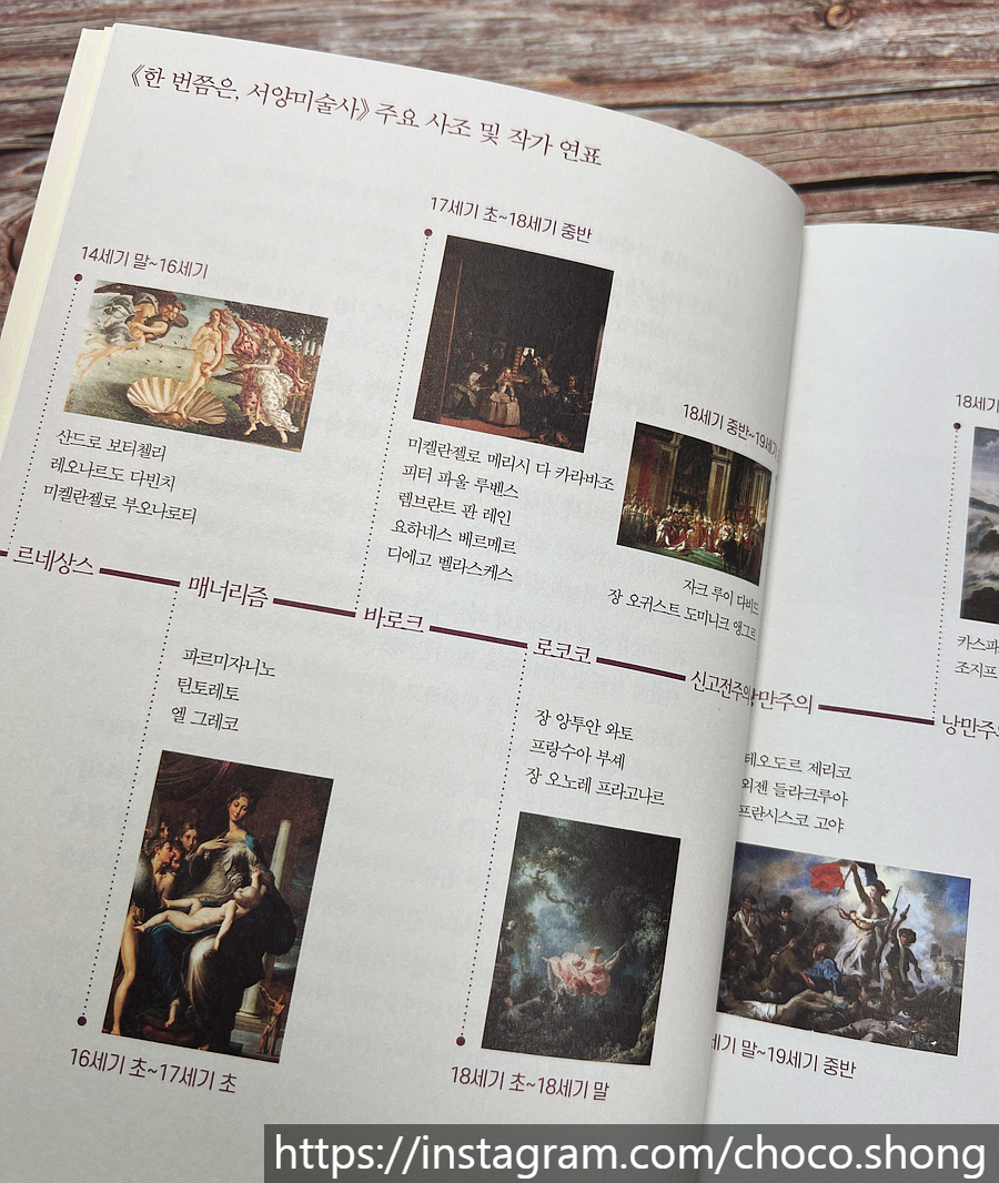 [이 리뷰는 컬처블룸을 통해 출판사에서 도서를 제공 받아, 직접 읽고 작성한 리뷰입니다.] <한 번쯤은, 서양미술사>는 '대중의 미술화'를 추구하는 저자가 '쉽지만 깊이를 잃지 않고, 친절하지만 가볍지만은 않은 진지함'으로 서양미술사를 다룬 책이다. 본격적으로 '미술'에 입문하기에 앞서 서양미술사 전반을 훑어보며 그 흐름을 알아볼 수 있도록 구성했다. 그래서인지 목차보다도 앞서 서양미술사의 주요 사조와 대표 작가와 작품들을 연표로 정리하고 있다.