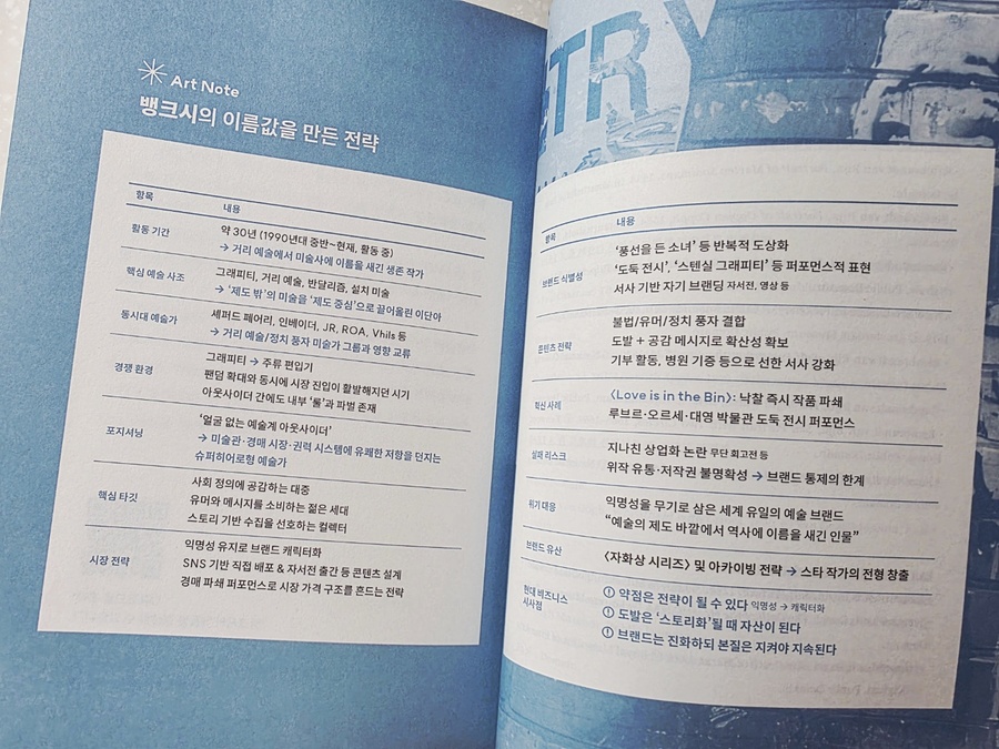 “미술계에서의 성공은 다른 예술 분야에서의 성공과 다르다.” 뱅크시는 예술가로 성공하는 것이 배우나 소설가, 가수로 성공하기 보다 훨씬 어렵다고 주장한다. 영화, 드라마, 음악은 다양한 선택지에서 주관적으로 선택 가능하다. 하지만 미술은 ‘미술관의 큐레이터’가 ‘내부적인 기준’으로 선정한 작품을 수동적으로 관람한다. 전시 공간은 제한적이고, 예술가들의 경쟁은 치열하며, 미술계 관계자들의 기준은 폐쇄적이다. 그래서 관객이 접할 수 있는 예술 작품은 극히 제한되고 다른 예술 장르와 달리 극소수의 구매자 중심으로 흘러가는 시장 구조이다. 나 또한 다른 예술 장르보다 그림이 어쩐지 많이 낯설고 접하기 힘들었다는 생각이 들었다. 이 책을 읽고나니 그림은 어떤 예술 장르보다 적극적인 노력이 필요한 분야인 듯 하다.