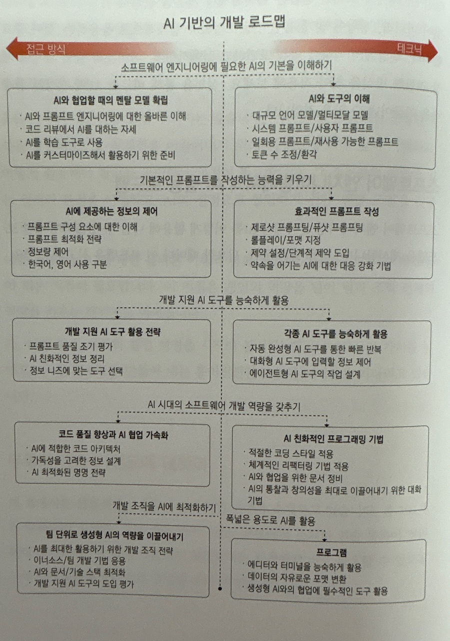 - 인상적이었거나 기억에 남는 파트 : 이 책은 국내 저서가 아닌, 일본 원서의 책이 번역되서 온 만큼 국내와 또 다른 시선에서 생성형 AI를 어떻게 개발에 쓸 수 있는가의 가이드를 상세하게 제시해준다. 무엇보다 AI의 사용은 어떻게 프롬프트를 짜느냐에 따라 그 퀄리티가 달라지는 만큼, 프롬프트를 어떻게 짜고 개발을 자동화시킬수 있는지부터 시작해 꽤 전문적인 내용을 많이 담고 있었다. 특히 초반에 AI 기반 개발 로드맵이라고 해서 로드맵을 쭉 안내하는데 인공지능의 기본을 이해하는 것부터 시작해 프롬프트 자성 능력, 정보에 맞는 도구 선택과 작업 설계, 코드 품질 향상과 가속화 같은 AI 시대의 개발자에게 필요한 공부와 역량 가이드를 깔끔하게 제시해주고 있어서 유용했다.