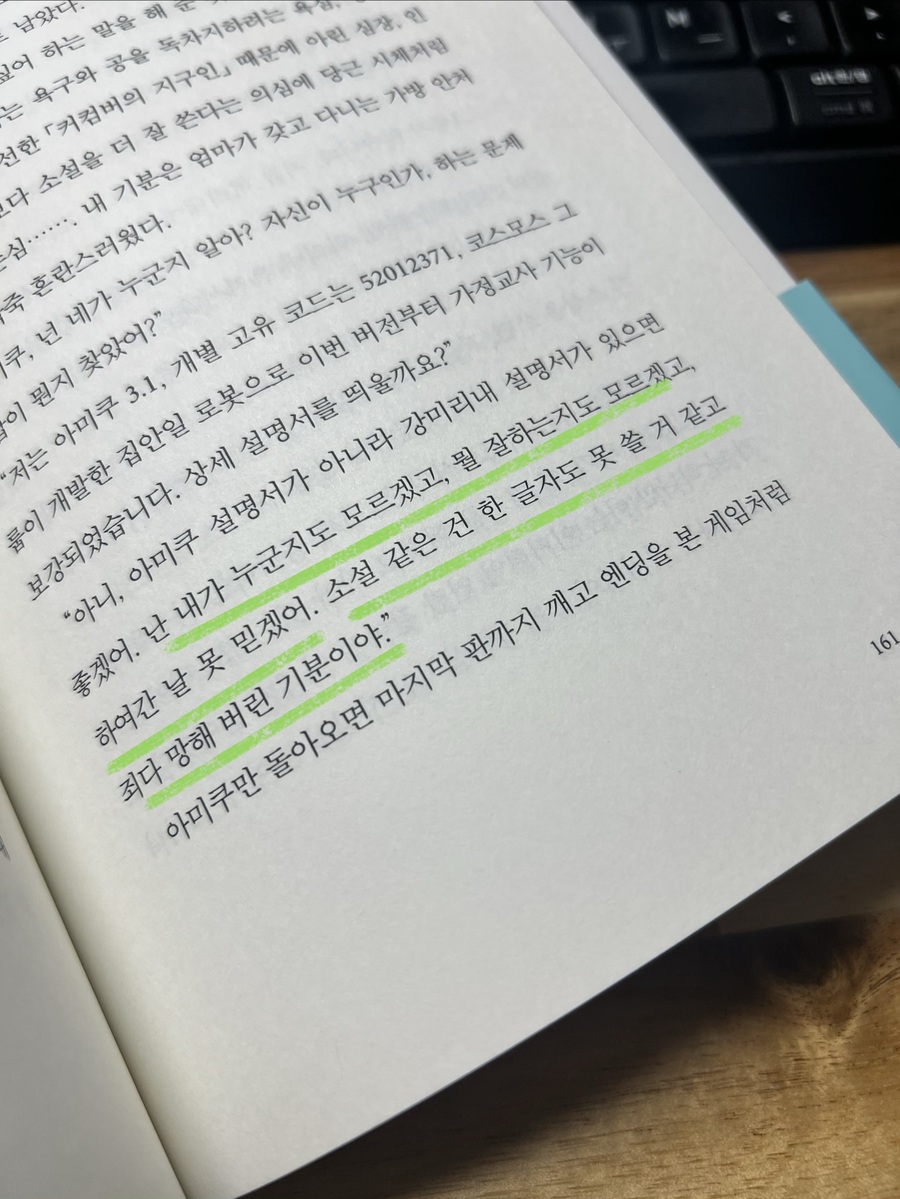 <출판사로부터 도서를 제공받아 주관적으로 작성한 리뷰입니다> 중학생 미리내는 닉네임 ‘도로시’로 남몰래 소설을 연재한다. 하지만 조회수는 한 자리. 엄마는 사회적 위치만 중요하게 여기고, 미리내의 꿈에 귀 기울이지 않는다. 아빠는 AI에 일자리를 빼앗겨 타지에서 일하며 따로 살아간다. 외롭고 정서적 교류가 부족한 일상. 그러던 어느 날, 집안일 로봇 아미쿠가 들어왔다. 청소는 서툴지만 미리내의 글을 읽고 진심으로 반응해준 첫 존재였다. "날개가 새만의 자랑거리가 아니듯 마음도 사람만의 것이 아닙니다. 미리내는 마음이 어디에서 비롯된다고 생각하십니까?" (P.44) 아미쿠의 조언으로 글을 고치자 조회수는 폭등했다. 하지만 ‘AI 출처’가 붙는 사고가 일어났고, 악플이 쏟아졌다. "소설을 쓰고 고치고 또 고치고 또또또 고친 사람은 나, 도로시란 말이다." (P.59) 그 과정에서 미리내는 인간관계와 사회의 잔혹함을 체감하기도 한다. "왜 인간은 이토록 잔인할까, 어리석을까, 졸렬하고 남 잘되는 꼴을 못 보고 비겁하고 더운 날의 우유보다 더 쉽게 변질될까." (P.106) 그럼에도 미리내는 포기하지 않았다. 생각해 보면, 우리도 이미 휴대폰 속 ‘아미쿠’와 매일 대화하며 살고 있다. 명령도, 창작도 결국 사람의 몫. AI는 도구일 뿐. "도움을 주고받는 것이야말로 관계의 본질입니다." (P.158) 선생님에게, 친구에게, 때로는 AI에게. 조언을 받아 성장하는 것. 꿈을 포기하지 않고 도움을 받아 더 나은 방향으로 나아가는 용기. 이 시대에 사라져 가는 것들과 불안감, 그리고 계속해서 함께 풀어가야 할 윤리 속에서도 새로운 희망을 발견하게 되는 이야기였다. #우리는지금소설모드 #하유지 #현대문학 #우정 #AI #로봇 #글쓰기 #인공지능 #성장소설 #청소년소설추천 #AI창작 |