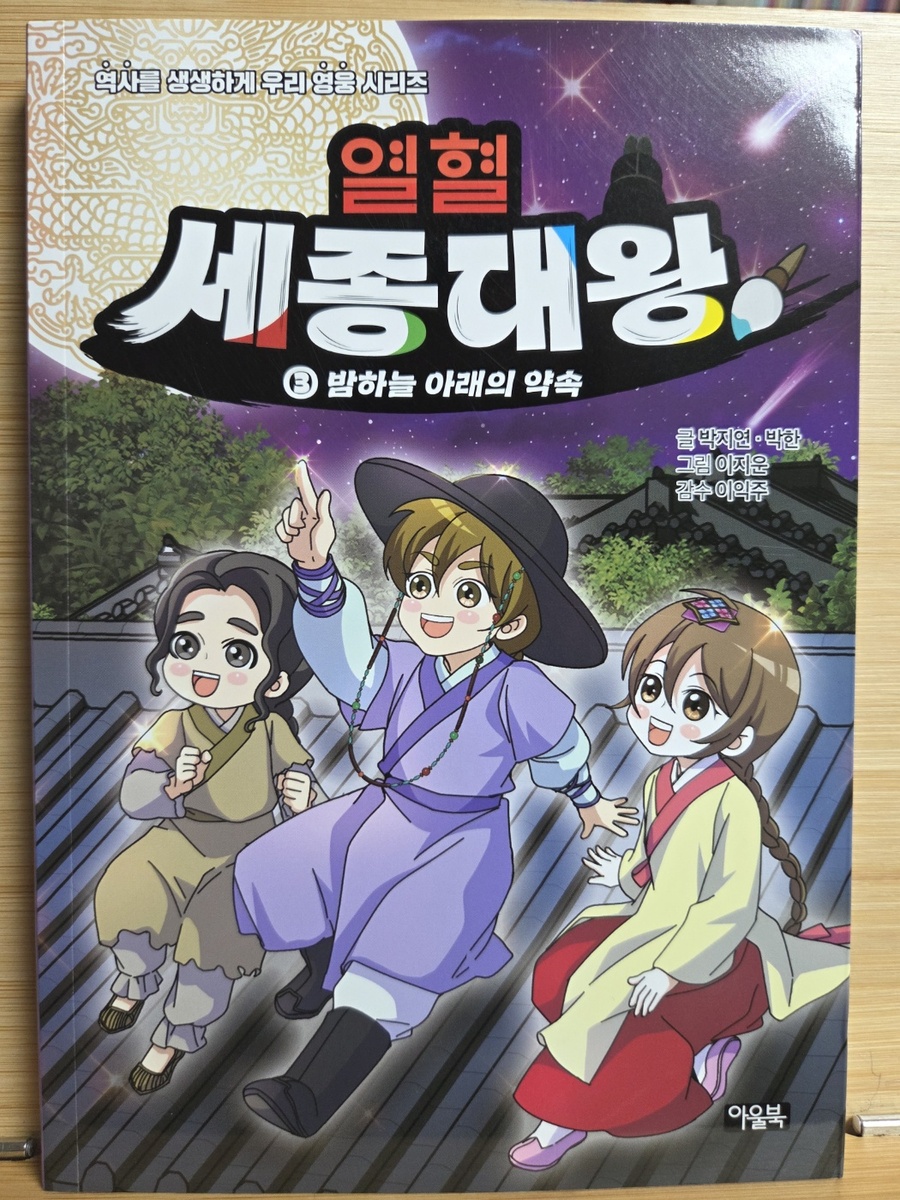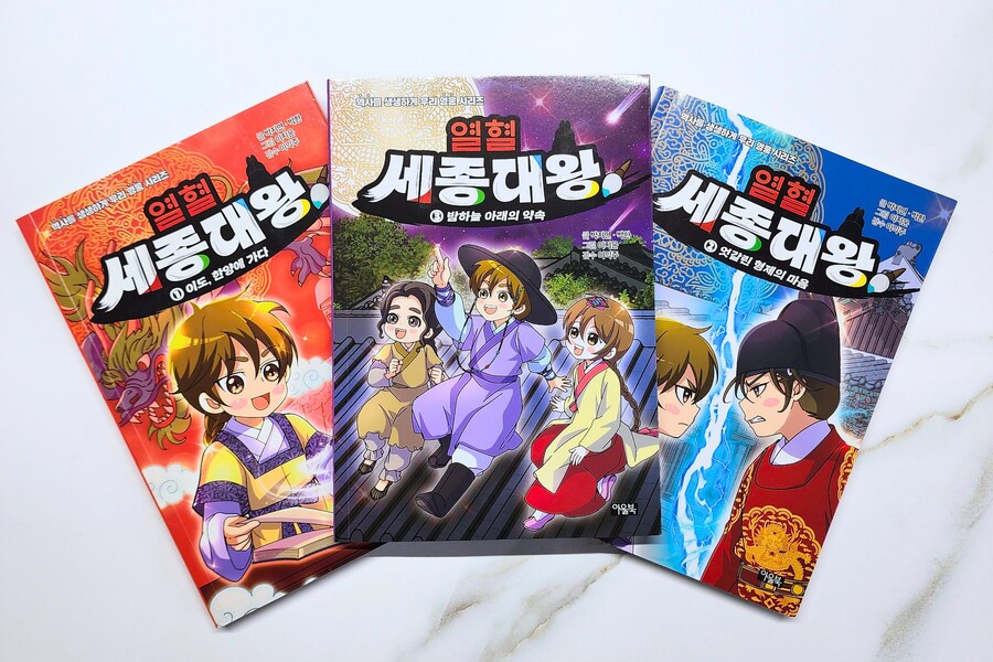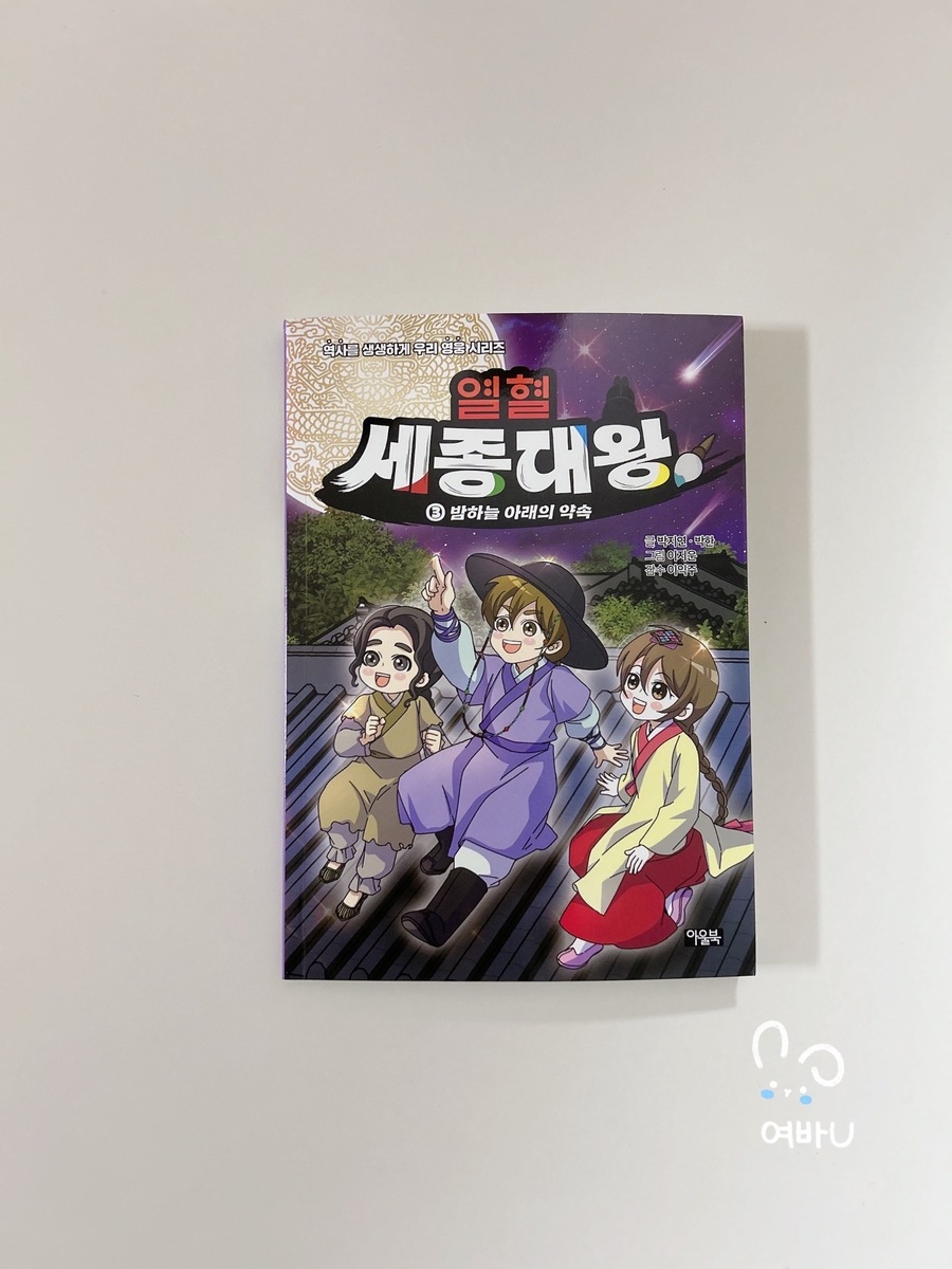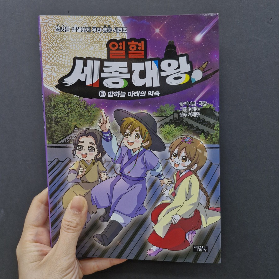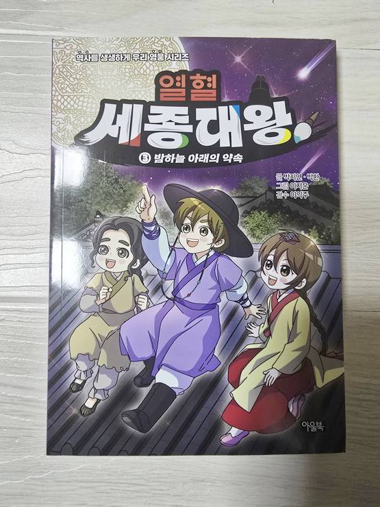 다가올 한글날에 읽으면 좋을 도서 [열혈 세종대왕] [열혈 세종대왕]은 세종대왕의 어린 시절 이야기를 역사에 근거한 가상의 에피소드를 섞어 만화로 그렸어요. 열혈 세종대왕 세번째 이야기 조금만 만나볼까요? 지붕 위에서 밤하늘의 별빛을 바라보며 밤새 이야기를 나눈 충녕대군과 노비 막손이, 그리고 인선! 친구가 되기로 한 세 사람의 우정은 더욱 단단해지고, 이를 못마땅히 여긴 세자는 소원을 건 배 경주를 충녕대군에게 제안하게 되요. 그러나 막상 세자는 배 경주에 지게 되고, 충녕대군을 더욱 미워하게 되는데..(뒷 내용은 책속에서 만나보세요) 한국인이 가장 존경하는 위인 세종대왕의 일대기를 만화로 만나보는 [열혈 세종대왕] 역사 심화 학습 코너인 역사 익힘책을 통해 세종대왕과 얽힌 역사 속 사건들을 더 깊고 흥미롭게 배울 수 있고 역사 속의 진실 혹은 거짓은 만화에서 나오는 내용 상상을 더한 창작 부분과 실제 역사적 사실을 구별하여 역사를 더 바르게 익힐 수 있어요. 마지막 부분에는 세종대왕 연표를 담아, 세종대왕 일대기의 큰 흐름을 한눈에 볼 수 있답니다. 한글을 창제한 조선 최고의 왕 세종대왕의 특별한 어린 시절 이야기! 4권도 빨리 만나보고 싶네요!!