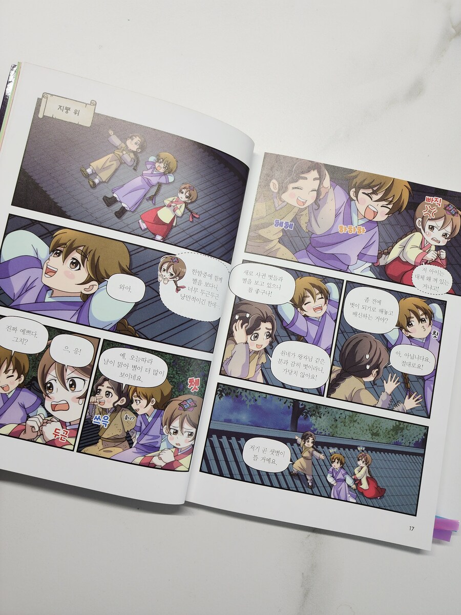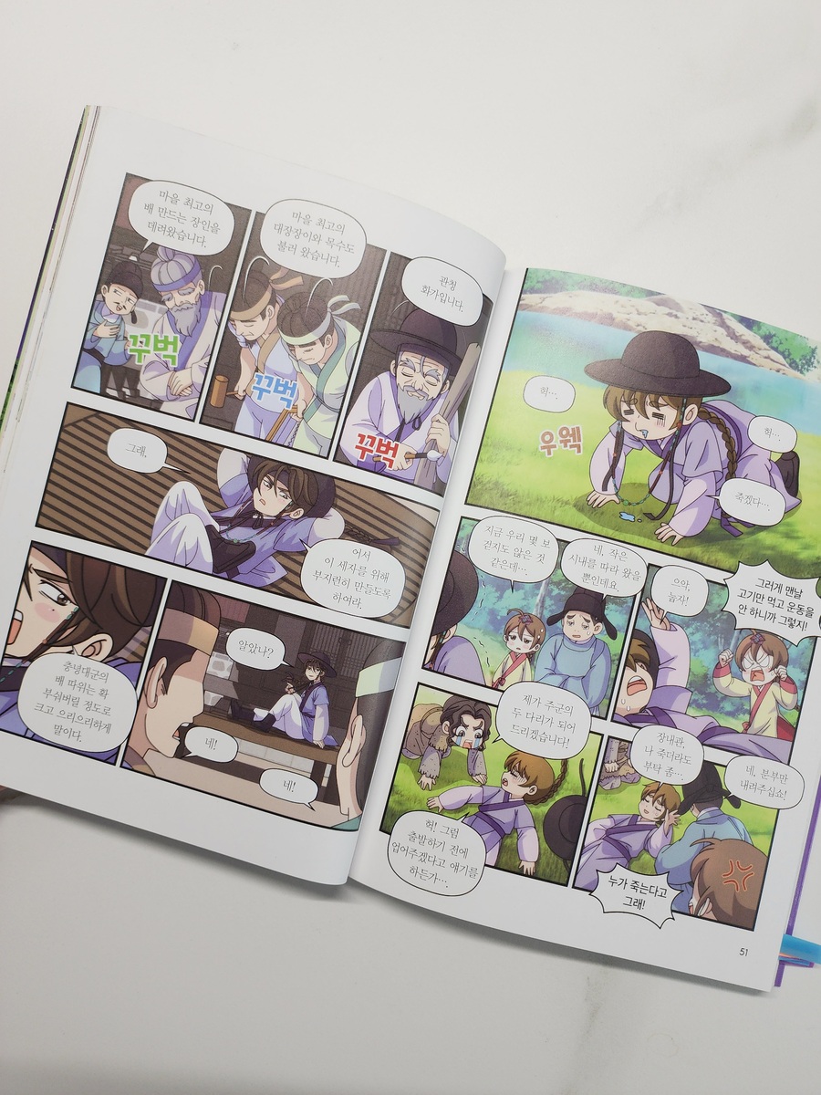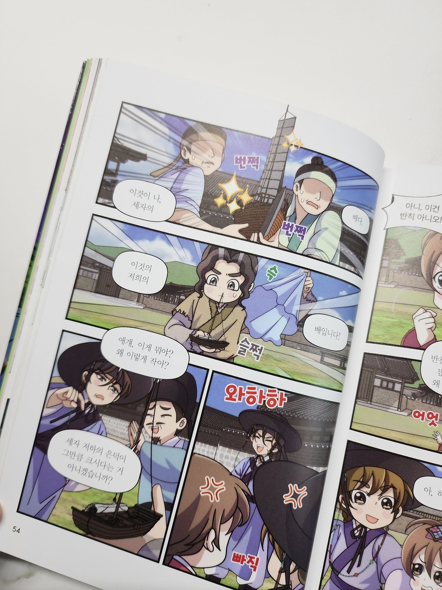 다가올 한글날에 읽으면 좋을 도서 [열혈 세종대왕] [열혈 세종대왕]은 세종대왕의 어린 시절 이야기를 역사에 근거한 가상의 에피소드를 섞어 만화로 그렸어요. 열혈 세종대왕 세번째 이야기 조금만 만나볼까요? 지붕 위에서 밤하늘의 별빛을 바라보며 밤새 이야기를 나눈 충녕대군과 노비 막손이, 그리고 인선! 친구가 되기로 한 세 사람의 우정은 더욱 단단해지고, 이를 못마땅히 여긴 세자는 소원을 건 배 경주를 충녕대군에게 제안하게 되요. 그러나 막상 세자는 배 경주에 지게 되고, 충녕대군을 더욱 미워하게 되는데..(뒷 내용은 책속에서 만나보세요) 한국인이 가장 존경하는 위인 세종대왕의 일대기를 만화로 만나보는 [열혈 세종대왕] 역사 심화 학습 코너인 역사 익힘책을 통해 세종대왕과 얽힌 역사 속 사건들을 더 깊고 흥미롭게 배울 수 있고 역사 속의 진실 혹은 거짓은 만화에서 나오는 내용 상상을 더한 창작 부분과 실제 역사적 사실을 구별하여 역사를 더 바르게 익힐 수 있어요. 마지막 부분에는 세종대왕 연표를 담아, 세종대왕 일대기의 큰 흐름을 한눈에 볼 수 있답니다. 한글을 창제한 조선 최고의 왕 세종대왕의 특별한 어린 시절 이야기! 4권도 빨리 만나보고 싶네요!!