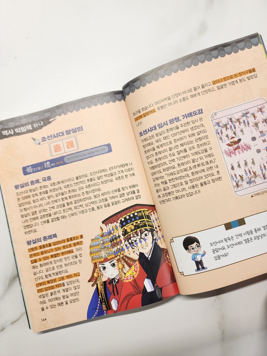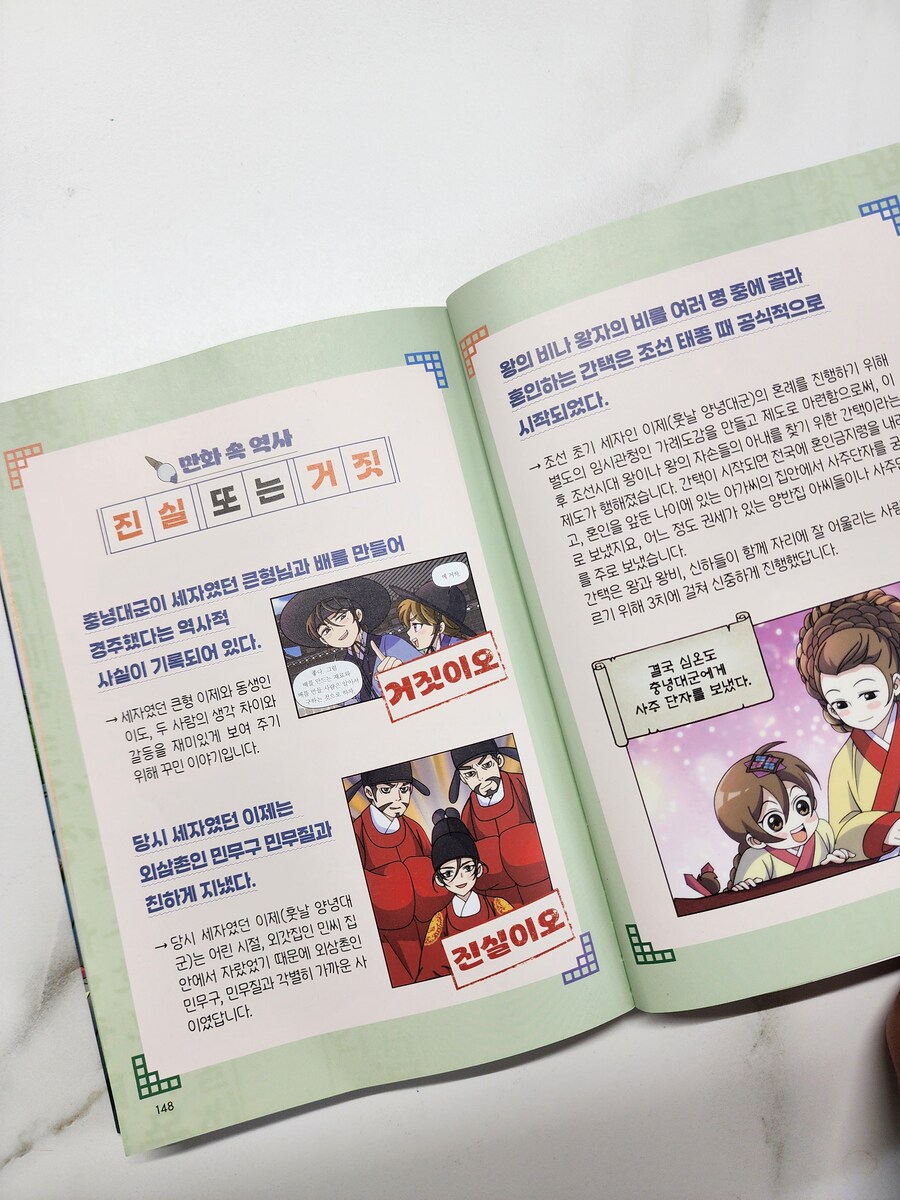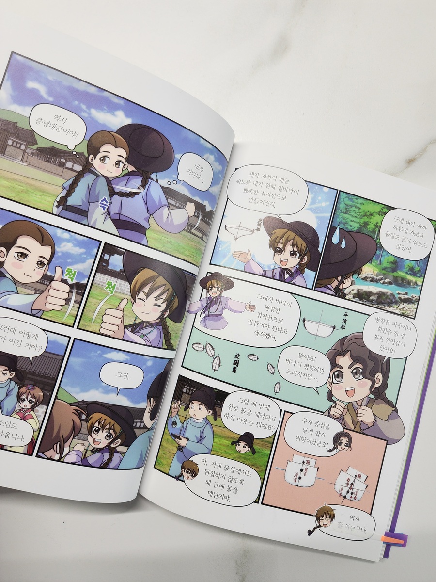 <도서협찬> 곧 10월, 한글의 달이 찾아와요. 10월 9일 부터 10월 18일까지 문화체육관광부가 지정한 ‘한글 한마당’ 기간 인거 알고 계셨나요? 세계인의 함께 참여하는 문화축제가 된 한글날을 앞두고 <열혈 세종대왕 3>을 읽을 수 있어 더 뜻깊었어요. 이번 3권에서는 세자와의 갈등 속에서 충녕대군의 마음이 한층 단단해지고, 진짜 벗의 의미를 깨닫는 모습이 담겨 있어요. 배 경주 장면에서는 지시만 하는 세자와 달리 직접 지형을 살피고 손자병법에서 본 내용을 활용하는 충녕의 모습이 특히 인상 깊었고 외삼촌들의 귀양 사건에서는 국문과 역모 같은 역사적 배경을, 세자의 혼례 이야기를 통해서는 왕실의 혼례 절차와 당시 관례까지 알 수 있었어요. 재미와 학습을 함께 잡은 믿음직한 역사 영웅 만화! 책 말미 <역사 익힘책>에서는 관련 사건과 인물을 깊이 다뤄 배경 지식까지 탄탄히 쌓을 수 있고, <진실 혹은 거짓> 코너에서는 만화 속 상상과 실제 역사를 구분해주어 아이들이 역사적 사실을 제대로 잡아갈 수 있었어요. 또, <세종대왕 연표>는 큰 흐름을 한눈에 정리해주어 역사적 이해를 도와주었어요. 단순한 영웅담이 아니라, 책을 사랑하고 벗을 소중히 여기는 충녕의 마음이 한 사람의 성장 과정처럼 그려져서 더 좋은 열혈 세종대왕 시리즈. 역사 공부를 시작하는 아이들에게도, 이미 세종대왕을 잘 알고 있는 아이들도 분명 즐겁게 읽힐 거에요. |