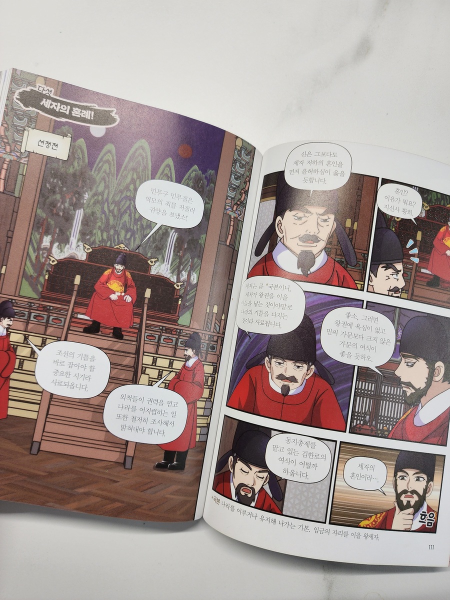 #북리뷰 #도서협찬 ⠀ | 열혈 세종대왕 3 | 박지연, 박한 글 / 이지운 그림 / 이익주 감수 | 아울북 ⠀ ⠀ 📌열혈 세종대왕 3. 밤하늘 아래의 약속 ⠀ 밤하늘의 별을 함께 보며 특별한 벗이 된 충녕대군, 인선, 막손. 그와 달리 여전히 티격태격인 세자와 충녕대군. 급기야 배를 만들어 시합을 해 이기는 자의 소원을 들어주기로 내기를 하는데.. 크고 멋드러진 세자의 배는 하류 물살에 부서지고 만다. 충녕대군은 노비친구를 궁에 데려와 달라고 하지만 세자는 차일피일 미루기만 한다. ⠀ 세자의 혼례에 이어 왕자들의 혼인을 명하는 태종 인선은 충녕대군의 비가 되기 위해 사주단자를 보낸다. (다음 편엔 세종대왕의 혼인 장면이 나오겠군요.) ⠀ ⠀ 🍀 3권의 세종대왕의 12세 이야기를 담았는데요. 배를 만들어 내기를 했다는 이야기는 세자와의 갈등을 재미있게 꾸민 이야기라고 해요.^^ ⠀ 이번 편에는 세종이 신분에 구애받지 않고 인선과 막손과 더 깊은 우정을 나누는 모습에 아이들이 인상적인 장면으로 꼽았어요. ⠀ 조선시대의 혼례의 모습도 볼 수 있었고 세종의 아버지 태종과 외척세력 간의 갈등, 그리고 세자와의 갈등도 엿볼 수 있었어요. 아직 어린 세종의 모습은 귀엽기만 한데 혼인을 한다네요😂 ⠀ ⠀ 곧 한글날인데요. 위대한 세종대왕의 일대기를 이렇게 재미있는 만화로 만나볼 수 있어 아이들도 저도 너무나 행복하네요. ⠀ ⠀ 어른도 아이도 모두 재미있게 읽을 수 있는 열혈 세종대왕, 한글날을 맞이 추천드려 봅니다. ⠀ ⠀ ⠀ *우리영웅서포터즈의 자격으로 아울북(@owlbook21 )출판사로부터 도서를 제공받아 읽고 작성하였습니다. 감사합니다. ⠀ ⠀ #열혈세종대왕3 #박지연 #박한 #이지운그림 #이익주감수 #열혈세종대왕 #우리영웅서포터즈 #아울북 #서평2025_182 |