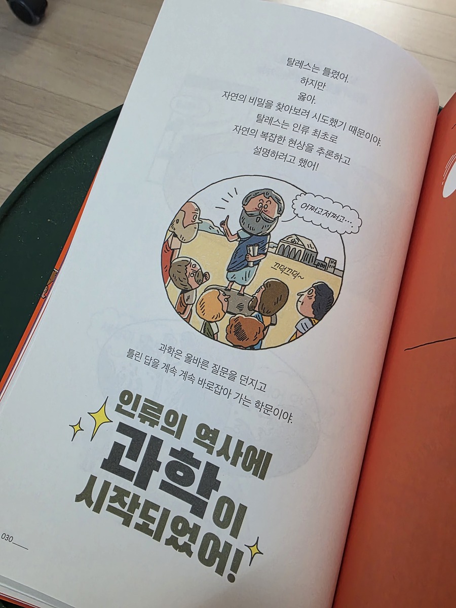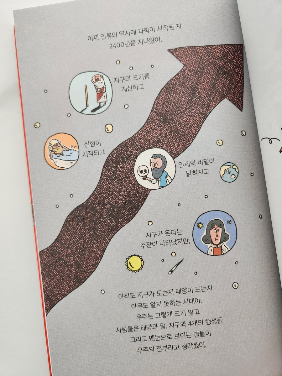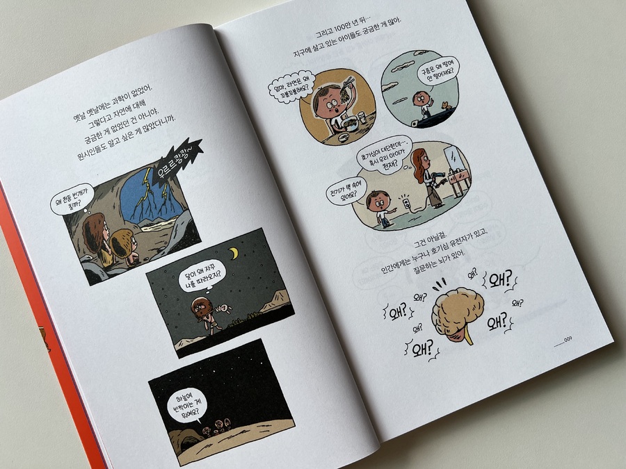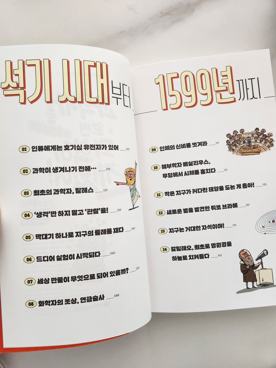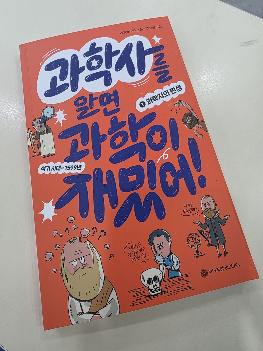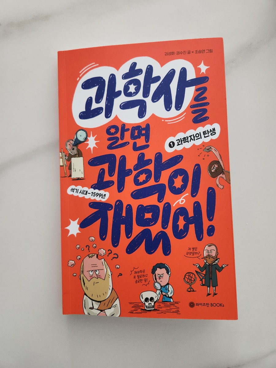 과학사를 쉽고 재미있게 이야기로 풀어서 과학에 대해 호기심을 가질 수 있게 만드는 책을 만났습니다. < 과학사를 알면 과학이 재밌어! 1. 과학자의 탄생 > 글 김성화, 권수진 / 그림 조승연 / 와이브만북스 어린이 과학 필독서인 '미래가 온다'의 저자의 새로운 신간이라고 하니 읽어보기도 전에 어떤 내용이 들어있을지 궁금해지더라고요. 원시인 시절부터 돌아보는 호기심의 역사! 이 책은 '과학자의 탄생'에 대한 이야기를 담고 있습니다. 인류의 호기심에서 출발해서 고대, 중세를 거쳐 르네상스의 과학 혁명 직전까지의 이야기를 담고 있어요. 석기시대부터 1599년까지 출현했던 과학자들을 중심으로 과학의 시대상과 발전 과정 그리고 위대한 과학자의 출현과 과학의 발전이 인류에 미친 영향을 살펴볼 수 있어요. 이름 없는 원시인이 돌을 내리쳐서 도구를 만들기 시작하고 불을 발견하고 시간이 지나 도시가 생겨나고, 최초의 과학자 탈레스, 지구 둘레를 잰 에라토스테네스, 하늘을 향한 갈릴레오의 망원경까지, 위대한 발견의 순간들을 재미있는 그림과 함께 이야기가 펼쳐져서 시간 가는 줄 모르고 읽어나갈 수 있어요. 아이가 그림을 보면서 글을 읽으니 더 기억에 오래 남는다고 이야기하더라고요. 과학사 속 인물들이 무엇을 궁금해했고, 그 궁금증을 어떻게 풀었는지를 따라가다 보면서 아이들도 스스로 질문, 관찰하고 실험하는 즐거움 속에서 과학에 대한 호기심이 생기게 될 것 같아요. 올바른 질문을 던지고 틀린 답은 계속 바로잡아 가는 것이 과학이라고 말하는 것이 인상 깊었습니다. 2편에서는 '실험과 증명'으로 갈릴레오의 관성, 공기, 뉴턴의 중력 등 다양한 주제를 흥미롭게 풀어냈다고 합니다. 5편까지 발간될 예정이라고 하니 벌써부터 기대가 됩니다. <과학사를 알면 과학이 재밌어! 1. 과학자의 탄생 >은 책 제목처럼 과학 이야기를 흥미롭게 풀어내서 초등학생 아이들이 재미있게 볼 수 있을 것 같아요. #와이즈만북스 #도서협찬 #과학사를알면과학이재밌어 #과학자의탄생 #과학사 #초등과학 #과학도서 [ 출판사로부터 도서를 제공받아 주관적으로 읽고 작성했습니다 ]