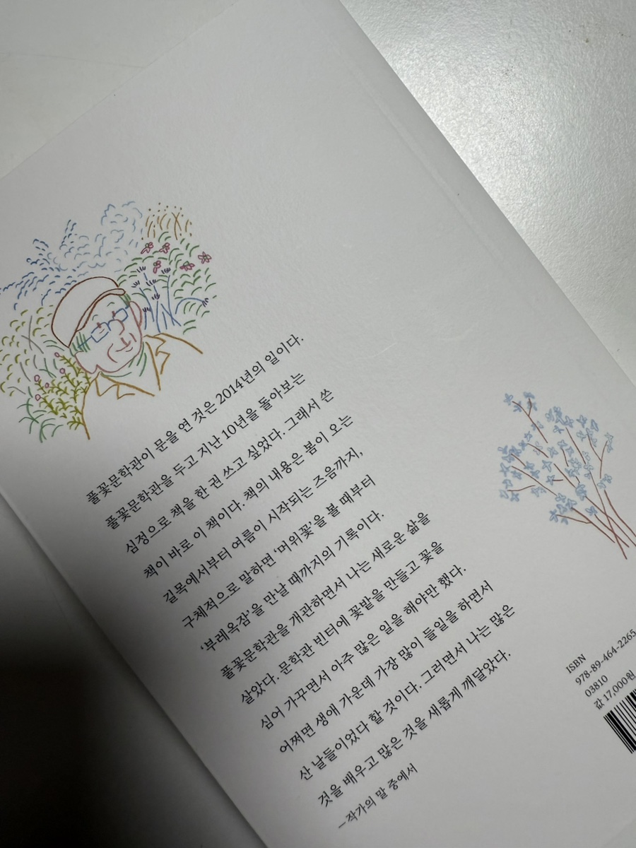 책 속에 담긴 내용은 풀꽃문학관 주변에 난 들꽃들을 삶과 연결시킨 에피소드들로 시인의 풀꽃향기 나는 소소한 일상이 담겨있다. 누구나 한번쯤은 꿈꿔봤을 노년의 삶에 여러가지 버젼이 있겠지만 딱 내가 지향하는 삶이었기에 소소한 일상이 너무도 정겹게 다가왔고 나도 시인의 나이쯤 되면 저런 마음가짐으로 일상의 모든 것을 품으며서 살 수 있을까하는 기대도 생겼다. 매 장마다 들꽃의 이름으로 시작되는데 이름만 들어본 꽃들이 많아 검색을 하면서 읽었는데 의외로 산책길에 이쁘다고 지나친 꽃들이었다. 덕분에 새로이 이름을 알게 된 녀석들이 은근히 많아졌다.