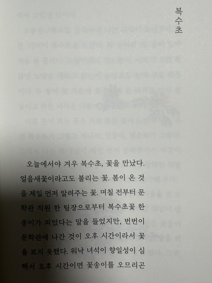 아직은 봄이 오지 않았지만, 이 책을 읽으며 더디게 오기는 하지만, 다시 오게 될 봄을 나도 모르게 기다리게 된다. 시인의 말처럼 봄은 기다리는 사람에게 오는 게 봄인지도 모른다. 이 글을 읽으니 봄이 되면 문학관에 봄소식을 전해주는 꽃들이 너무 보고싶다.