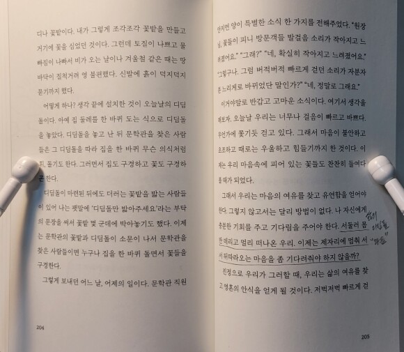 이제는 우리 마음 속에 피어 있는 꽃들도 찬찬히 들여다볼 때가 되었다. 그래서 우리는 마음의 여유를 찾고 유연함을 얻어야 한다. 나 자신에게 충분한 기회를 주고 기다림을 주어야 한다. 서둘러 몸만 데리고 멀리 떠나온 우리. 이제는 제자리에 멈춰 서서 뒤따라오는 마음을 좀 기다려줘야 하지 않을까? 진정으로 우리가 그러할 때, 우리는 삶의 여유를 찾고 영혼의 안식을 얻게 될 것이다. 저벅저벅 빠르게 걷는 걸음을 자박자박 느리게 걷는 걸음으로 바꾸자. 둘레둘레 고개 돌려 여기저기 피어 있는 곷들을 바라보는 어린아이의 천진 그것으로 돌아가자. 그러할 때 우리는 진정 좋아지는 사람들이 될 것이다. -p. 205-206