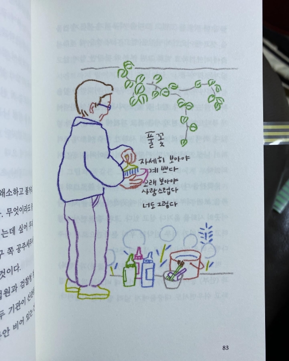 #오늘의책 #2024년4월책 ![]() ♡꽃내음 그윽한 풀꽃문학관 편지♡ 이제 풀꽃을 떠올리면 나태주시인님이 자연스레 떠오른다. 풀꽃시인의 풀꽃문학관에서 편지가 도착했다. #꽃이사람이다 #나태주 #샘터 ![]() 나태주 시인님의 풀꽃문학관은 공주에 유일하게 남아있는 적산가옥으로 개관한지 10년이 지났다고 한다. 올해 새로운 문학관이 개관할 예정인데 그 전에 지금의 풀꽃문학관에 관한 책을 쓰고 싶으셨다는 시인. 시인의 풀꽃문학관 마당에서 피어난 수많은 풀꽃과 나무의 이야기가 아름답다. 꽃이나 나무에 관심은 있지만 많이 알지는 못했는데 아는 꽃이 나올 땐 반갑고 새로운 꽃을 만날 땐 두근거렸다. 봄의 시작인 머위꽃부터 여름이 시작되는 길목에 부레옥잠까지 풀꽃문학관의 봄과 여름을 함께 보낸 기분이다. 초록의 풀꽃문학관에서 시인님과 함께 마당을 쓸고 꽃을 바라보고 물을 주고 가꾸면서, 그렇게 한 계절, 한 계절을 보내는 마음으로 읽었다. 다정하고 따뜻한 시선의 시인님의 문장들에 덩달아 마음이 따뜻해졌다. “문제는 마음이다. 몸이 아무리 열악해지고 아프기까지 해도 마음으로 행복하고 편안하다고 생각하면 그렇게 되는 것이다. 그야말로 꽃이 주는 선물이고 긍정의 마음이 주는 축복이다. 비록 여러 가지로 번잡하게 힘들게 살아가더라도 나에게 이렇게 날마다 자전거를 타고 지나가는 골목길이 있고 그 골목길에서 만나는 정다운 이웃 한 사람이 있다는 건 더없이 고맙고 다행스러운 일이다.” p.220 꽃을 좋아하고 보러다닌지 10년정도 된 것 같다. 힘들고 지쳤을 땐 더 많이 봤다. 키우지는 못해도 보는 건 늘 위로가 됐다. 꽃은, 나무는, 풀은, 숲은 언제나 변하지 않으니까. 나를 미워하지도 공격하지도 비난하지도 않으니까. 그렇게 자연이 주는 치유의 힘으로 버티며 살았다. 사람때문에 힘들고 지치기도 했지만 사람때문에 힘을 얻기도 했다. 혼자서 보는 꽃도 좋았지만 함께여서 더 아름다웠던 꽃도 많았다. 시인님의 말대로 문제는 마음이다. 꽃을 보듯 너를 본다는 시인님의 다른 책 제목처럼, 꽃처럼 당신을 보고 싶다. 꽃이 사람이다,라고 말할 수 있으면 좋겠다. 꽃같은 당신을 만나 내가 이렇게 행복하다고 말하고 싶다. 해마다 봄은 쉽게 오지 않는다. 멀리서 망설이면서 더디게 더디게 온다. 발자국 소리만 들려준다든가 숨소리만을 미세하게 들려주다가 어느 날 벼락 치듯 달려온다. p.17 ★추천합니다★ 더디게 오더니 어찌 이리 빨리 가버리려는 건지. 봄이 아쉬운 지금, 시인의 아름다운 책과 함께 봄기운을 다시 한 번 느껴보길 바란다. ![]() ![]() ![]() ** 책 속 시인님 그림이 너무 귀여워요? 색연필느낌의 그림들이 귀엽고 예뻐서 더더 좋았습니다. 시인님이 직접 찍은 사진들도 보고 싶었지만 어쩐지 풀꽃문학관에서 보내온 편지의 느낌에는 그림이 잘 어울린다는 생각이 들었어요. 몇 년전 보았던 풀꽃문학관이 그리워지는 시간이었습니다. 그림 #김파카 @kimpaca ![]() ![]() 몇 년전 방문했던 풀꽃문학관 ↑ 벽에 시화와 여름의 능소화가 참 아름다웠다. 오래오래 보고 싶다. #하리의생각조각 _ 읽고 필사하고 생각조각을 모으는 시간들 ♥출판사로부터 책을 제공받았습니다♥ #도서협찬 감사합니다 #필사모임 #주간심송 에서 진행하는 #주간심송챌린지 #주간심송필사챌린지 매일 읽고 매일 씁니다. 문장을 수집하고 밑줄을 긋고 만년필로 필사합니다 생각조각을 모아 글을 씁니다. #만년필필사 #매일필사 #필사하리 #하리그라피 #하리의서재 #하리캘리 #하리독서노트 #오늘필사 #독서기록 |