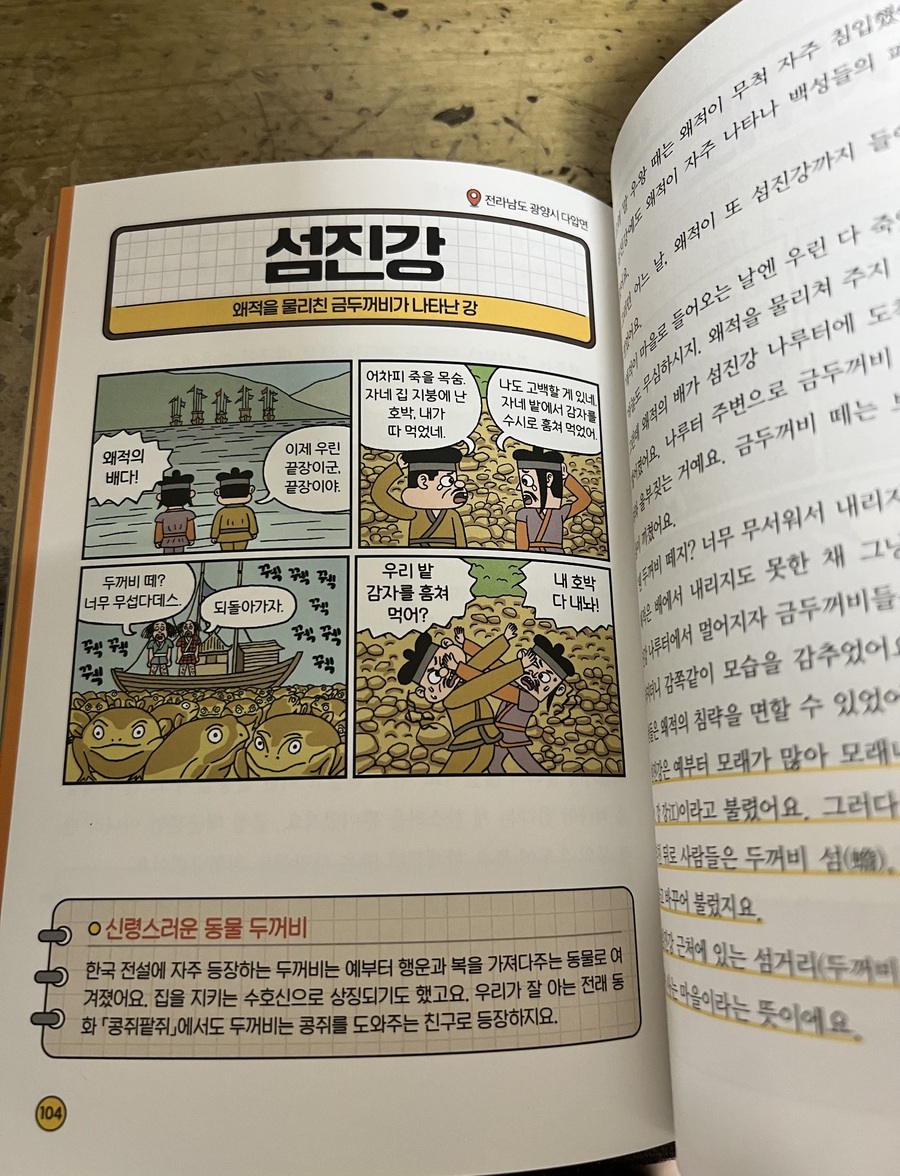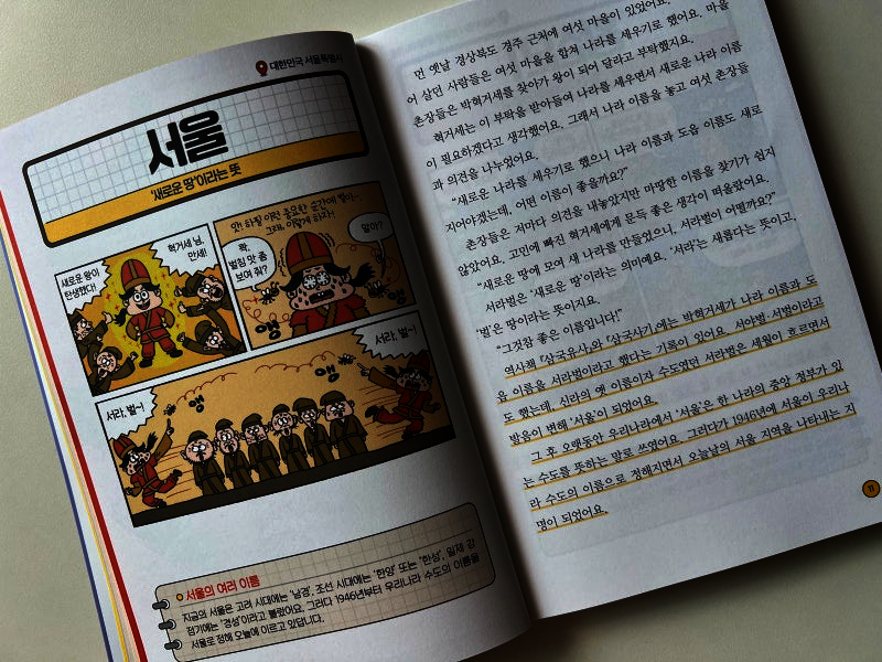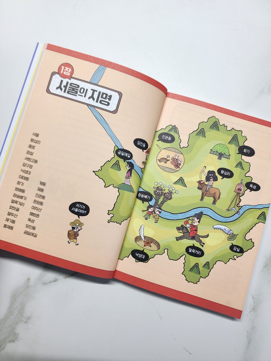 아이가 크면서 놀러다니는 경우가 많은데 그럴때마다 엄마 여기는 왜 ××야? 그건 무슨뜻이야? 이런 질문을 받는 일이 많은데요 ~ 그럴때마다 지명에 대한 책을 읽으면 좋겠다라고 생각했는데 "그래서 이런 지명이 생겼대요 " 는 그런 궁금증을 해소 할 수 있는 책으로 안성맞춤이었어요 ~~ ㅎ 제가 지방에서 처음 올라왔을때 뚝섬을 알게되었는데 뚝섬이 섬인줄 알았다는 ^^;; 덕분에 저도 아이와 같이 공부 할 수있는 좋은 시간이 되었어요 ㅎ 왼쪽 페이지마다 등장하는 네컷만화에는 등장인물들의 익살그럼 표정과 대사가 책의 분위기를 부드럽게 만들어주었구요 오른쪽페이지에는 실제 역사나 전해 내려오는 설화를 어린이 눈높이에 맞춰 각색해 설명해줘서 아이가 쉽게 술술 읽어내려갈수 있게 도와줍니다. 그리도 깨알 요점도 잘 정리되어있어 이야기책을 읽는듯 하면서도 꼭 기억해야 할 초등사회교과 내용은 쏙쏙 담았죠 사회과목이 처음이라 교과서를 어려워하는 초등 3~4학년 아이들에게 딱 맞는 구성이라 생각됩니당 ~ 교과서만으로는 부족한 흥미와 이해를 채워줄 좋은 어린이책 추천도서 "그래서 이런 지명이 생겼대요 " 로 사회공부의 문을 열어도 좋을것 같네요 !! 적극 추천합니당 #어린이베스트도서 #사회추천도서 #그래서이런지명이생겼대요 #초등사회교과 #길벗스쿨출판