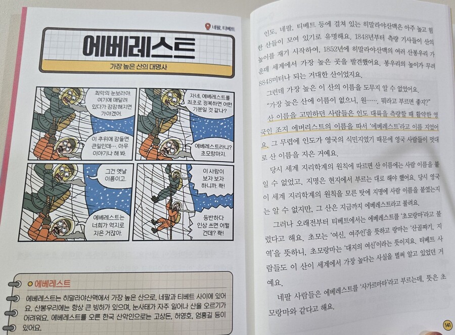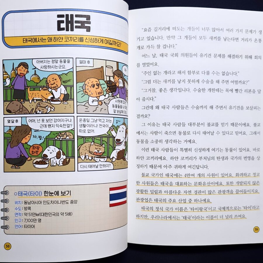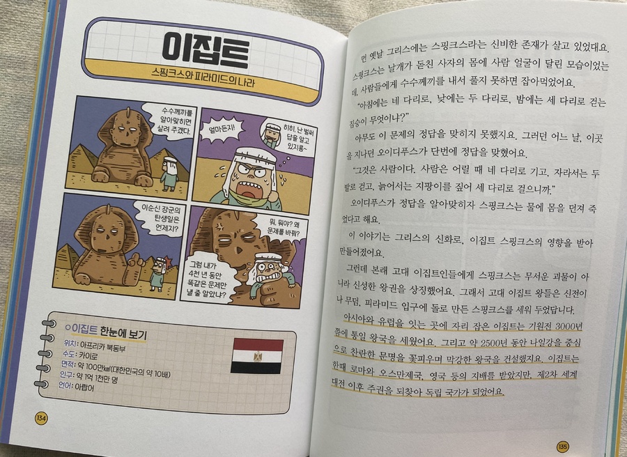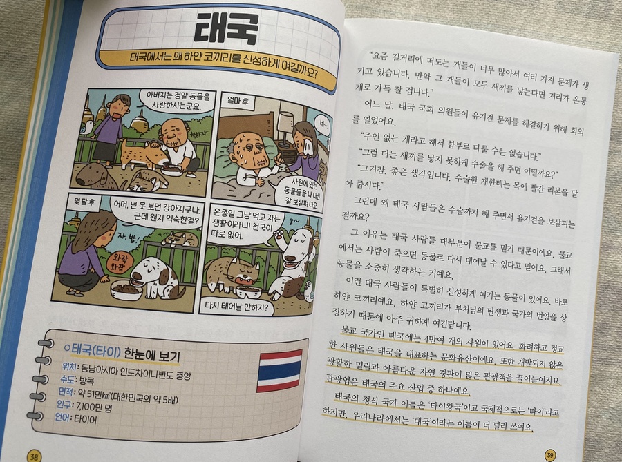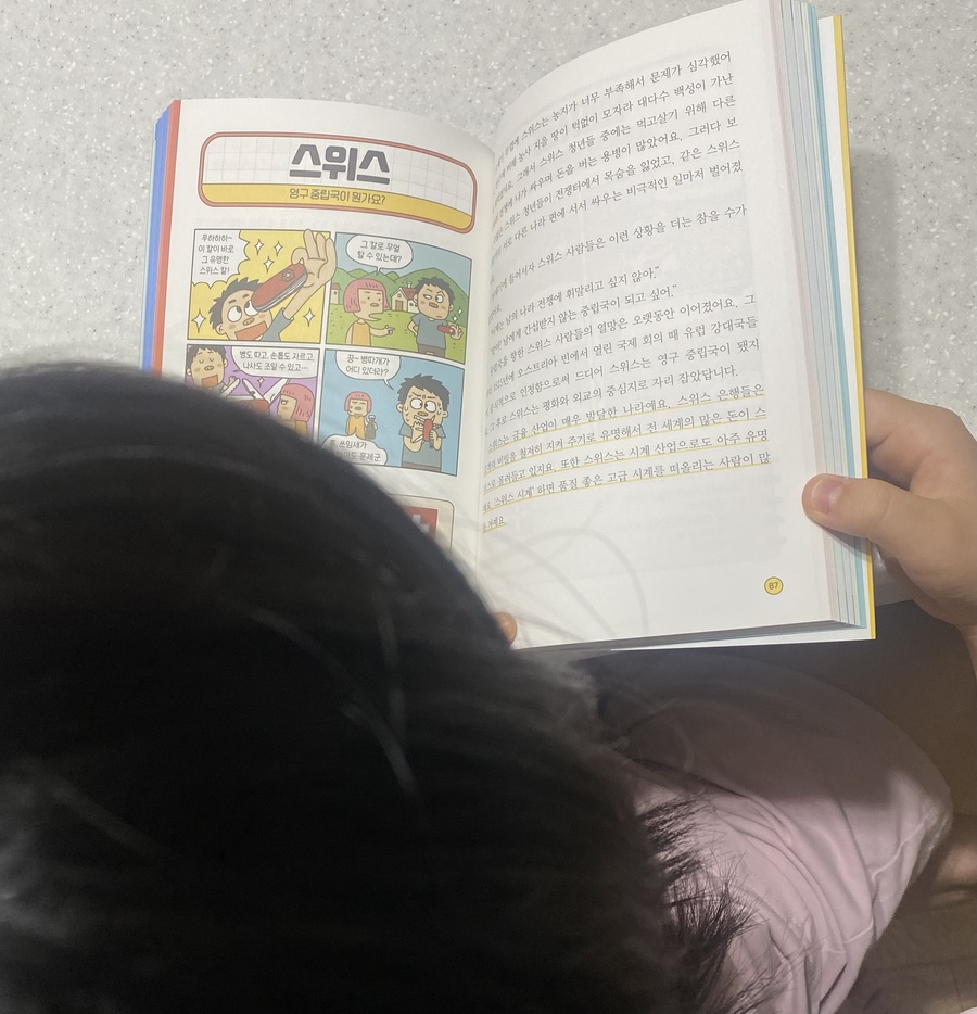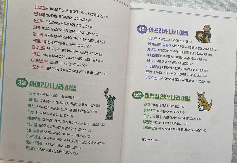 이 책에는 대한민국, 독일, 이스라엘처럼 전쟁과 분단·독립을 겪은 나라들, 이집트의 피라미드나 네팔의 살아 있는 신, 프랑스의 에펠탑처럼 독특한 문화를 지닌 나라들, 그리고 대만·홍콩·아프가니스탄처럼 국제 뉴스에 자주 오르는 나라들의 이야기도 담겨 있어요. 여기에 뉴질랜드처럼 맹수가 없는 자연환경이나 파푸아뉴기니의 부족 문화처럼 특별한 자연과 전통까지, 다양한 이야기가 나와서 새로운 사실을 알게 되며 흥미롭게 읽을 수 있었어요.
