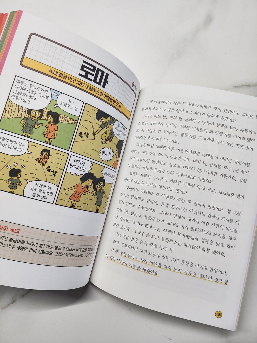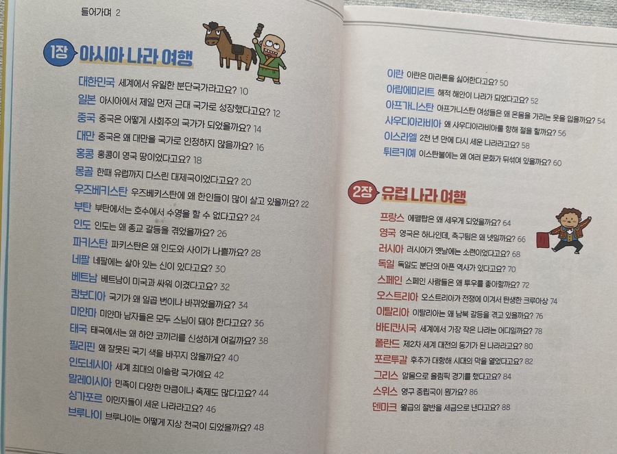 그래서 이런 나라가 생겼대요 요즘 아이가 가장 많이 보는 책! 그래서 이런 00가 생겼대요 시리즈! 학교에서도 다른나라에 대해 관심을 갖을수 있도록 가정내에서도 지도를 해달라는 안내가 있었는데, 이번에 나온 '나라' 신간이 너무 반갑다!! 1장 아시아 2장 유럽 3장 아메리카 4장 아프리카 5장 태평양 연안 무려 72개국에 대한 소개. 어려서 노출해준 기 카드와, 국기 깃발 꼽기 보드 게임. 브루마블 다 필요없다! 이책 한권이 더 효과적이다 인구 밀도, 자원, 역사, 크기, 특기 등 짧지만 그 나라의 가장 대표적인 특징을 잘 설명해주고 있다. 재미있는 4컷만화로 1회독하고 2회독때는 내용도 읽어주기. 심심할때 마다 쇼파에 누워서 꺼내읽는 이유가 다 있겠지. 옆에서 함께 읽고 있으니 '어린이 책인데 왜 엄마가 읽어요?' 한마디 한다.. (내가 읽고 있던건 '지명' 편, ^^;; 사실 나도 처음 듣는 이야기가 많단다...) 독후 활동지로 메타인지도 확인해 보기~ *출판사로 부터 도서를 제공받았습니다. #그래서이런나라가생겼대요 #길벗스쿨 #어린이책 #사회상식 #어린이사회상식 #그래서이런시리즈 #그래서이런 #어린이사회 #책육아 #초등책 #초등책추천 #어린이책 #어린이책추천 #책추천 #서평 #어린이교양책 |