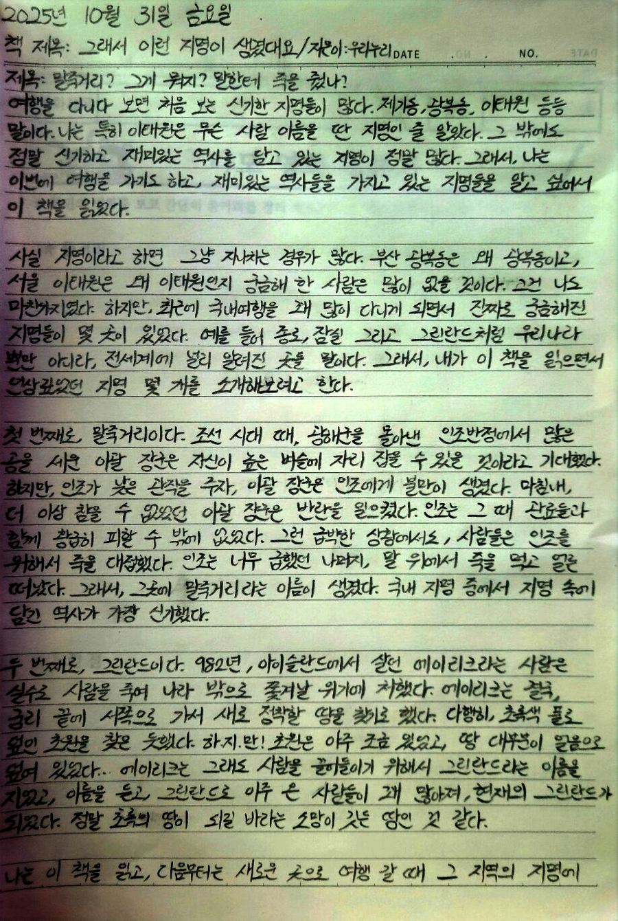 📚 [도서협찬] 지명에도 이야기가 숨어 있다면? 서울은 ‘새로운 땅’, 해운대는 ‘최치원의 어릴 적 이름’, 말죽거리는 ‘임금이 죽을 얻어먹은 곳’, 그리고 필리핀은 ‘스페인 황태자의 이름’에서 비롯됐다니— 지명 하나에도 역사책보다 흥미진진한 사연이 가득하네요. 『그래서 이런 지명이 생겼대요』는 우리가 매일 지나치는 이름들 속에 숨어 있던 역사·지리·문화 이야기를 톡톡 털어내 보여주는 책이에요. 서울부터 제주, 그리고 세계 곳곳까지! 네 칸 만화로 웃음 터지고, 짧은 이야기 속에서 “아~ 그래서 그랬구나!” 무릎을 탁 치게 되는 순간이 이어집니다. 그냥 이름이라 생각했던 곳들이 한순간 ‘이야기 지도’로 바뀌어요. 지명은 단순한 이름이 아니라, 시간이 새겨진 이야기의 조각이었네요. 📍 알고 들으니 더 재미있고, 듣고 나니 절로 기억되는 ‘스토리가 담긴 지명 여행’ 이 책 한 권이면, 지리와 역사가 쏙쏙 머릿속에 들어옵니다! 책을 덮자마자 “할머니네 동네 이름은 왜 그래?” 묻는 아이들. 지명 이야기로 가족의 대화가 시작됐어요. 웃음과 호기심이 함께 자라는 시간, 이런 책이라면 2탄이 꼭 나와야겠죠? 🌏 지리와 역사가 더 재미있어지는 책! 초등 친구들에게 꼭 추천하고 싶어요. 도서를 지원해 주신 길벗스쿨에 감사드립니다. 이 시리즈 추천합니다. #그래서이런지명이생겼대요 #우리누리 #사회상식 #지명유래 #초등추천도서 #사회공부 #지리지명 #지명이야기 #길벗스쿨 |