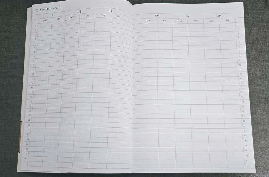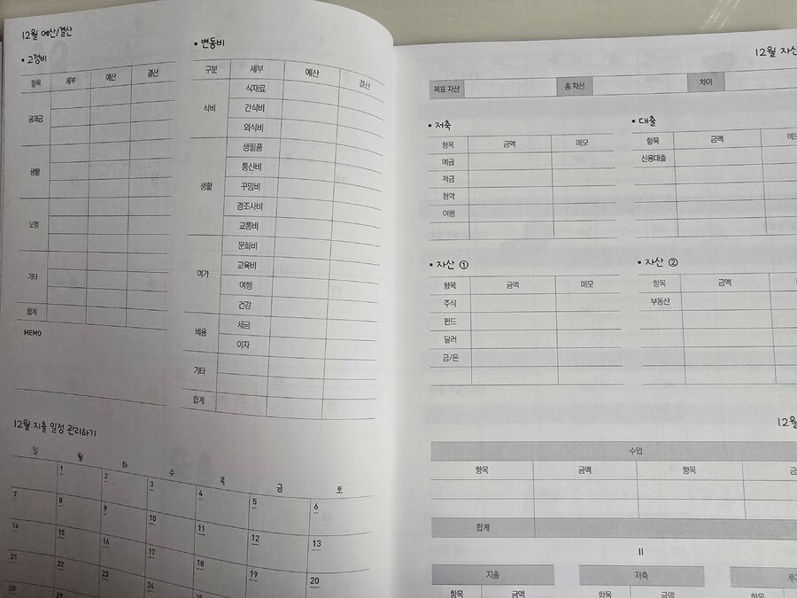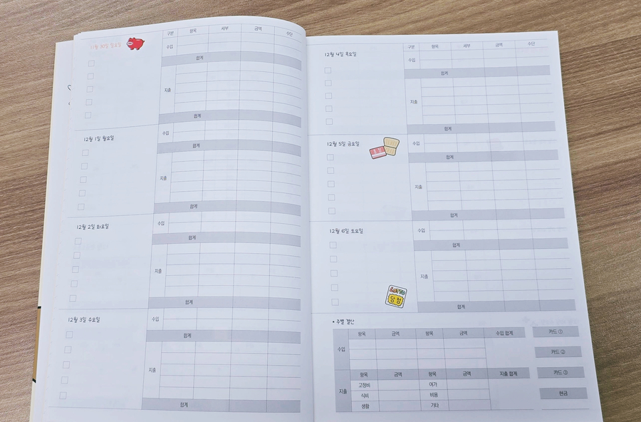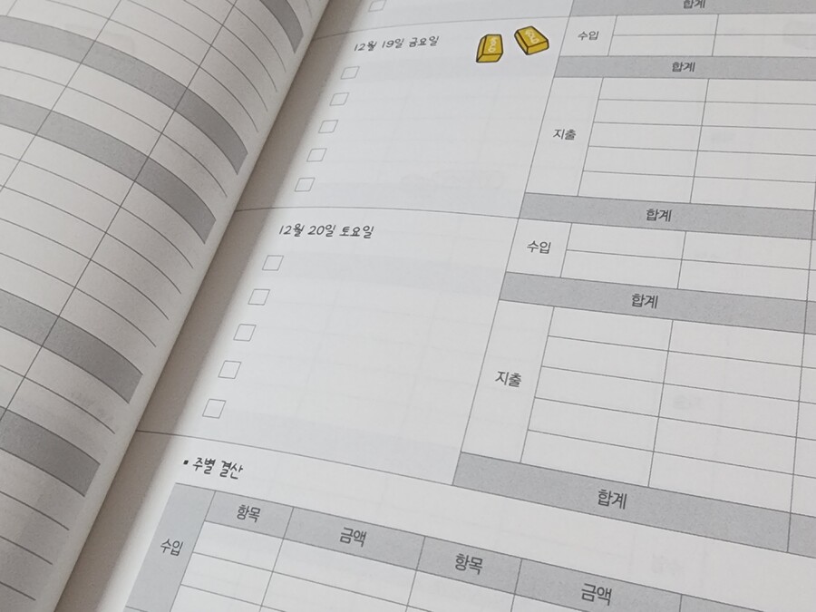 "이 리뷰는 출판사에서 도서를 제공 받아 직접 읽고 작성한 리뷰입니다." 2025년이 시작된 지 얼마 지나지 않은 것 같은데 벌써 2026년이 60일 조금 넘게 남았다. 이제 두 달도 안 남아서 새로운 다이어리와 가계부들이 많이 나오고 있다. 요즘 다이어리랑 가계부에 관심이 많은데 이 두 가지를 한 권으로 같이 쓸 수 있는 가계부가 새로 나와서 어떤 느낌일지 궁금했다. 무엇보다 내가 예전부터 팔로우하고 있던 벤꾸리 작가님의 재테크 책을 읽고 새로운 가계부를 내셨다고 해서 더 기대되었다. 원래 예전엔 가계부를 직접 쓰는 것에 큰 관심이 없었다. 어플로 카드 연동을 시키니까 전부 기록이 되는 어플이 있어서 그렇게 쓰다가 어플은 내가 등록만 해두고 알림이 뜬다고 봤다고 착각하고 그냥 넘어가는 경우가 많아서 돈을 크게 쓴 달이 있는데 모르고 지나쳐 카드값이 지나치게 많이 나온 적도 있어서 재테크가 제대로 진행되지 않고 있다는 생각이 들어 이제 직접 적어서 확인을 하면서 돈모으기를 실천하고 있다. 이제 벤꾸리 작가님의 가계부를 받았으니 가계부를 적어보자! 이 가계부는 경제경영 중 돈과 관련된 부분에 대해 알기 쉽게 알려주는 인스타그램 인플루언서로 활동하시는 돈모으는 벤꾸리 크리에이터님이 만드신 가계부이다. 2025년 12월부터 2026년 12월까지 사용할 수 있고 다이어리와 가계부를 동시에 사용할 수 있게 구성되어 있다. 달마다 내가 어떤 것을 했는지 확인하고 그날 돈을 얼마나 썼는지도 같이 확인할 수 있는 점이 좋았고 초반에 일정과 경조사에 대해서 미리 적을 수 있는 부분이 있었는데 이 부분을 적으며 내가 이 달에 경조사로 얼마나 썼는지 확인할 수 있는 것도 좋은 것 같다. 그리고 연간 결산, 고정비, 변동비, 저축, 자산, 각 월별로 지출 일정을 관리할 수 있는 칸까지 있어서 정말 꼼꼼하게 관리할 수 있을 것 같아 좋았다. 또 날마다 투 두 리스트도 적을 수 있는 칸이 있어 내일 해야 할 일들을 미리 적을 수 있는 부분이 좋았다. 주간 결산을 하는 부분도 있고 엄청 세세하게 적을 수 있는 부분이 많아 짠테크에 엄청 도움이 될 것 같다는 생각이 드는 가계부였다.