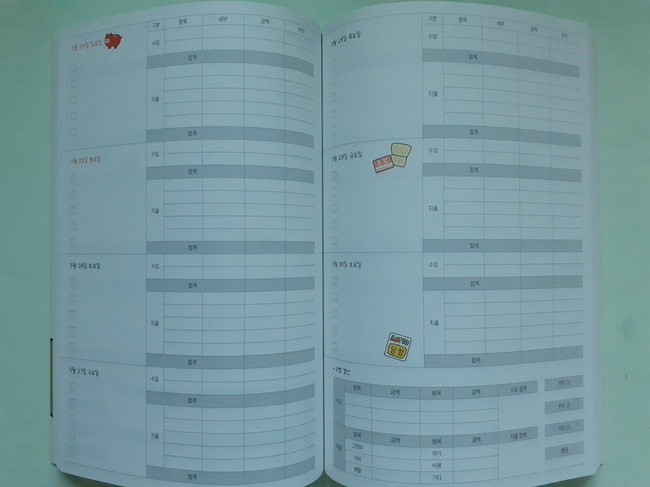 인스타에서 돈을 모으는 주제로 이야기를 그리는 벤꾸리 작가답게 가계부에는 수입과 지출을 쉽게 정리할 수 있도록 섹션을 나눠두어 정리하기 간결하게 꾸며져 있다. 다이어리처럼 월력으로 쓸 수 있는 페이지와 한 달의 예산과 결산을 한눈에 볼 수 게 정리된 페이지 그리고 매일매일의 수입과 지출을 정리할 수 있는 페이지로 이루어진 속지. 어려울 게 없다. 그냥 내가 쓴 돈 기록하고 더하기 빼기만 잘 해 두면 된다! 어때? 2026년 부자 될 것 같지? ㅋㅋㅋ 돼야지.. 되자.. 된다!!