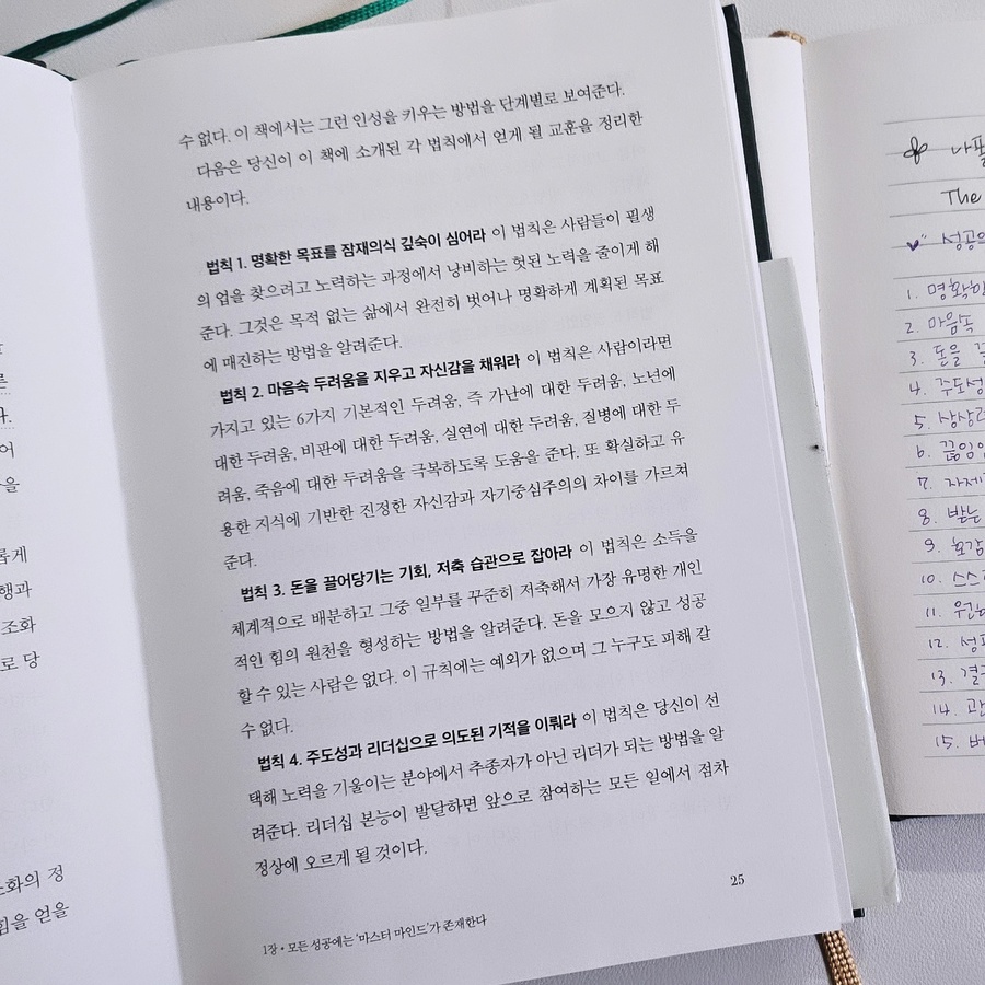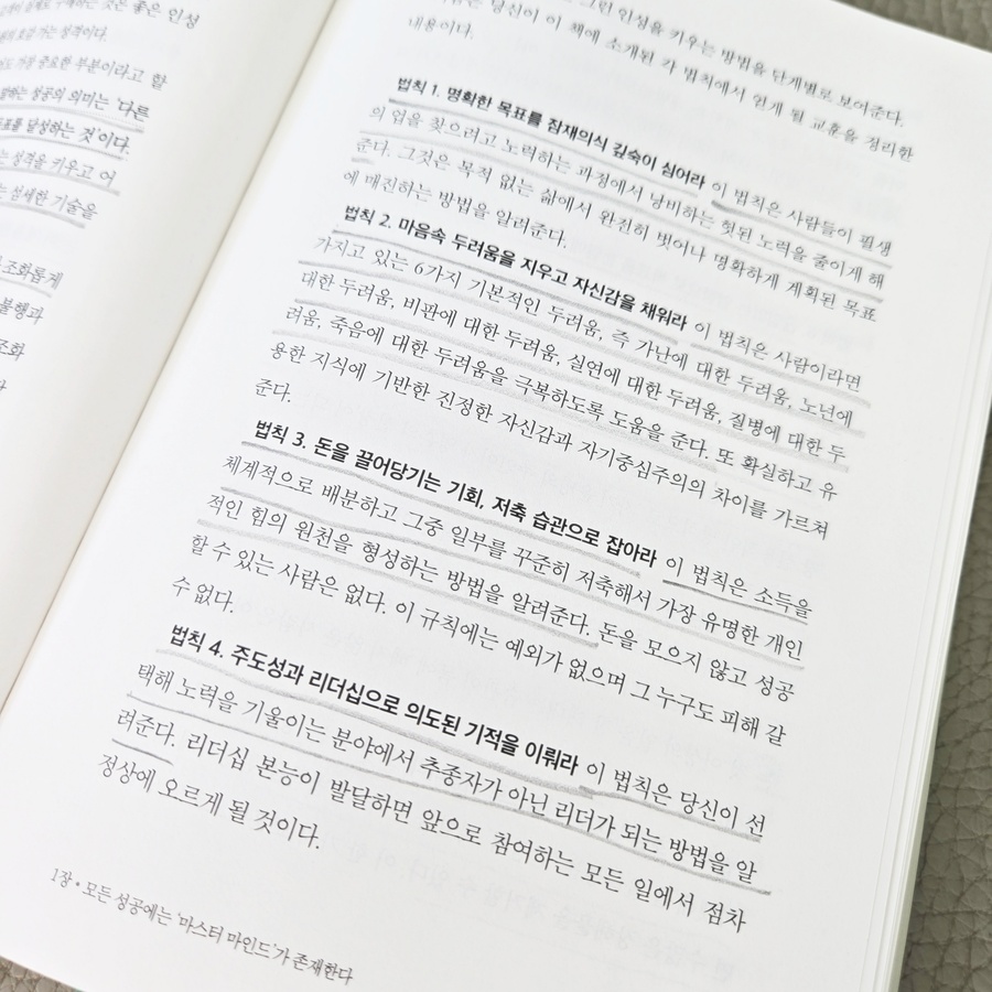 💡 핵심만 담은 7가지 법칙 ☑️ 명확한 목표를 잠재의식 깊숙이 심어라 ☑️ 마음속 두려움을 지우고 자신감을 채워라 ☑️ 돈을 끌어당기는 기회, 저축 습관으로 잡아라 ☑️ 주도성과 리더십으로 의도된 기적을 이뤄라 ☑️ 상상력을 발휘해 일의 부가가치를 높여라 ☑️ 끊임없는 열정으로 목표를 눈앞에 가져와라 ☑️ 자제력으로 생각과 열정의 균형을 잡아라