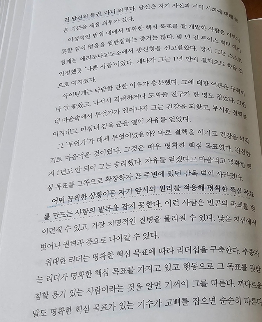 "어떤 끔찍한 상황이든 자기 암시의 원리를 적용해 명확한 핵심목표를 만드는 사람의 발목을 잡지 못한다" 지금은 벌레도 때려잡고 육아로 기절해서 꿈꿀 새도 없지만 어릴 때 그리고 육아초반에는 가위도 참 많이 눌리고 뒤숭숭한 꿈도 많이 꿨던 터여서 그러한 일례로 제가 가위에 눌렸다고 가정해보면 움직일 수 없는 상태에서 저는 나사렛 예수이름으로 사단아 물러가라를 무의식적으로 자기암시로 명확하게 사단을 물리치는 것을 핵심 목표로 잡으면 가위에서 즉각 빠져나오는 경험을 하곤 하였습니다 책에서 처럼 현실의 끔찍한 상황에서 예를 들면 감옥에서 해방되고 결핵이 낫는 것 처럼 말입니다 작년말쯤 아들과 눈썰매장에 갔다가. 아들램 속도를 따라가지 못해서 미끄럼방지매트가 없는 빙판길에서 미끄러져서 발목을 심하게 접질러서 인대파열에 준골절을 입었지만 남편이 쉬는 날도 아니었고 아들과 단 둘이 간거라 아들을 무사히 데려다 줘야한다는 명확한 목표로 파스에 의지한 채 아들부터 집에 데려다주고 병원에 가니 드디어 아프기 시작해서 십개월이 지난 지금에서야 통증이 많이 줄어듬을 느낍니다 처음에는 두발로 걸을 수 없었고 통증과 깁스 상태가 심각했지만 낫겠다는 명확한 목표로 결국은 나은 것이지요 또 한가지 예를 더 덧붙이자면 저희 큰 아이도 버스에서 넘어져서 손바닥이 찢어져서 여덟바늘을 꿰메고 상처가 채 아물지도 않았는데 발가락이 또 부러져서 발가락이 작은데다가 다친 손바닥으로 목발도 없이 깁스로만 부러진 발가락을 치료했더니 걸을 때마다 충격으로 발가락 골절 금이 벌어져서 평생 벌어진 채로 살아야하고 수술도 복잡하고 철심을 박아도 수술 예후가 좋지 않을것이라고 하였으나 저는 명확한 목표를 가지고 기도하고 뼈에 좋다는 음식도 해먹이고 사먹이고 영양제도 먹이고 눈물로 기도한 결과 기적적으로 큰아이의 발가락 뼈가 한달새 자라서 벌어진 금의 틈이 채워진 것입니다 저는 기독교인이어서 저의 경험을 일례로 적었지만 책을 보시면 그렇게 명확한 목표로 성공을 이루고 실패를 빠져나왔음을 가르쳐주고 있습니다. 인생의 모든 힘든 상황에서 다 빠져 나올 수 있는 것은 아닐 것 입니다 다만 인생에 봉착한 여러가지 어려움들을 하나 하나 해결해 나가다 보면 나름의 노하우도 생기고 끈기도 생기고 기다리는 법도 배우고 당장 해결되지 못해도 견디게 되는 법을 배우게 되는 것 같습니다 저희 남편은 식도에 가까운 갑상선암수술을 긴급하게 하고 다행히 항암은 안했지만 신디로이드 약을 이삼년먹고 완치가 오년후 이니 완치까지 좀 남았지만 헤쳐나갈 힘을 키우게 된 것입니다 당시에는 저도 다리가 풀리고 일주일을 울었지만 낫게해야겠다는 명확한 목표로 담담히 남편병실에서 잠도 자고 수술가는 남편 위로도 해주고 무사히 수술 받고 온 남편 웃겨도 주고 애아빠가 멘탈이 나갈 때 는 제가 그리고 제가 멘탈붕괴가 올 때는 남편이 서로 힘을 합쳐서 현명하게 해결하면 공격이 들어올 틈이 없어지는 것입니다 책에서도 다툼이 잦은 일곱 아들에게 나무막대기를 주면서 나무막대기가 일곱다발일때는 부러뜨릴 수 없지만 다퉈서 한명에게 막대기가 하나씩 일때는 각각에게 공격이 들어오면 쉽게 부러지는 예가 나옵니다 이렇게 어려움에 닥칠 때마다 성공의 법칙을 방해하는 공격을 지혜롭게 해결하는 방법을 확실하게 배울 수 있는 #나폴레온힐성공의법칙1 과 #나폴레온힐부의법칙 책을 추천드립니다 늘 지혜가 가득한 책으로 필사러들의 발전을 위해 물심양면으로 부지런히 애써주시고 가르쳐주시는 리더선생님 @gbb_mom 🌻 격려해주시고 용기주시는 운영진 선생님 @wlsdud2976 🌷 @strongmom526 🪻 소중하고 귀한책을 #협찬 해주신 @jiinpill21 🌳 그리고 성실하신 💐 #아이리스필사단2기 선생님들께 감사드려요 오늘도 읽어주셔서 진심으로 감사드려요 #단단한맘 _강한맘_하하맘_공동운영 #21세기북스 출판사 #강한엄마 #하하맘
