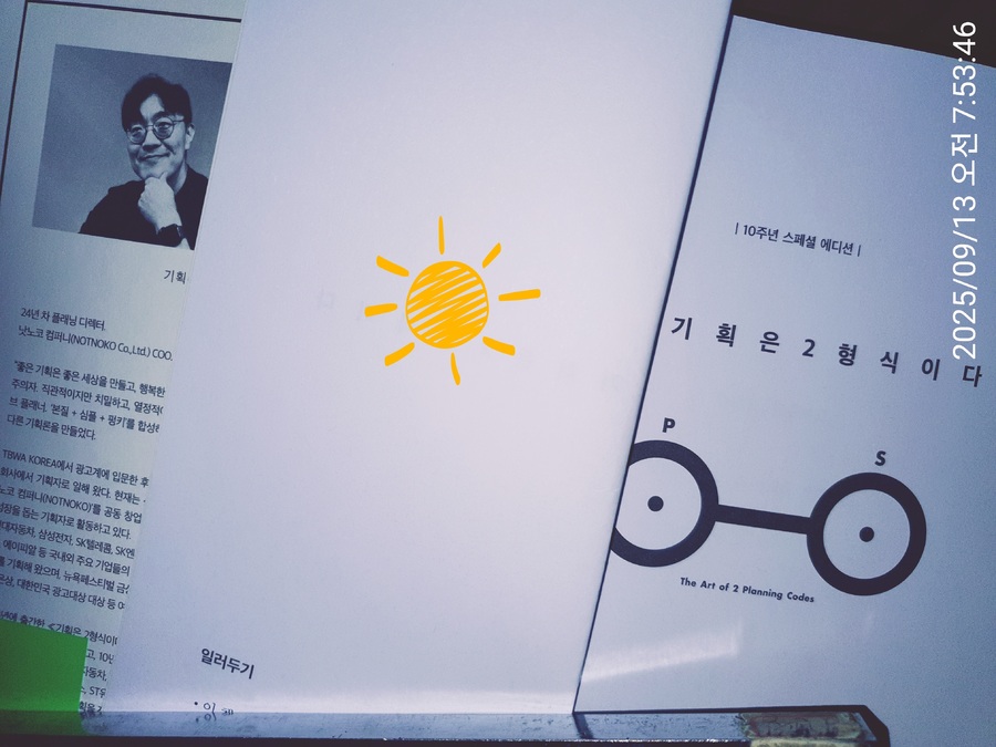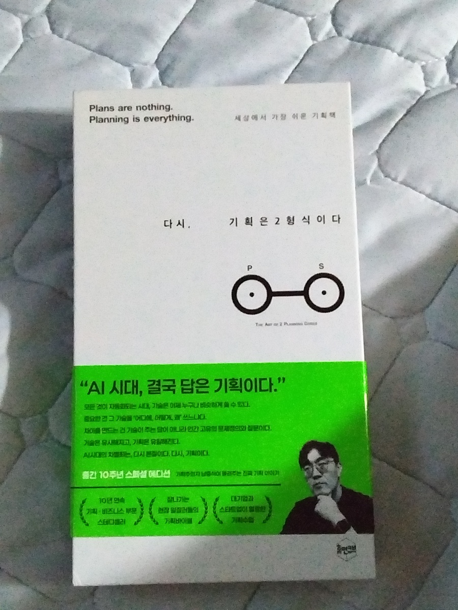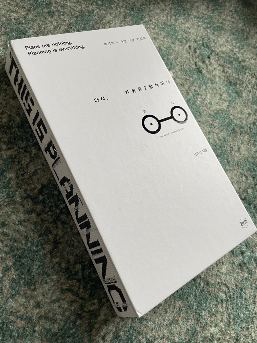 ※예스24 리뷰어클럽 서평단 자격으로 도서를 제공받고 작성한 리뷰입니다※ 현재 UIUX디자인&편집디자인 일을 맡고 있는 나. 최근 사수에게 디자인을 할 때 아무것도 없이 처음부터 착착 진행하는 걸 못하는 것 같다고 솔직히 말씀드렸다... 그래서 사수도 본인이 보기에 '아무것도 없는 빈 도화지를 주고 만들어라!' 하면 내가 잘 못하는 것 같다고 말씀하셨다. 그리고 '기획을 많이 해봐야한다'며 '앞으로 기획할 일이 많고 네가(실제론 너 라고 안했음) 사수가 될 수도 있는데 디자이너가 기획을 못하면 되겠냐'는 말을 들었다. 나도 맞말이라는 생각을 하고 있고, 디자인이 아니라도 어쨌든 기획은 무슨 일에나 중요할 것이기 때문에 최근 기획에 대한 책을 한 권 샀었다. 그런데 최근 리뷰어클럽에 '다시, 기획은 2형식이다'라는 책의 서평단을 모집하길래 신청 마감일의 끝자락에 댓글로 신청했는데 당첨이 되어 버렸다. 꽤 많은 사람들이 신청했던데 내가 당첨돼서 압도적 감사드림. 원래 기획은 2형식이다 라는 책에서 업그레이드가 된 버전인 것 같다. 바뀐 표지도 심플하니 이쁘다. 표지에 그려진 안경 모양이 뭘까 했는데 책에서 소개되는 플래닝 코드를 그려놓았다. 좀 두껍긴 하지만 좀 가벼운 톤으로 설명이 되어 있다.