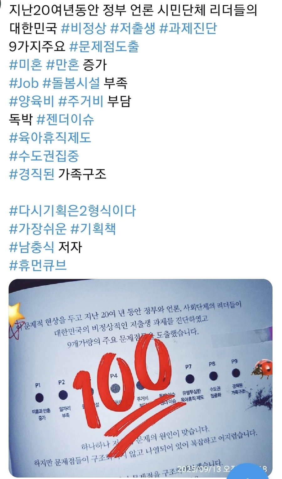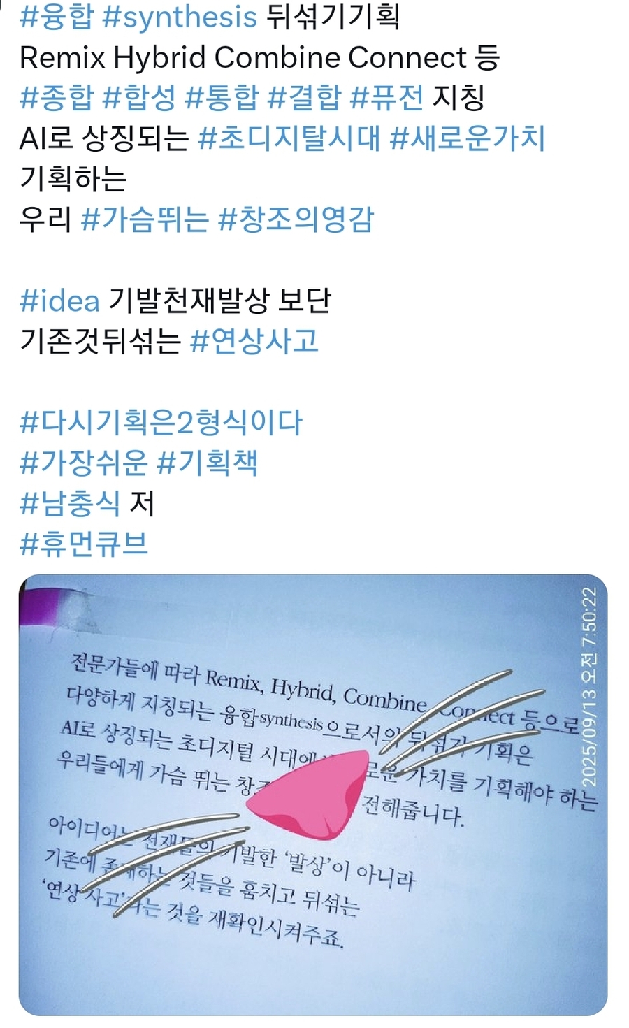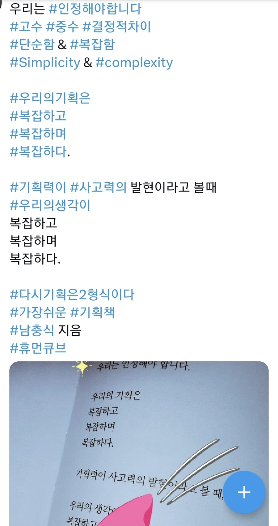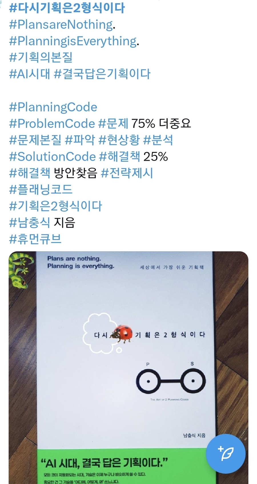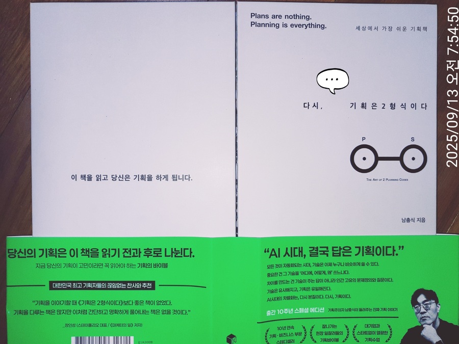 #다시기획은2형식이다~ 유명 작가적 관점에서 세상의 모든 글의 제언이랄 수 있는 최고의 문장중에 단연 으뜸으로 생각되는 문장은, #빼고 #빼고 #빼라 #빼고빼고빼라 기억된다. 이런 시각은 본문의 대주제인 기획분야에 더 어울릴만 하다. 하지만 요즘 대세인 AI트렌드의 기계적 감성시대에 인간적 따뜻함을 투입시켜야하는 기획이 어쩌면 감성을 배제한 모양좋은 패턴을 이겨낼 해법은 아닌가 생각도 든다. 다시기획은2형식이다 중에서 지난20여년동안 정부 언론 시민단체 리더들의 대한민국 #비정상 #저출생 #과제진단 9가지주요 #문제점도출 #미혼 #만혼 증가 #Job #돌봄시설 부족 #양육비 #주거비 부담 독박 #젠더이슈 #육아휴직제도 #수도권집중 #경직된 가족구조~p.205 기획이란 결국 주어진 옵션을 결국 짧은시간에 소비자의 니즈를 붙잡아 꼭 박히게 하는데 있다. 다만 소비계층을 붙잡는덴 다양한 덕목들중 과욕과 욕심을 버리고 한두가지의 포커싱으로 제목에서 말하는 2형식이란 극강의 간결한 관점에서 접근할듯하다. 여기서 중요한 것은 해결책 빼라 넘어에 존재하는 장점인 본질, 플래닝코드 PlanningCode 과정에서 문제점 P~ Problem코드와 결과인 해결책 S~ Solution코드로 탄생하는 본질이 ㅇㅇ은ㅇㅇ이다 라는 결론에 도달하는듯하다. 저자는 그것을 제목에서 말하고 있는 2형식의 최종 지향점일듯 하다. 더 신경 써야 하는 것은 우리의 예상과 달리 S가 아닌 P코드입니다. P코드 정의 75% S코드 25% 다시기획은2형식이다 중에서 #융합 #synthesis 뒤섞기기획 Remix Hybrid Combine Connect 등 #종합 #합성 #통합 #결합 #퓨전 지칭 AI로 상징되는 #초디지탈시대 #새로운가치 기획하는 우리 #가슴뛰는 #창조의영감 #idea 기발천재발상 보단 기존것뒤섞는 #연상사고 본서는 25쇄에 달하는 기획분야 Steady seller~ 기획의 근간은 창의력과 추진력, 그리고 이를 발전하게 만드는 삶의 학문인 인문학적 혜안이다. 본문에서는 그런 바탕위에 기획이라는 미팅름어서 이루어지는 세상에서 가장 알기쉬운 방법론과 알기쉽게 기획하게끔 가이드하는 책이 본문일듯 하다. #기획은 2형식이다#남충식 저자 휴먼큐브 출간 #휴먼큐브 #출판사의지원으로작성되었습니다 ■■■■■ |