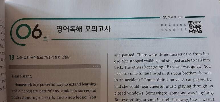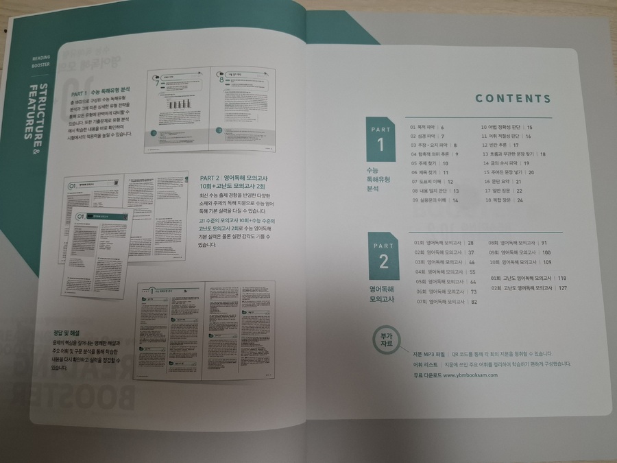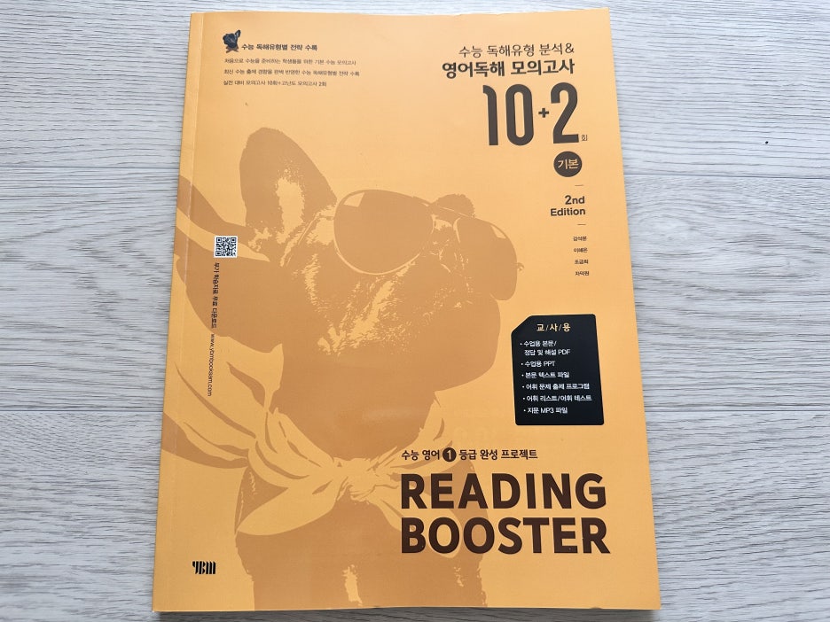 총 18강의 수능 독해유형을 공부하고 난후, 최신 수능 출제 경향을 반영한 다양한 소재와 주제 독해지문으로 실전 모의고사 감각 키우기!! 고1 수준의 모의고사 10회와 수능수준의 고난도 모의고사 2회 구성이라.. 실전까지 경험해 보기 좋을듯합니다. 정답 및 해설은 따로 구성이 되어 있고 문제의 핵심을 짚어내는 꼼꼼한 해설과 어휘, 구문분석의 해설이 있어 혼자 공부하기도 좋은 교재인듯 합니다. 제가 받아본 교사용 교재에는 수업용본문, 정답,해설PDF, 수업용PPT,본문 텍스트 파일, 어휘 문제 출제 프로그램, 어휘리스트, 어휘테스트등 교사가 활용하기에 편한 자료도 제공하고 있었습니다. 이건 QR코드를 찍고 로그인해야 자료를 받아 볼수 있다는 점! 수시로 갈지, 정시파이터가 될지 모르는 막내를 위해 맛보기로 교사용을 보여줬답니다.
