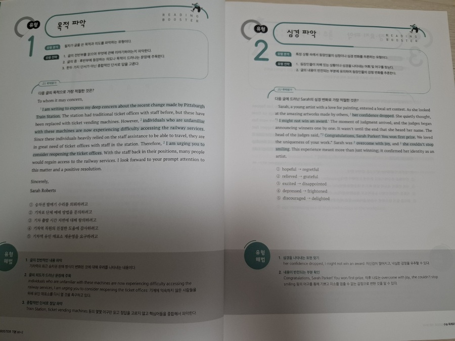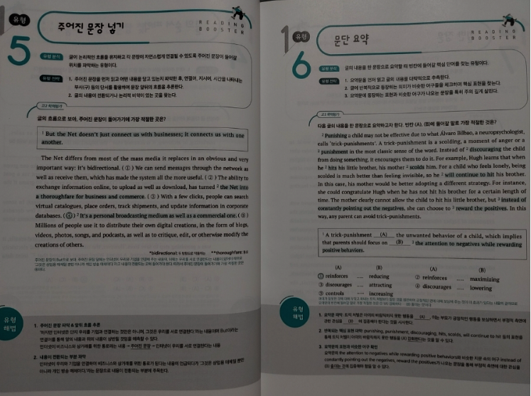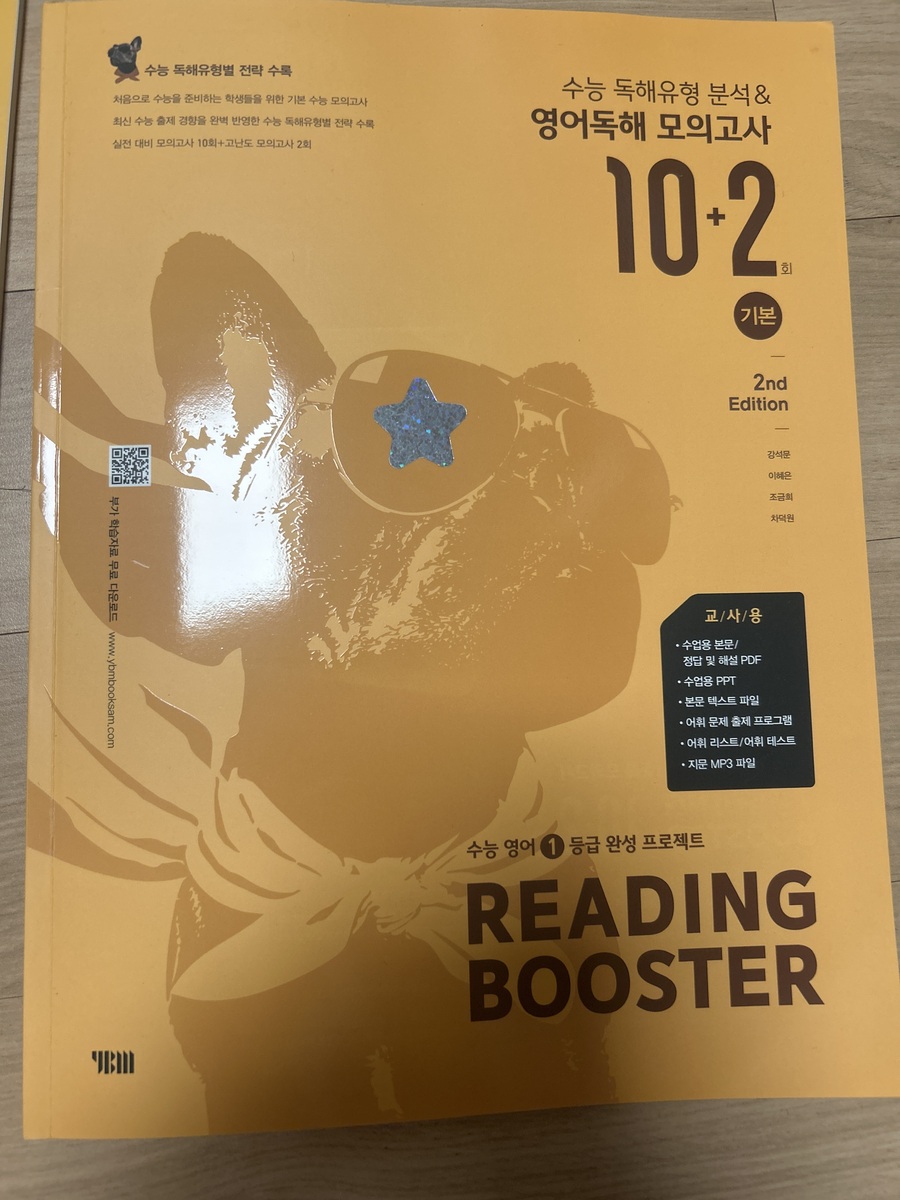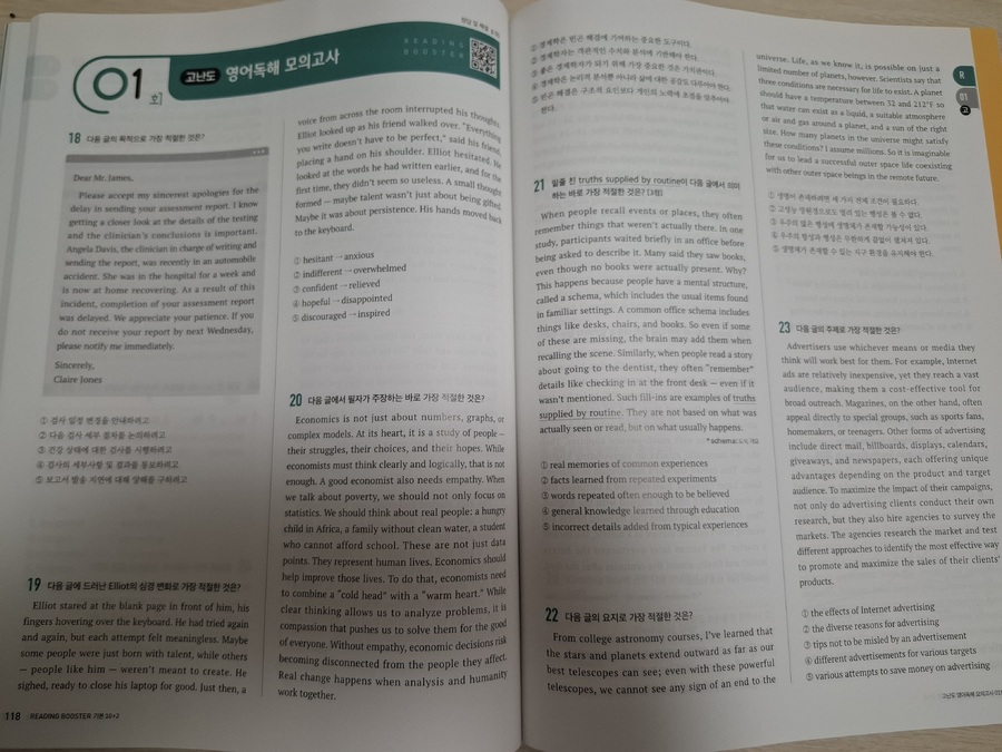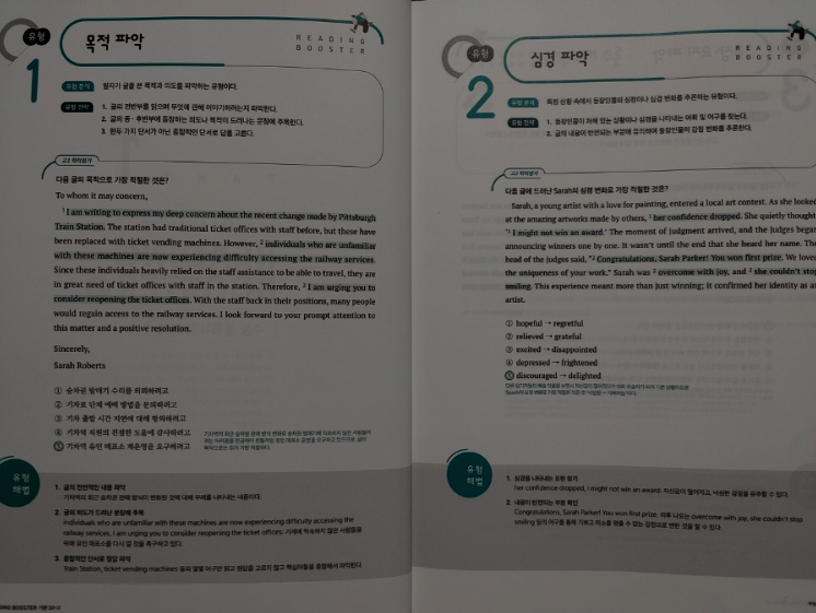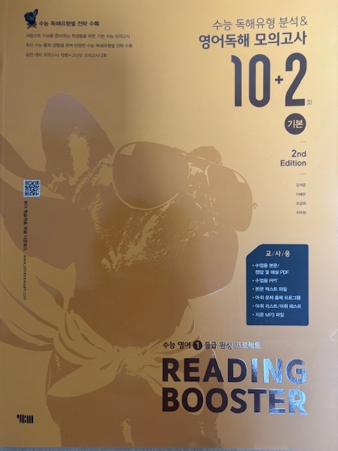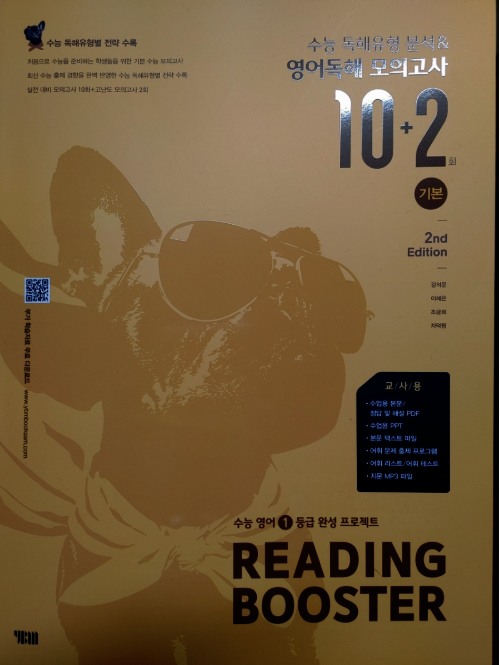 다른 선생님들도 그렇겠지만 아무래도 쓰던 교재만 계속해서 사용할 때가 많다. 그러다보니 예전 교재들 중에는 절판이 되어서 더이상 구할 수 없는 교재들도 있고 해서 한권씩 두권식 더이상 사용하지 않는 교재들을 솎아 내고 있다. 못 구하는 교재들이 생기는 반면 새로 생기는 교재들도 많고 거기다 개정판이 나오는 경우도 많다. 이 교재는 2nd 에디션으로 이른바 개정판이다. 그만큼 인기가 있고 꾸준히 사용되고 있는 교재라는 것을 증명해준다. 10회 분량에 고난도 2회가 더 들어간 이 교재와 총 15회 분량의 교재 두 가지가 있으므로 난이도에 따라 필요한 걸 골라 쓰면 될 것 같다. 크게 두 개의 파트로 나누어져 있는데 먼저 파트1에서는 독해 유형을 분석했다. 흔히 다른 수능 리딩 교재들에서도 볼 수 있는 구성이다. 비교적 쉬운 문제인 심경이나 요지 파악을 비롯해서 도표 같은 실용문도 하나의 유형으로 묶어서 설명하고 있고 그 외 가장 오답률이 높은 빈칸 추론 문제와 마지막에 장문 문장까지 유형이란 유형은 모조리 다 넣어 두어서 자신이 어떤 유형에 취약한지 한번 더 짚고 넘어 갈 수 있도록 해 두었다. 유형당 한 문제가 나오고 가장 하단에 유형 해법을 통해서 이 문제를 어떻게 답을 찾을 수 있는지를 설명해주고 있어서 자신이 잘 틀리는 문제들의 정답을 찾아갈 수 있는 방법을 알려주고 있다. 이런 부분만 잘 이해해 낸다면 어떤 유형의 문제가 나와도 충분히 쉽게 정답률을 높일 수 있는 것이다. 간단히 유형들을 설명해주었다면 파트2부터는 본격적인 독해 문제다. 수능 문제와 같은 유형으로 앞부분인 듣기평가 17번까지를 제외하고 18번부터 45번까지 구성되어 있다. 총 열번의 모의고사로 자신이 잘 틀리는 부분을 확인할 수 있고 어떤 문제가 나올지 내용들도 익힐 수 있다. 워낙 여러 분야에서 다양하게 나오는지라 가능하면 많은 단어를 널리 알고 있으면 지문을 이해하기 편할 것이라 생각된다. 제목에서처럼 마지막 2회분은 고난도로 구성되어 있으므로 등급컷이 마지막 끝자리에서 걸리는 사람이라면 반드시 해결하고 확실히 하는 것이 좋겠다. 각 회마다 제일 위에 큐알코드가 있어서 지문을 들어보는 것도 쉽게 접근할 수 있다. 듣기 문제는 따로 없지만 이런 본문 듣기를 통해서 청취 능력을 더 끌어 올릴 수가 있다. 이 정도 본문을 읽어서 이해가 되는 사람이라면 문제없이 듣기 점수를 다 받을 수 있다는 소리다. 어휘 리스트로 부가자료로 받을 수 있으니 필요한 사람이라면 다운 받아 뜻을 익히는 데도 도움이 될 것이다. 해설에서도 어휘는 따로 나와 있으니 그 부분을 참고해도 좋을 것 같다. 해설에는 문제해결과 더불어 까다로운 문장의 경우 구문분석도 해 두었으니 정답을 알았지만 문장이 어떻게 나눠지는지 모르는 사람이라면 그런 부분에서 더 도움을 얻을 수 있을 것이다. 수능은 끝났고 이제 내년도의 수능이 남았다. 거의 딱 일년 남은 셈이다. 영어는 절대 평가로 이루어져서 정말 웬만하면 거의 상위 등급을 받을 수 있는 과목이기도 하다. 90점만 넘으면 1등급이니 말이다. 가장 안타까운 것이 89점이나 이런게 끝점수에서 걸려버리는 것인데 그런 아쉬움을 방지하고자 가능하면 많은 독해 문제집을 풀어보는 것이 분명 크게 영향을 줄 것이다. 그것도 뜬금없는 지문보다는 가능하면 수능에 자주 나오는 형식이나 카테고리의 문제들을 보는 것이 좋겠지. 이 리딩 부스터는 EBS집필진이 엄선한 예비 수능 문제를 수록해서 실전 감각을 익힐 수 있으며 1등급을 목표로 하는 학생들에게 제목 그대로 부스터를 달아 줄 수 있는 교재가 되어 줄 것이다. |