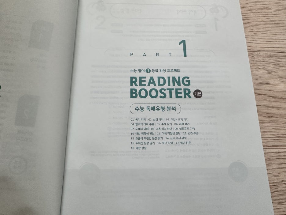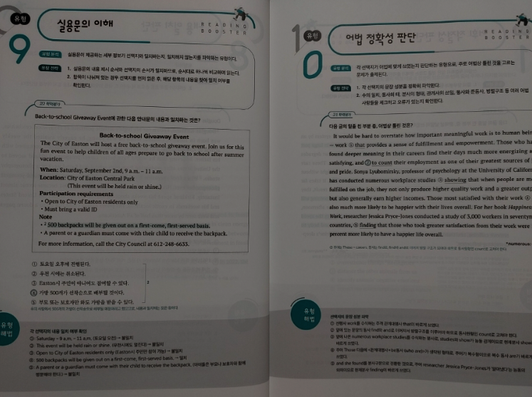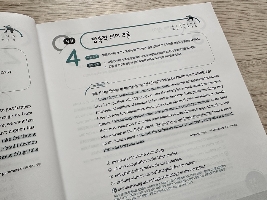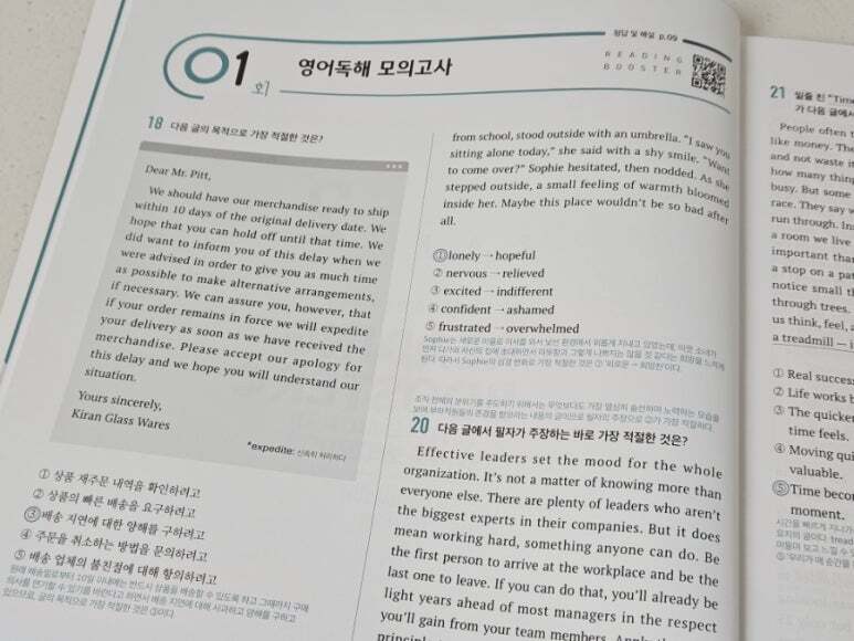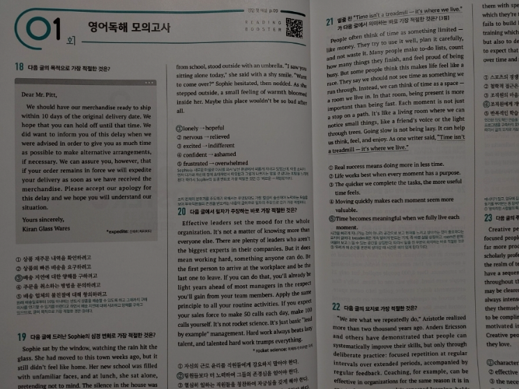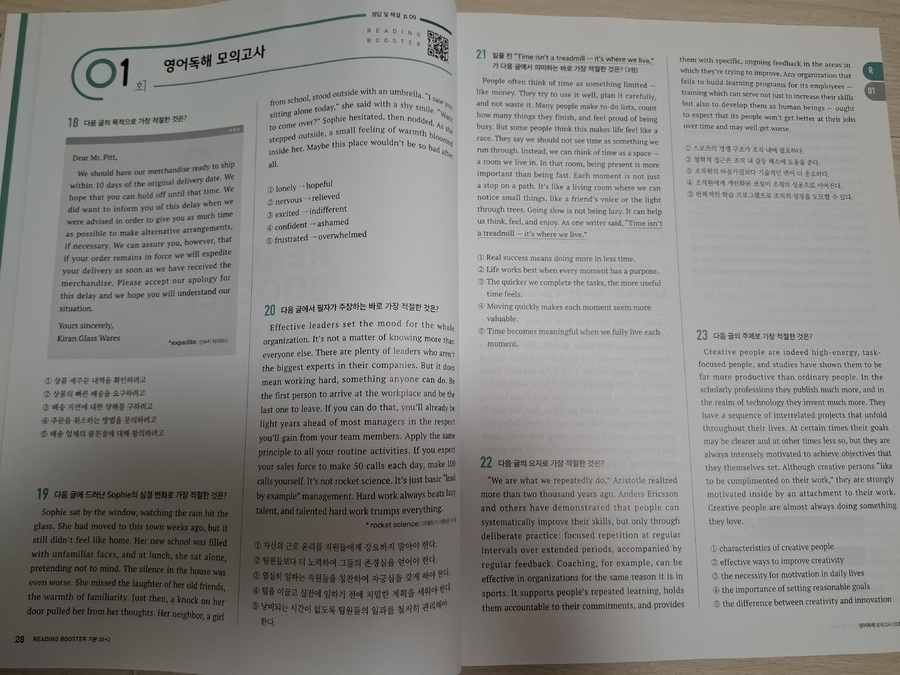 다른 선생님들도 그렇겠지만 아무래도 쓰던 교재만 계속해서 사용할 때가 많다. 그러다보니 예전 교재들 중에는 절판이 되어서 더이상 구할 수 없는 교재들도 있고 해서 한권씩 두권식 더이상 사용하지 않는 교재들을 솎아 내고 있다. 못 구하는 교재들이 생기는 반면 새로 생기는 교재들도 많고 거기다 개정판이 나오는 경우도 많다. 이 교재는 2nd 에디션으로 이른바 개정판이다. 그만큼 인기가 있고 꾸준히 사용되고 있는 교재라는 것을 증명해준다. 10회 분량에 고난도 2회가 더 들어간 이 교재와 총 15회 분량의 교재 두 가지가 있으므로 난이도에 따라 필요한 걸 골라 쓰면 될 것 같다. 크게 두 개의 파트로 나누어져 있는데 먼저 파트1에서는 독해 유형을 분석했다. 흔히 다른 수능 리딩 교재들에서도 볼 수 있는 구성이다. 비교적 쉬운 문제인 심경이나 요지 파악을 비롯해서 도표 같은 실용문도 하나의 유형으로 묶어서 설명하고 있고 그 외 가장 오답률이 높은 빈칸 추론 문제와 마지막에 장문 문장까지 유형이란 유형은 모조리 다 넣어 두어서 자신이 어떤 유형에 취약한지 한번 더 짚고 넘어 갈 수 있도록 해 두었다. 유형당 한 문제가 나오고 가장 하단에 유형 해법을 통해서 이 문제를 어떻게 답을 찾을 수 있는지를 설명해주고 있어서 자신이 잘 틀리는 문제들의 정답을 찾아갈 수 있는 방법을 알려주고 있다. 이런 부분만 잘 이해해 낸다면 어떤 유형의 문제가 나와도 충분히 쉽게 정답률을 높일 수 있는 것이다. 간단히 유형들을 설명해주었다면 파트2부터는 본격적인 독해 문제다. 수능 문제와 같은 유형으로 앞부분인 듣기평가 17번까지를 제외하고 18번부터 45번까지 구성되어 있다. 총 열번의 모의고사로 자신이 잘 틀리는 부분을 확인할 수 있고 어떤 문제가 나올지 내용들도 익힐 수 있다. 워낙 여러 분야에서 다양하게 나오는지라 가능하면 많은 단어를 널리 알고 있으면 지문을 이해하기 편할 것이라 생각된다. 제목에서처럼 마지막 2회분은 고난도로 구성되어 있으므로 등급컷이 마지막 끝자리에서 걸리는 사람이라면 반드시 해결하고 확실히 하는 것이 좋겠다. 각 회마다 제일 위에 큐알코드가 있어서 지문을 들어보는 것도 쉽게 접근할 수 있다. 듣기 문제는 따로 없지만 이런 본문 듣기를 통해서 청취 능력을 더 끌어 올릴 수가 있다. 이 정도 본문을 읽어서 이해가 되는 사람이라면 문제없이 듣기 점수를 다 받을 수 있다는 소리다. 어휘 리스트로 부가자료로 받을 수 있으니 필요한 사람이라면 다운 받아 뜻을 익히는 데도 도움이 될 것이다. 해설에서도 어휘는 따로 나와 있으니 그 부분을 참고해도 좋을 것 같다. 해설에는 문제해결과 더불어 까다로운 문장의 경우 구문분석도 해 두었으니 정답을 알았지만 문장이 어떻게 나눠지는지 모르는 사람이라면 그런 부분에서 더 도움을 얻을 수 있을 것이다. 수능은 끝났고 이제 내년도의 수능이 남았다. 거의 딱 일년 남은 셈이다. 영어는 절대 평가로 이루어져서 정말 웬만하면 거의 상위 등급을 받을 수 있는 과목이기도 하다. 90점만 넘으면 1등급이니 말이다. 가장 안타까운 것이 89점이나 이런게 끝점수에서 걸려버리는 것인데 그런 아쉬움을 방지하고자 가능하면 많은 독해 문제집을 풀어보는 것이 분명 크게 영향을 줄 것이다. 그것도 뜬금없는 지문보다는 가능하면 수능에 자주 나오는 형식이나 카테고리의 문제들을 보는 것이 좋겠지. 이 리딩 부스터는 EBS집필진이 엄선한 예비 수능 문제를 수록해서 실전 감각을 익힐 수 있으며 1등급을 목표로 하는 학생들에게 제목 그대로 부스터를 달아 줄 수 있는 교재가 되어 줄 것이다. |