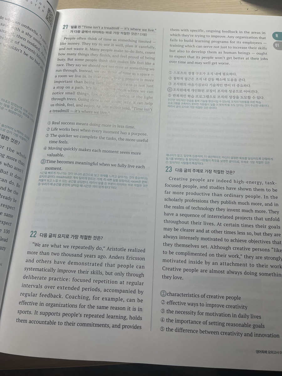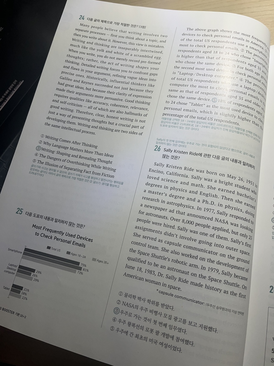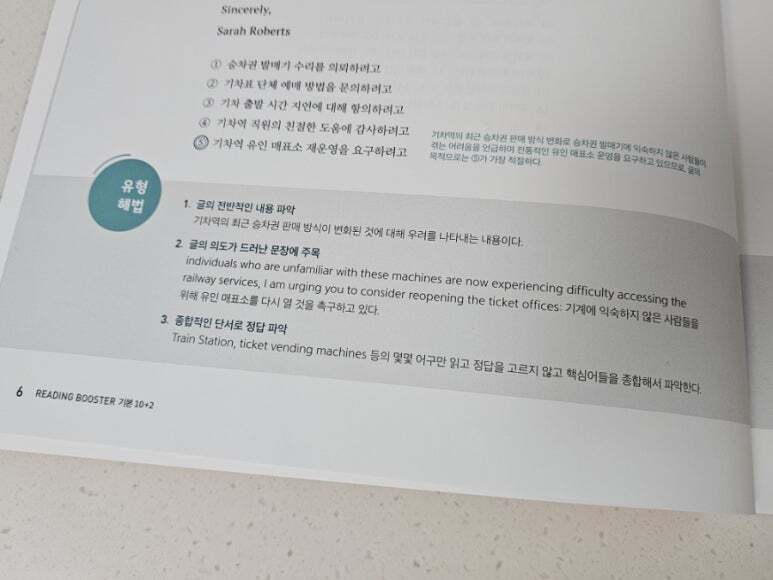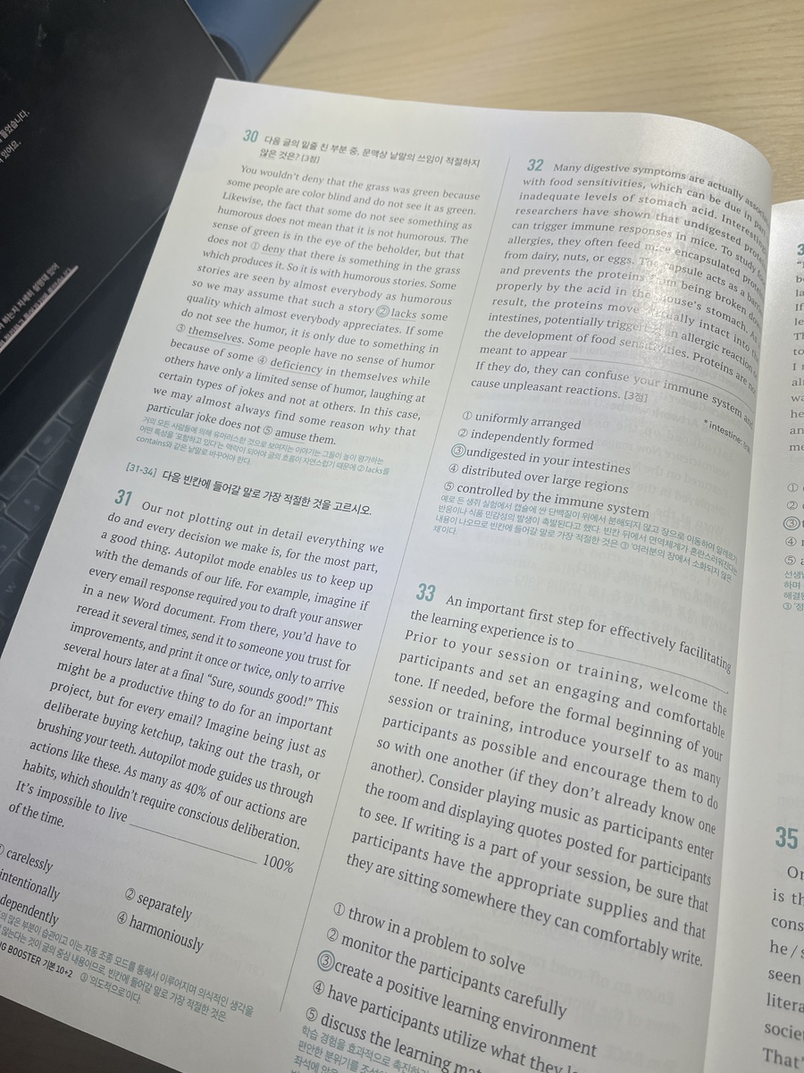 또한 교사용 책에는 지문에 핵심 밑줄까지 표시되어 있어 혼자 공부할 때도 큰 도움이 됩니다. 이전에 다른 문제집으로 모의고사를 연습했을 때는 지문이 너무 어렵게 느껴지고 제한 시간 안에 다 풀지 못해 부담이 컸는데, 이 책으로 공부하면서 문제 푸는 속도가 눈에 띄게 빨라졌습니다. 예를 들어 however가 나오면 앞 내용과 반대된다는 점을 바로 파악해 그 뒤를 집중해서 읽는 식으로, 불필요한 부분에 시간을 쓰지 않게 되었습니다. 그 결과 한 문제를 푸는 데 걸리는 시간이 절반 이상 줄어들었습니다. 어떤 문제집을 사야 할지 고민하고 있다면, 기본부터 실전까지 차근차근 연습할 수 있는 이 책을 한 번 선택해보는 것도 정말 좋은 선택이라고 생각합니다. 충분히 추천할 만한 문제집입니다. |