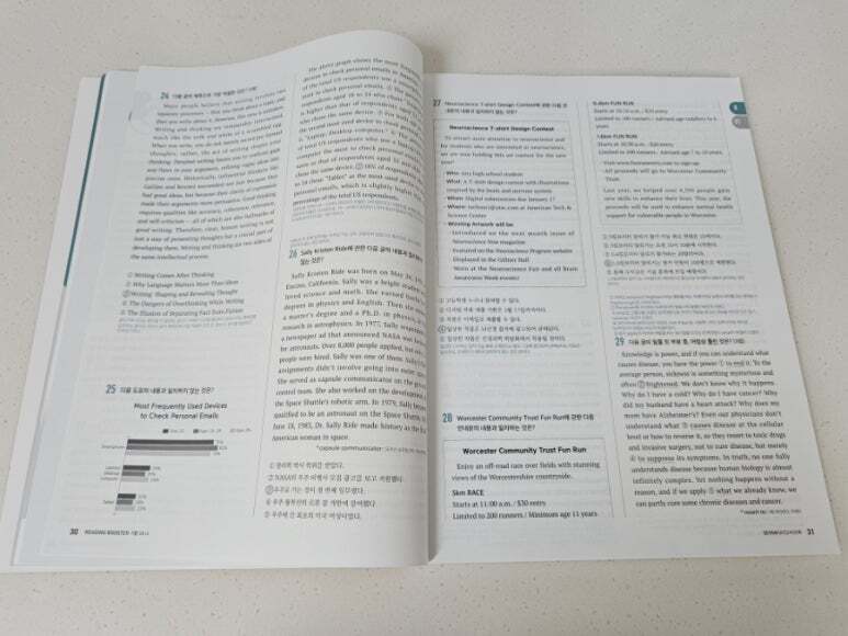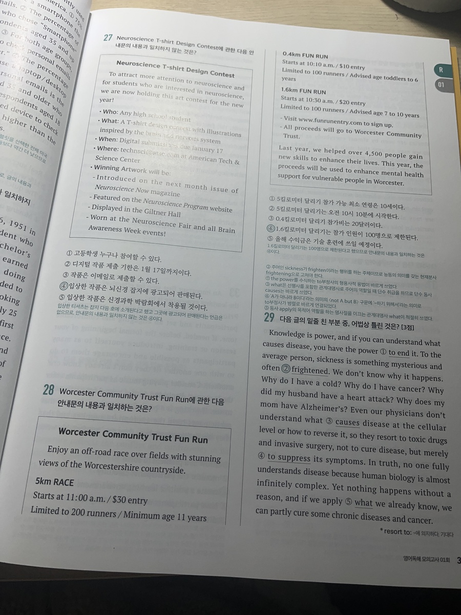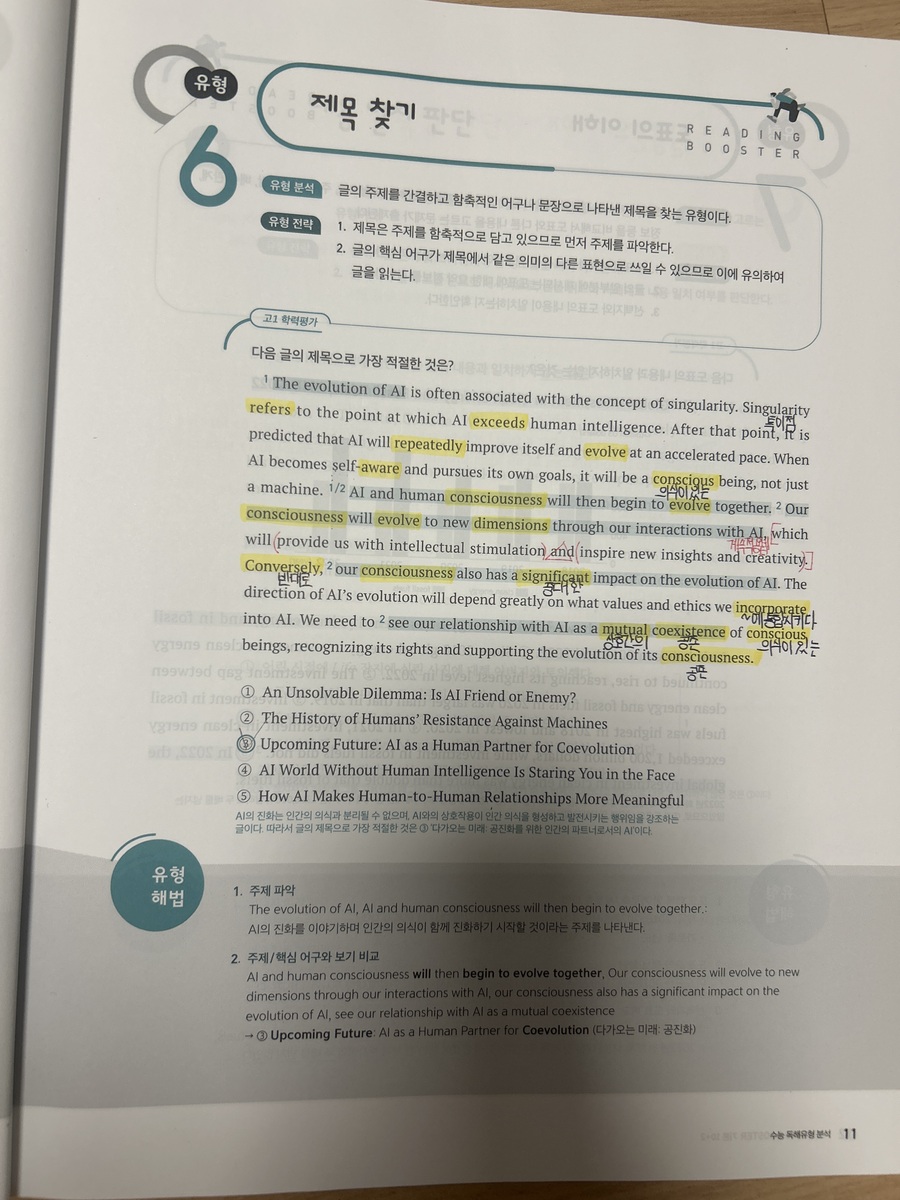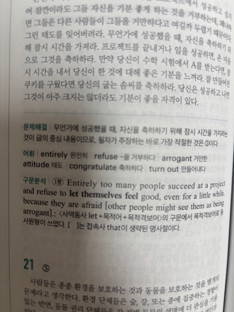 또한 교사용 책에는 지문에 핵심 밑줄까지 표시되어 있어 혼자 공부할 때도 큰 도움이 됩니다. 이전에 다른 문제집으로 모의고사를 연습했을 때는 지문이 너무 어렵게 느껴지고 제한 시간 안에 다 풀지 못해 부담이 컸는데, 이 책으로 공부하면서 문제 푸는 속도가 눈에 띄게 빨라졌습니다. 예를 들어 however가 나오면 앞 내용과 반대된다는 점을 바로 파악해 그 뒤를 집중해서 읽는 식으로, 불필요한 부분에 시간을 쓰지 않게 되었습니다. 그 결과 한 문제를 푸는 데 걸리는 시간이 절반 이상 줄어들었습니다. 어떤 문제집을 사야 할지 고민하고 있다면, 기본부터 실전까지 차근차근 연습할 수 있는 이 책을 한 번 선택해보는 것도 정말 좋은 선택이라고 생각합니다. 충분히 추천할 만한 문제집입니다. |
