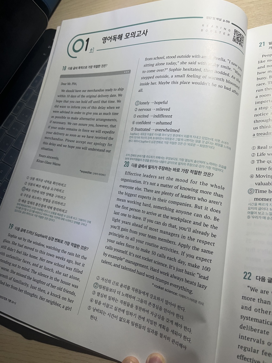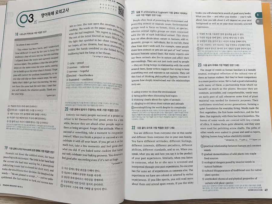 지문 분석이 체계적이고, 독해의 방향성을 차근히 알려주는 문제집입니다. 지문을 어떻게 접근해야 하는지와 풀이 포인트가 하단에 정리되어 있어서 방향성을 잡고 풀 수 있다는 점이 좋았어요. 혼공러나 모고유형 처음 접하는 학생들에게 추천합니다. 지문 mp3나 어휘리스트를 이용할 수 있게 qr이 있는 점도 크게 도움이 됩니다. |