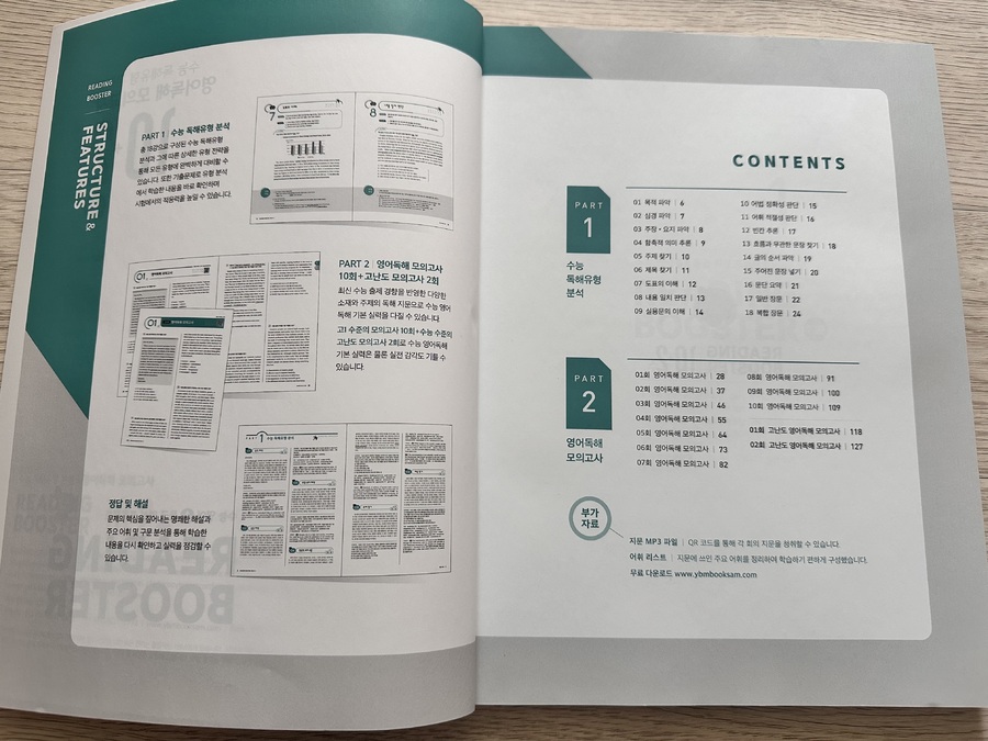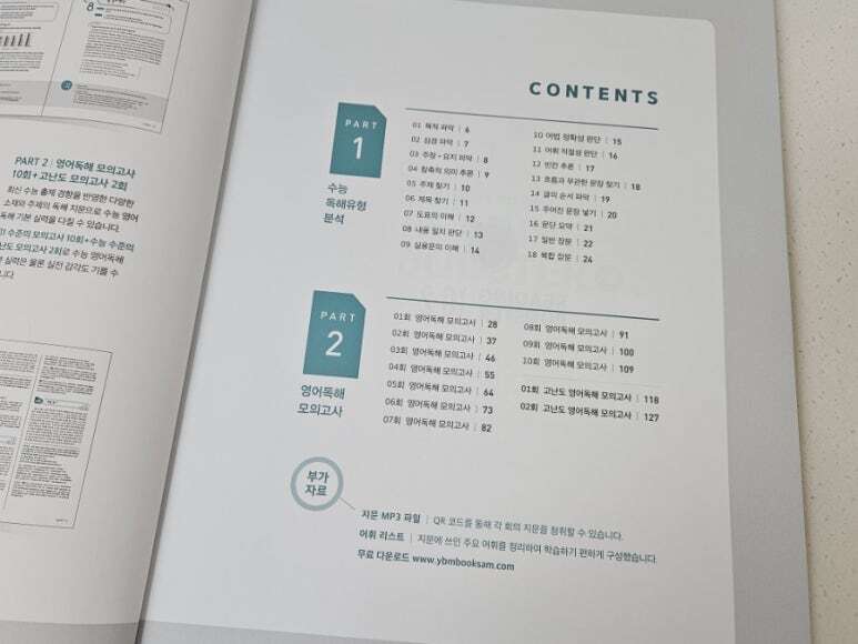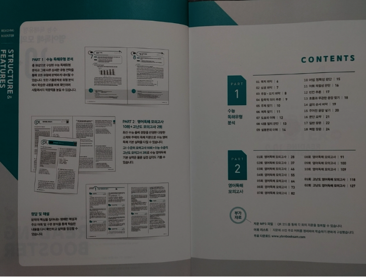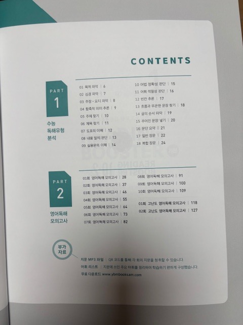이번 수능영어 난이도가 굉장했다고 하죠. 잘하는 애들은 기본 영어에서 1.2등급으로 먹고간다는 절대평가 수능영어가 난이도 실패! 그래서 수시에 수능최저를 못맞춰 수시탈락자들이 많아졌다는 뉴스... 다들 이 뉴스 때문이라도 수능영어 탄탄하게 해가야겠다고 생각이 들지 않았을까 싶습니다. 우리아이도 고등영어를 공부하는 입장이라...많은 교재를 알아가고 싶어 신청하게 되었습니다. YBM은 워낙에 영어교재로 명성이 있는 출판사로 믿고 선택할수 있었습니다. 처음 수능을 준비하는 학생들을 위해 최신 수능 출제 경향을 독해유형별로 분석하는 파트1 이어 실전 대비 모의고사 10회와 고난도 모의고사 2회 총 12회 모의고사를 풀어 볼수 있는 파트2 ![]() . 파트1에서는 총 18강으로 구성된 수능 독해유형을 배워갈 수 있습니다. 독해 유형 분석과 그에 따른 상세한 유형 전략을 보기 편하게 구성되어 있었습니다. 유형분석, 유형전략, 유형해법까지~ 독해를 막연하게 해나가는게 아니라 유형별로 전략팁을 알려주니 접근 쉽게 도움될것 같습니다.