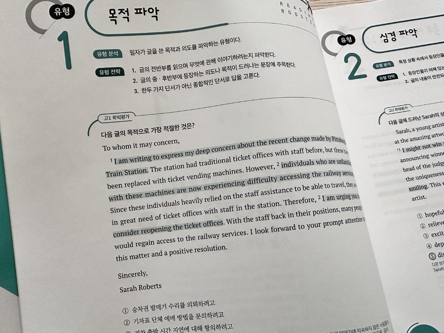 책 표지를 보면 최신 출제 경향이 반영된 고1 수준의 모의고사 10회와 수능 수준의 고난이도 모의고사 2회가 수록 되어 있다고 쓰여 있습니다. 이 교재는 두 개의 파트로 나누어져 있습니다. 첫번째 파트는 각각의 지문을 18개의 유형으로 분석을 하고 그 분석을 기반으로 모든 유형 문제에 완벽 대비하기 위한 전략으로 유형별로 분류를 해 놓았습니다. 즉, 독해의 지문을 18가지 유형으로 나누어 각각에 대해 어떻게 접근해서 문제를 풀어야 하는지 보여주고 있습니다. 처음에 나오는 유형은 목적 파악 유형입니다. 먼저 유형을 분석하고, 그에 맞는 전략을 알려 주고 있습니다. 그리고 지문의 하단에는 유형 해법이 나와 있습니다. 이것만 잘 익히고 파악 하면 목적 파악의 유형 문제는 쉽게 풀 수 있을 거 같습니다