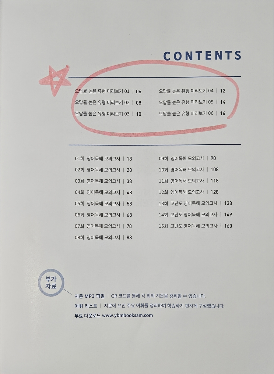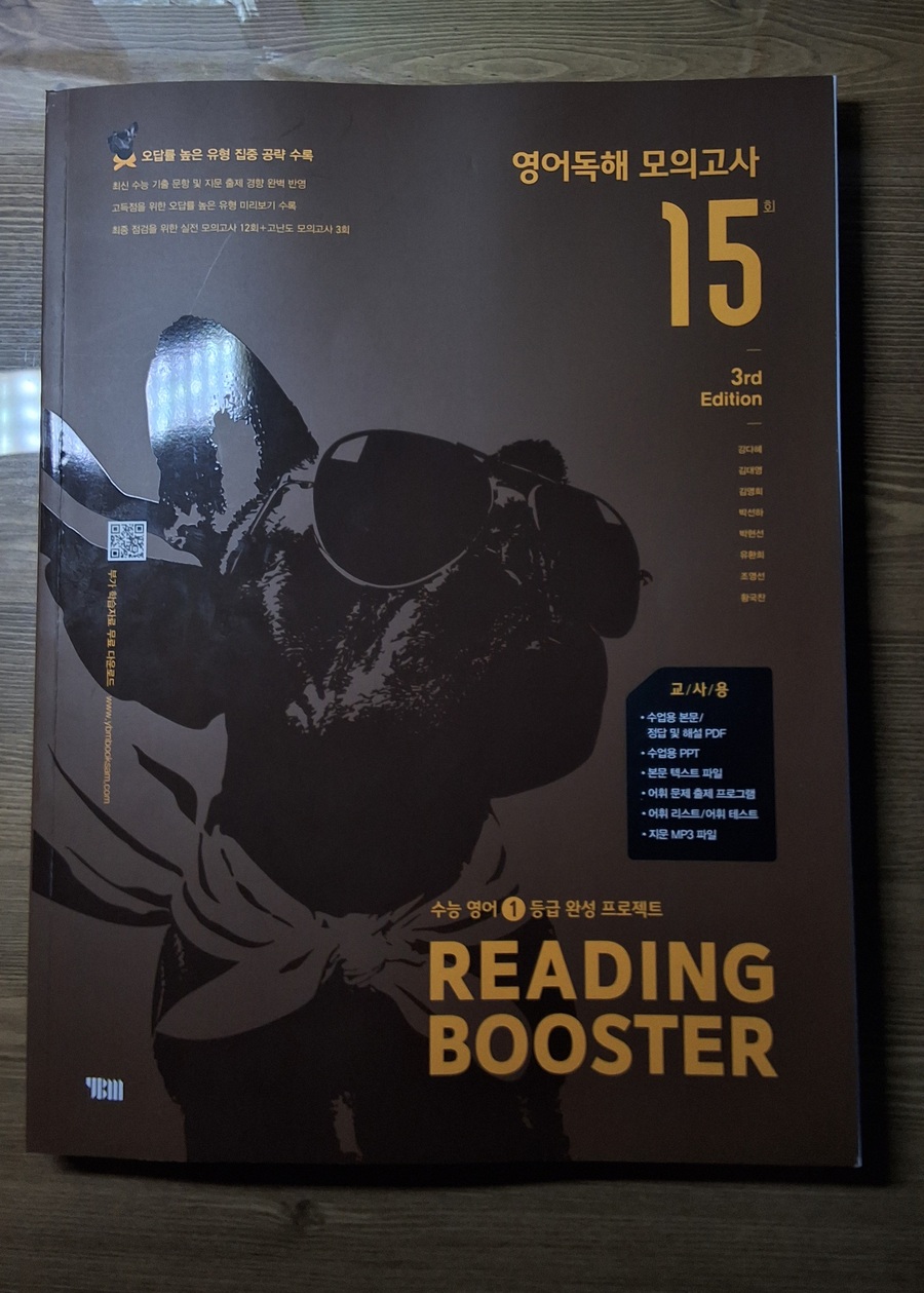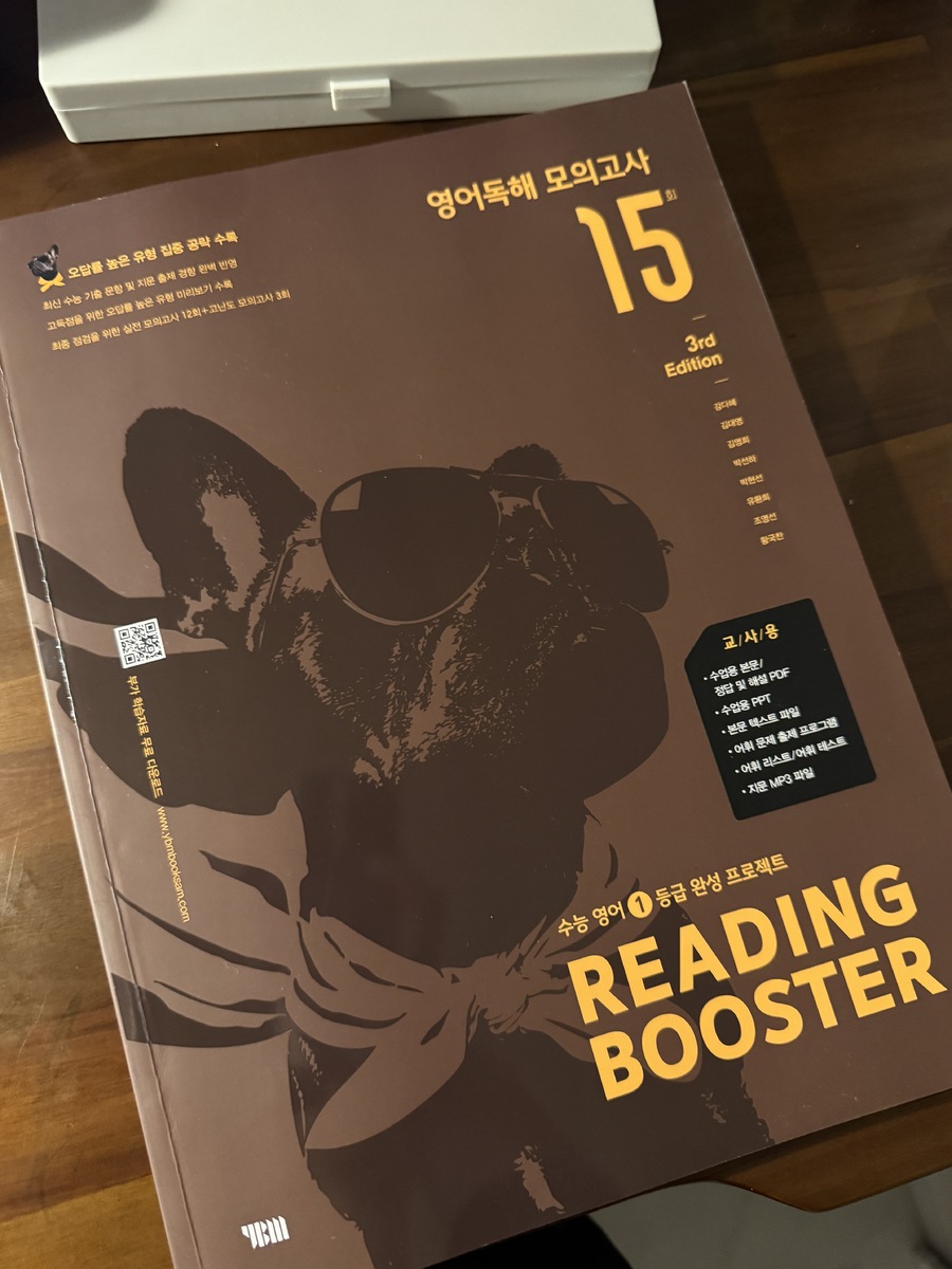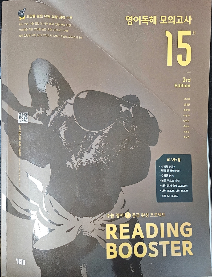 올해 1월, 예비 고1을 대상으로 한 멘토링에서 국어, 수학, 영어 과목을 가르치게 되었는데 영어는 내 전공이 아니다 보니 지식의 한계를 느껴 멘토로서 수능 영어 과목에 대한 심화학습이 필요하다고 느꼈다. 내 전공인 국어와 유사한 듯 차이가 느껴지는 영어를 추후 만나게 될 고등학교 학생에게 어떤 방법을 적용해야 유용하게 수업할 수 있을까 깊은 고민을 하게 되었다. 그러던 와중에 YBM영어문제집 [Reading Booster 모의고사 15회]를 바탕으로 학습하게 되었다. YBM은 영어교육 전문 출판사이기에 영어문제집으로는 이 출판사의 문제집을 추천한다.