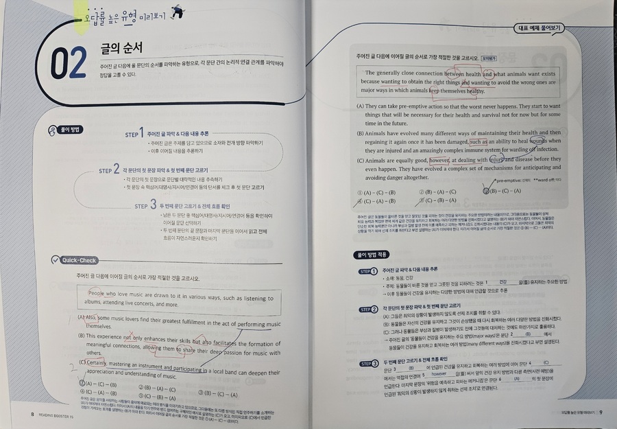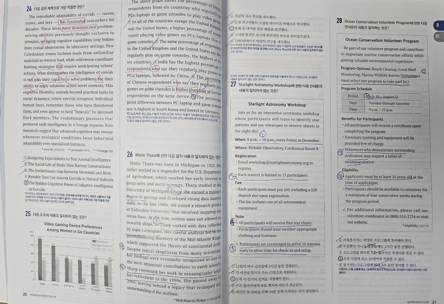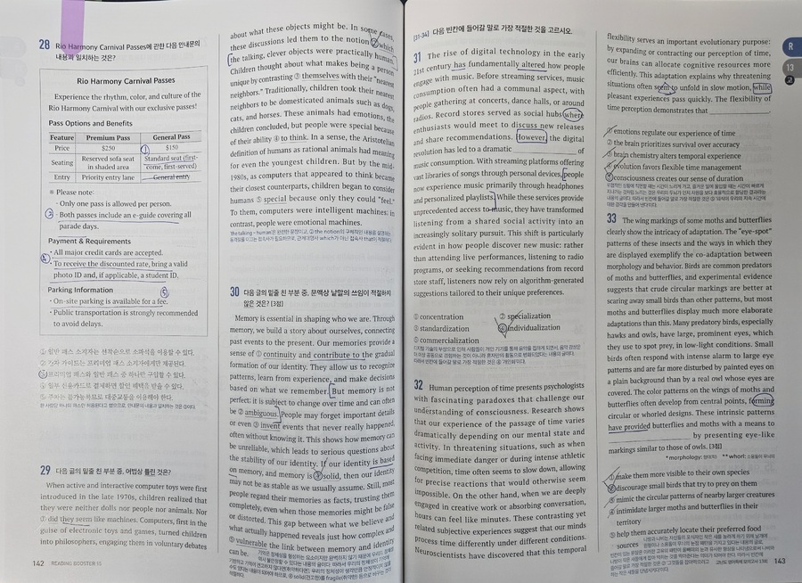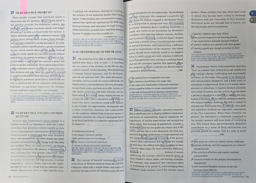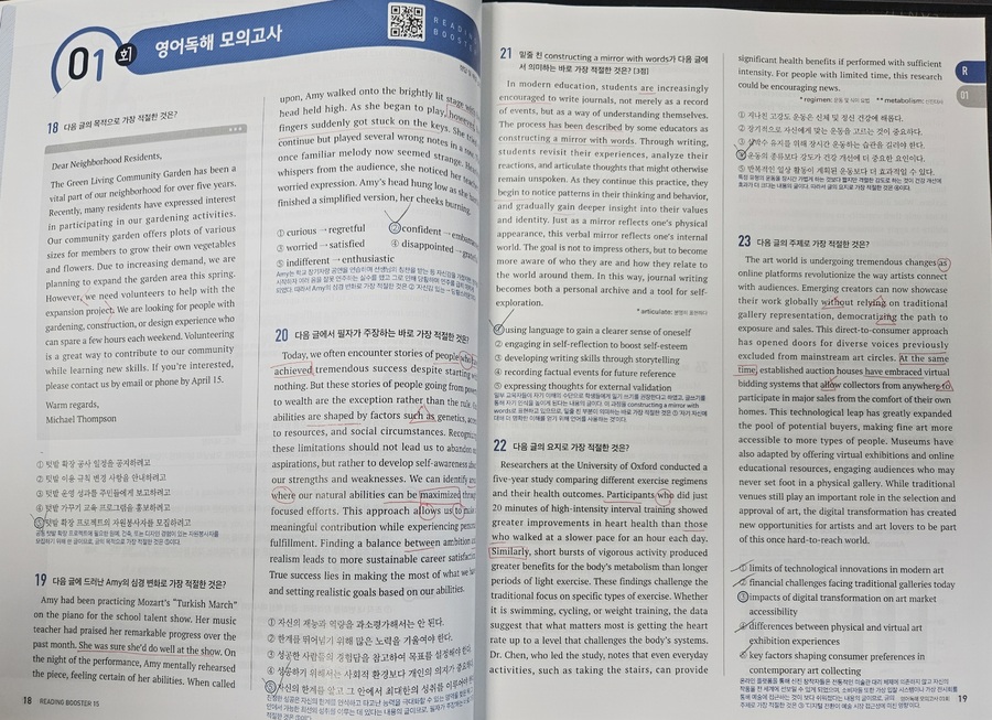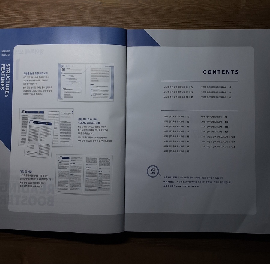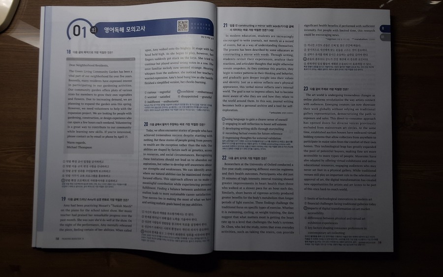 올해 1월, 예비 고1을 대상으로 한 멘토링에서 국어, 수학, 영어 과목을 가르치게 되었는데 영어는 내 전공이 아니다 보니 지식의 한계를 느껴 멘토로서 수능 영어 과목에 대한 심화학습이 필요하다고 느꼈다. 내 전공인 국어와 유사한 듯 차이가 느껴지는 영어를 추후 만나게 될 고등학교 학생에게 어떤 방법을 적용해야 유용하게 수업할 수 있을까 깊은 고민을 하게 되었다. 그러던 와중에 YBM영어문제집 [Reading Booster 모의고사 15회]를 바탕으로 학습하게 되었다. YBM은 영어교육 전문 출판사이기에 영어문제집으로는 이 출판사의 문제집을 추천한다.
