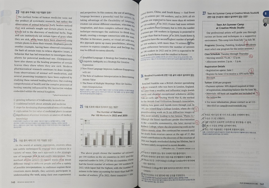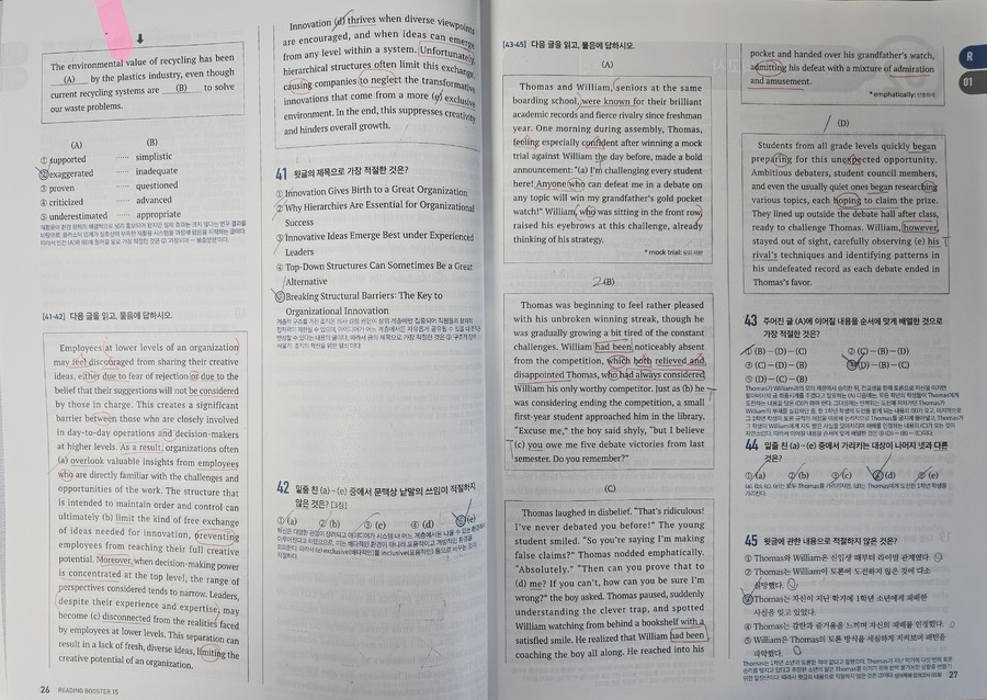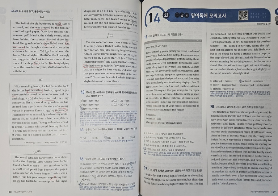 물론 43번-45번의 경우는 READING BOOSTER를 통해서 독해를 연습해 왔다면 무리없이 풀 수 있을 것입니다, 충분히 풀 수 있는 학생들이라면, 풀이 시간을 단축시킬 수도 있을 것이구요_! 지금까지 READING BOOSTER의 구성과 내용을 들여다보았습니다_! 정말 솔.직.하.게 수능을 목표로 하는 고3, 혹은 상위권 이상의 실력을 계속 유지하고 싶은 고2 학생이라면 적극적으로 "무조건 풀어보아야하는 문제집"이라고 말씀드리고 싶습니다, 구성이 알찬 것은 물론,유형에 알맞는 각각의 풀이 방법을 제시해주고 있기 때문에 영어 점수를 향샹시키는 데 너무 적합한 문제집이라고 느껴졌습니다_! 다가오는 26년 수능에서 고득점을 하고 싶은 학생들이라면 꼭! 풀어보시길 바랍니다:) #YBM#YBM리딩부스터#독해모의고사#고등모의고사#READINGBOOSTER #문제로풀자 #중학교참고서 |