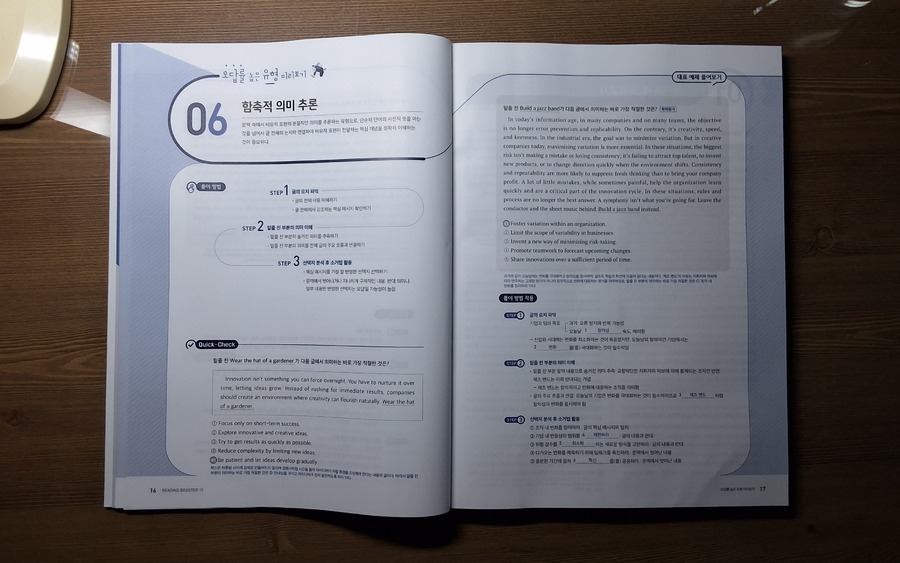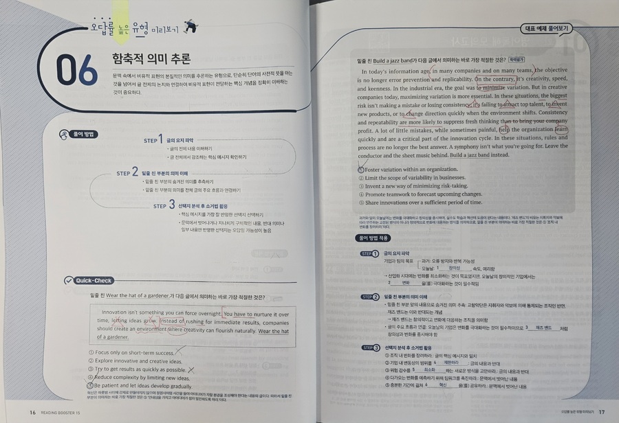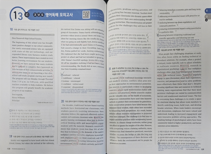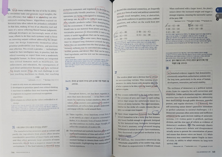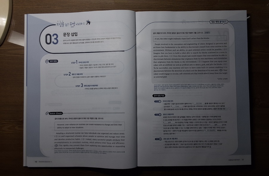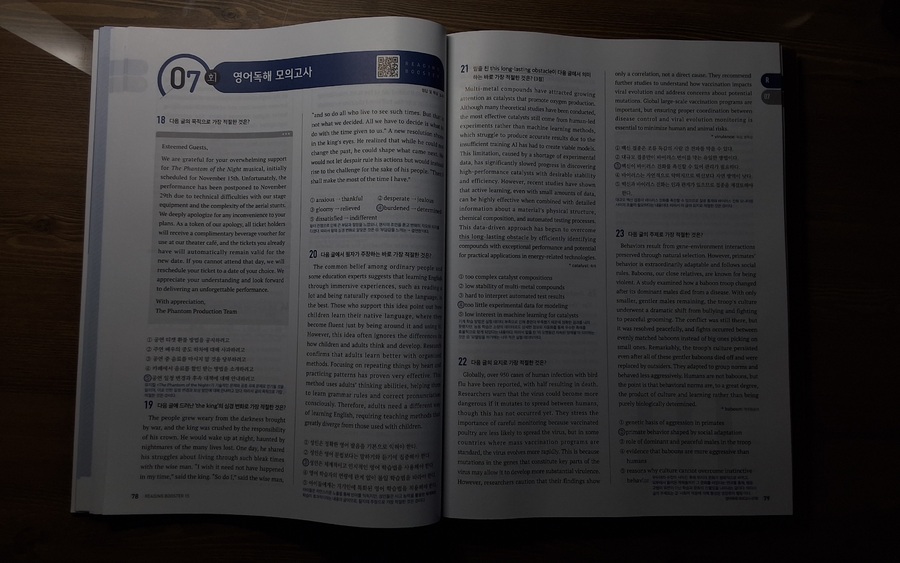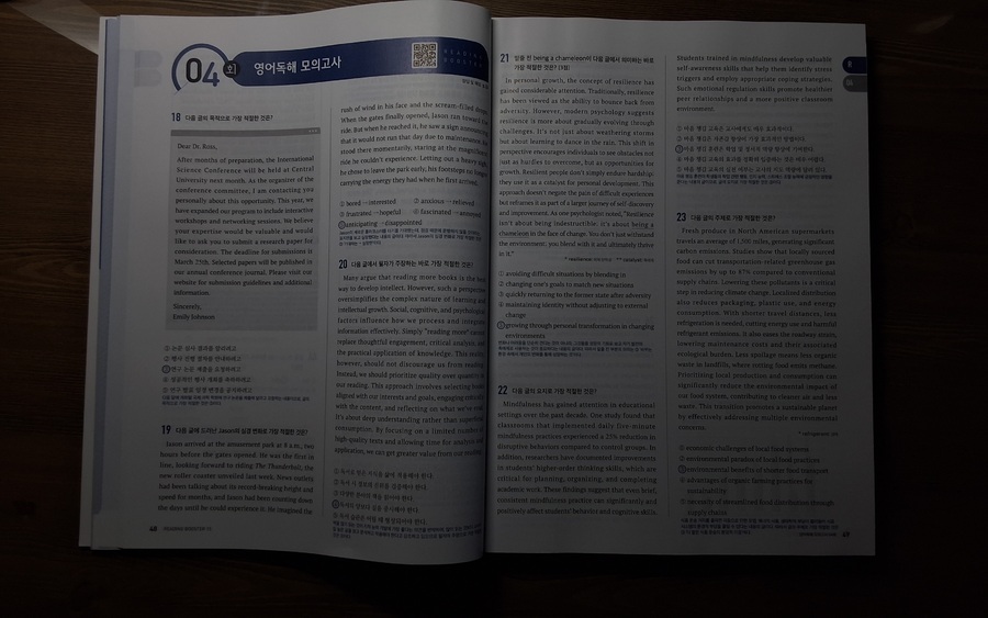 #리딩부스터 한 번 보니, 수능영어 독해의 감이 꽉잡힌다. 문제가 최신유형뿐만 AI 관련 비문학 지문도 간간히ㅜ보여서 올해뿐만 아니라 내년 수능 대비하는데 마지막 점검 코스로 최적의 문제집. 특히 마지막 빈칸에 들어갈 문장 추론 문제 유형은 정답이 지문의 로직대로 일관성을 유지하는데, 고난도 문제 수준의 신뢰도를 가늠할 수 있었다. |