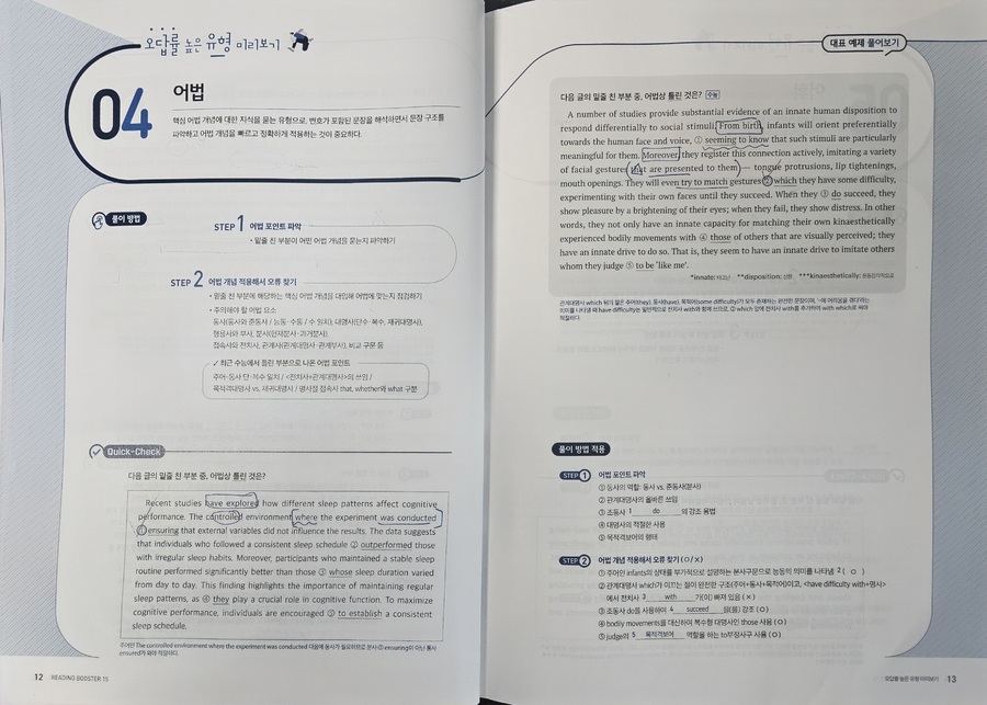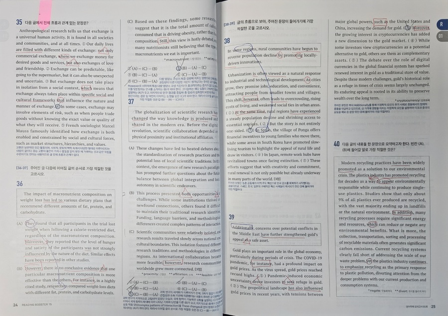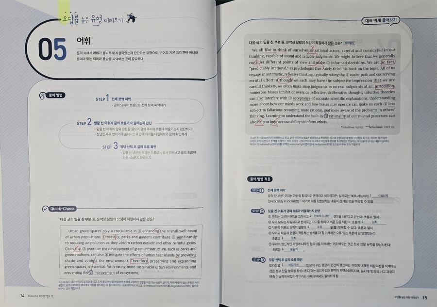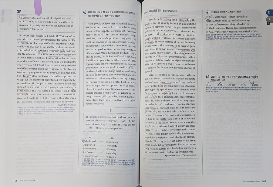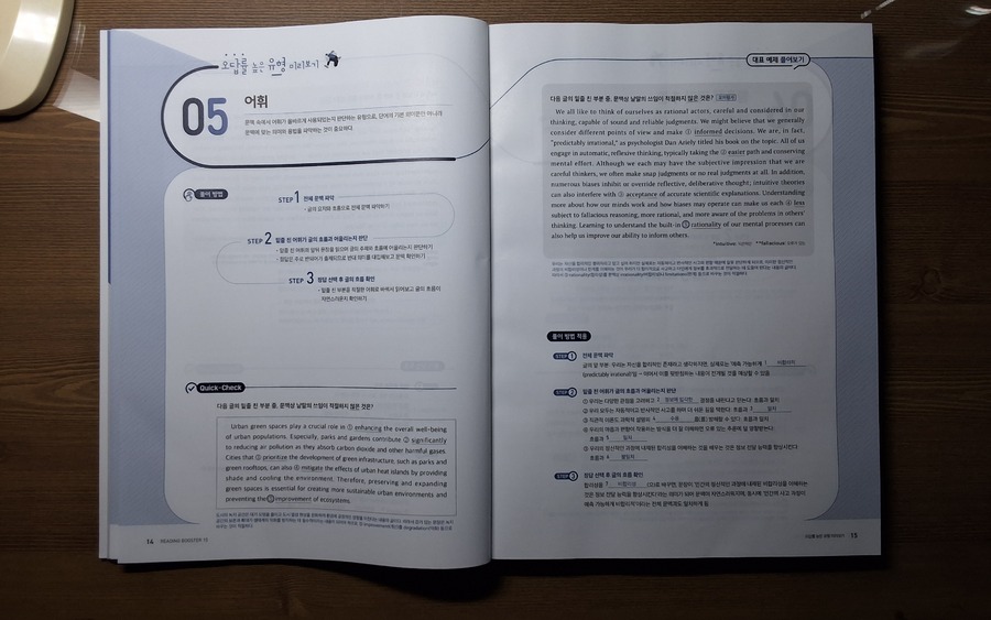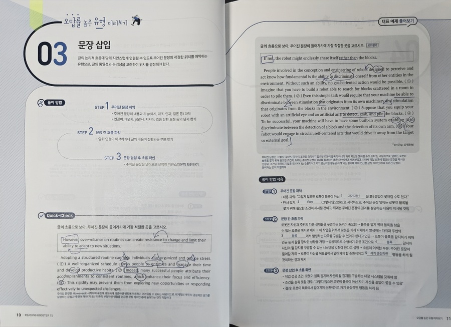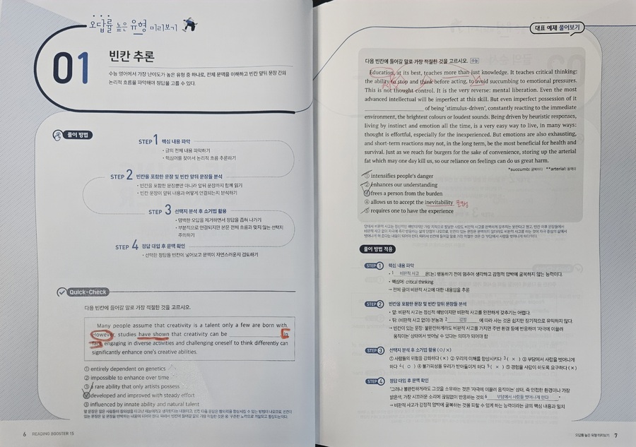#리딩부스터 한 번 보니, 수능영어 독해의 감이 꽉잡힌다. 문제가 최신유형뿐만 AI 관련 비문학 지문도 간간히ㅜ보여서 올해뿐만 아니라 내년 수능 대비하는데 마지막 점검 코스로 최적의 문제집. 특히 마지막 빈칸에 들어갈 문장 추론 문제 유형은 정답이 지문의 로직대로 일관성을 유지하는데, 고난도 문제 수준의 신뢰도를 가늠할 수 있었다. |
