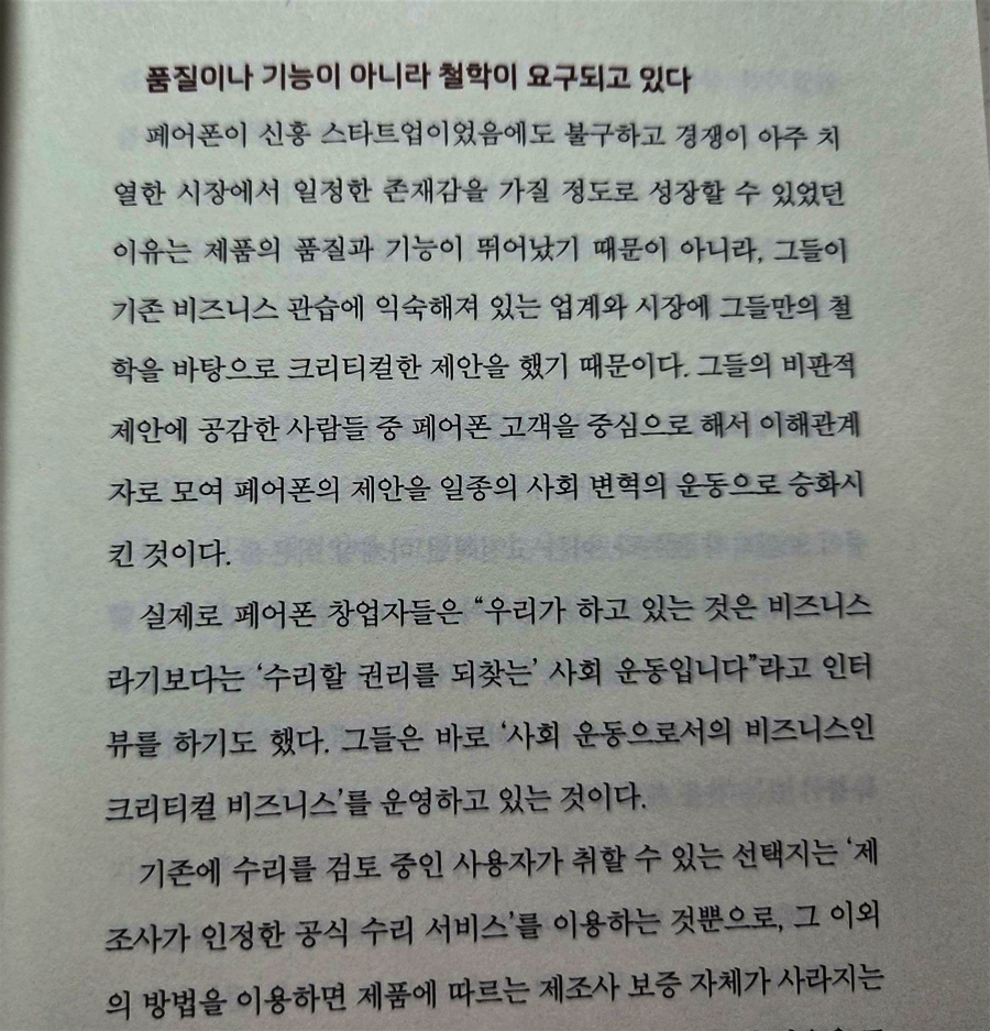 야마구치 슈의 <철학은 어떻게 삶의 무기가 되는가>라는 책을 읽었다. 철학에 대해 조금 더 깊이 있게 배우고 관심을 가지려고 했었던 계기가 되었다. 그러고 감사하게도 몇년만에 야마구치 슈의 신간을 읽을 수 있게 되었다. #크리티컬비즈니스패러다임 이라는 책 전반적으로 용어가 되게 낯설어서 어렵고 따분하진 않을까 내심 걱정하며 읽기 시작했다. 첫 느낌은 예전에 읽었던 작가의 신간이라 반가움과 호기심 두번째 느낌은 낯선 용어들에 살짝 주눅(?)이 들뻔했다는 사실. 그래서 크리티컬 비즈니스가 어떤건지 그 의미를 이해하고 읽어야 한다. 크리티컬 비즈니스 패러다임은 투자가, 고객, 거래처, 직원등 이해관계자의 가치관을 비판적으로 고찰하고 지금까지와는 다른 대안을 제안함으로써 사회에 가치관 업데이트를 일으키는 것을 목표로 하는 것이라고 한다. p.27 누군가는 비판적인 사고가 썩 좋지 않다고 말하기도 하며 비판적인 사고를 하는 사람을 부정적인 시각으로 바라보는 사람도 생각보다 꽤 많다는 사실이다. 그러나 우리사회가 발전하기 위해선, 더나은 사회와 개인의 삶, 그리고 더 발전하는 기업이 되려면 그 배후에는 비판적으로 고찰하는 사람들이 꼭 필요하다고 생각한다. 남들과는 다르게 생각하는 그런 사람들이 하나 둘 모여 변화할 수 있는 스탑워치가 눌러져 타이밍이 시작되는 것👍 책을 읽다보면 점점 더 작가의 말에 설득되기 시작하고 공감하기 시작한다. 이 책을 읽는 사람이, 어떤 기업의 대표 일 수도 있고 평범한 직장인 일 수도 있고 평범한 주부 일 수도 있고 학생 일 수 도 있다. 끝이 보이지 않는 긴 터널 같은 인생의 도로를 한발한발 걸어 나아가다가, 내 삶을 재정비 해야 할 순간이 올 때 잠깐 멈추어 정비 할 수 있는 비상대피로 같은 찰나의 책이 되지 않을까 싶다. 크리티컬 비즈니스 패러다임
