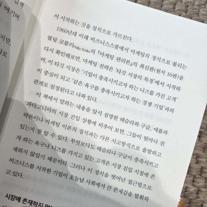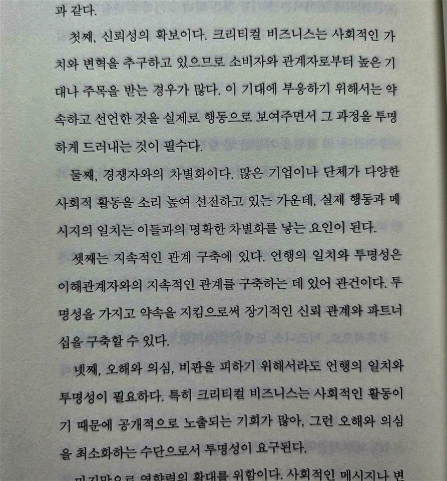 야마구치 슈의 <크리티컬 비즈니스 패러다임>은 비즈니스 활동의 근본을 들여다보며 철학적으로 고민하고, 지금과는 다른 방식으로 도전하는 것이 어떤 결과를 낳을 수 있는지 설명하는 도서에요. 기업의 성공 방정식을 소비자 심리 분석에 바탕을 둔다면 어느 선까지는 안정적으로 성장할 수 있지만, 그 이상은 나아가기 힘든 이유를 특유의 통찰력을 들어 표현하고 있죠. 소비자 심리에 부응하기 위하여 노력하는 건 결코 나쁜 일이 아니지만, 이렇게 효율만을 위해서 움직이는 게 과연 미래성이 있는 사고방식인지 한 번쯤 생각하는 계기를 던져주고 있답니다. 더불어 지금의 기업들이 진정으로 추구해야 하는 가치가 무엇인지 철학적으로 사유하고 있죠. 올해 마케팅 심리 관련 강의를 듣고 있는데요, 소비자 심리에 대해서 배우면서 우리 주변에서 일어나는 비즈니스와 인간관계의 원리를 나름 이해하기 시작했다고 생각했었어요. 그런데 이 책을 읽으면서 그 상식을 뒤집는 것이야말로 미래지향적인 기업이 가져야 하는 자세라는 생각이 들더라고요. 구글이나 테슬라, 파타고니아 같은 회사들이 어떻게 기존과는 다른 비판적 시각으로 시장을 만들었는지, 그리고 비즈니스가 우리의 삶과 어떤 철학적인 연결 고리가 있는지를 다루는 책이니까 경제, 경영에 대해서 전혀 몰라도 재미있게 읽을 수 있었답니다. 대개 마케팅이라고 하면 고객의 심리를 분석하고 숨겨진 니즈를 찾아내어 충족시키는 게 가장 중요하다고 해요. 심지어 한 번 실수를 했더라도 어떻게 대응하느냐에 따라서 오히려 고객의 신뢰도가 이전보다 확고해질 수 있을 정도니까요. 그런데 야마구치 슈는 이런 접근 방식이 미래 사업에는 한계가 있다고 해요. 생각해 보면 우리 소비자들이 원하는 건 대부분 이전의 경험 혹은 상상할 수 있는 것들 안에서 나오는 경우가 많잖아요. 그러니 아무리 고객 심리를 열심히 분석해 봤자, 결국은 이미 형성되어 있는 틀 안에서만 움직이게 될 확률이 높은 거죠. 그래서 작가는 크리티컬 비즈니스라는 개념을 가지고 나왔어요. 이는 고객의 필요에 반응하는 수준을 넘어서 아직까지 생각하지 못했거나 아니면 입 밖으로 내지 못했던 가치를 기업이 먼저 제안하고 창조하는 방식이에요. 즉 무언가를 많이 팔아야겠다는 측면이 아니라 우리 기업의 존재 이유, 세상에 기여하는 방식에 철학적인 질문을 던지고 비즈니스를 하는 거라고 보시면 좋을 거 같아요. <크리티컬 비즈니스 패러다임>은 고객 심리 분석을 넘어선 비전이 어떻게 시장을 바꾸었는지 예시를 들어서 설명하고 있어요. 구글은 "검색 엔진을 멋지게 만들어보자!"는 식으로 출발한 게 아니에요. 전 세계의 모든 정보를 누구나 쉽게 찾아서 쓸 수 있게 하자는 비전을 가지고 시작했죠. 뭘 검색하고 싶어 하는지를 분석하기보다는 접근성 자체를 바꿈으로써 나가아서는 세상을 바꾼 거죠. 테슬라는 지속 가능한 에너지로 세상을 바꿔보자는 목표를 갖고 있어요. 제가 어릴 때부터 화석 에너지의 고갈과 관련한 이슈가 계속되어 왔음에도 사람들은 오히려 점점 더 큰 차- 연료를 많이 소모하는 차를 원했잖아요. 그런데 테슬라는 인류의 미래라는 윤리적 가치를 내세움으로써, 고객들이 전기차를 구입하고 나아가서는 미래를 생각했다는 만족감을 갖게 했어요. 이런 예를 들어가면서 <크리티컬 비즈니스 패러다임>은 우리가 진짜 찾아야 하는 가치가 무엇인지 이야기하고 있어요. 고객이 뭘 원하는지 분석하기보다는 고객이 앞으로 무얼 신념으로 삼아야 하는지를 먼저 제시한 셈이죠. 이게 바로 시장을 창조하는 힘이라고 해요. 책을 읽다 보니 ESG 경영이 자연스레 떠올랐어요. 작가가 이야기하는 사회적 합의가 아직 없는 어젠다를 가지고 시장을 이끌어가는 방식은 요즘 기업들이 왜 ESG에 집중해야 하는지와 연결되고 있거든요. 책에서 기업은 이윤만 좇는 경제적인 주체가 아니라 사회와 인류 전체에 미치는 영향 및 윤리적 책임과 관한 고민이 필요하다는 이야기를 해요. 이런 관점은 ESG가 기업의 지속 가능한 성장을 위한 경영 철학이 되어야 한다는 점과 딱 맞아떨어지는 거 같아요. 환경을 생각하고 사회에 기여하며 투명하게 운영하는 건 국가나 투자가들의 규제 혹은 제한 때문이 아니라 기업 스스로가 지향해야 하는 본질적인 가치에서 나와야 한다는 거죠. 사업을 하는 사람도 아니고 마케팅 업계 종사자도 아닌데…그렇다면 이 책을 굳이 읽을 필요 없는 건 아닐까 할 수도 있을 거예요. 그런데 제가 읽어보니까 <크리티컬 비즈니스 패러다임>은 비즈니스 하는 사람들만을 위한 도서가 아니더라고요. '제6장 활동가를 위한 10개의 총알'이라는 챕터가 있는데요, 이 파트를 읽으면서 스스로에게 많은 질문을 던지게 되더라고요. 소비자 심리를 공부할 때에도 이건 마케팅뿐만 아니라 일상적인 인간 심리에도 적용되는 거구나 하는 생각을 했었어요. 이 책도 마찬가지였죠. 7장부터는 우리 같은 평범한 사람, 소비자들이 이런 크리티컬한 사고방식을 일상에 적용하면서 성장시킬 수 있는지를 상세히 알려주더라고요. 그래서 <크리티컬 비즈니스 패러