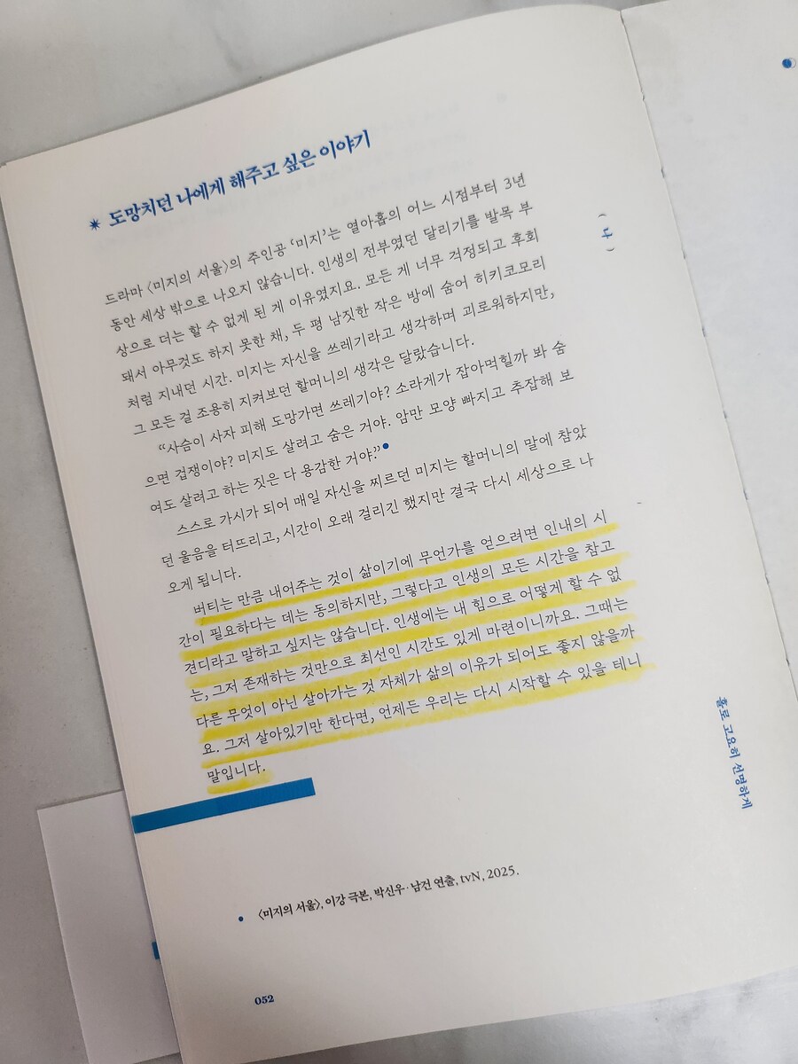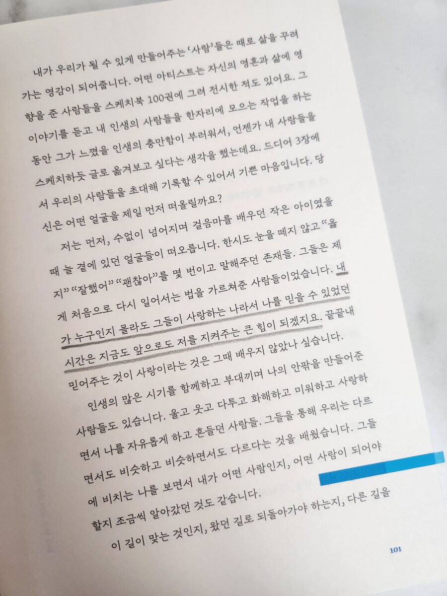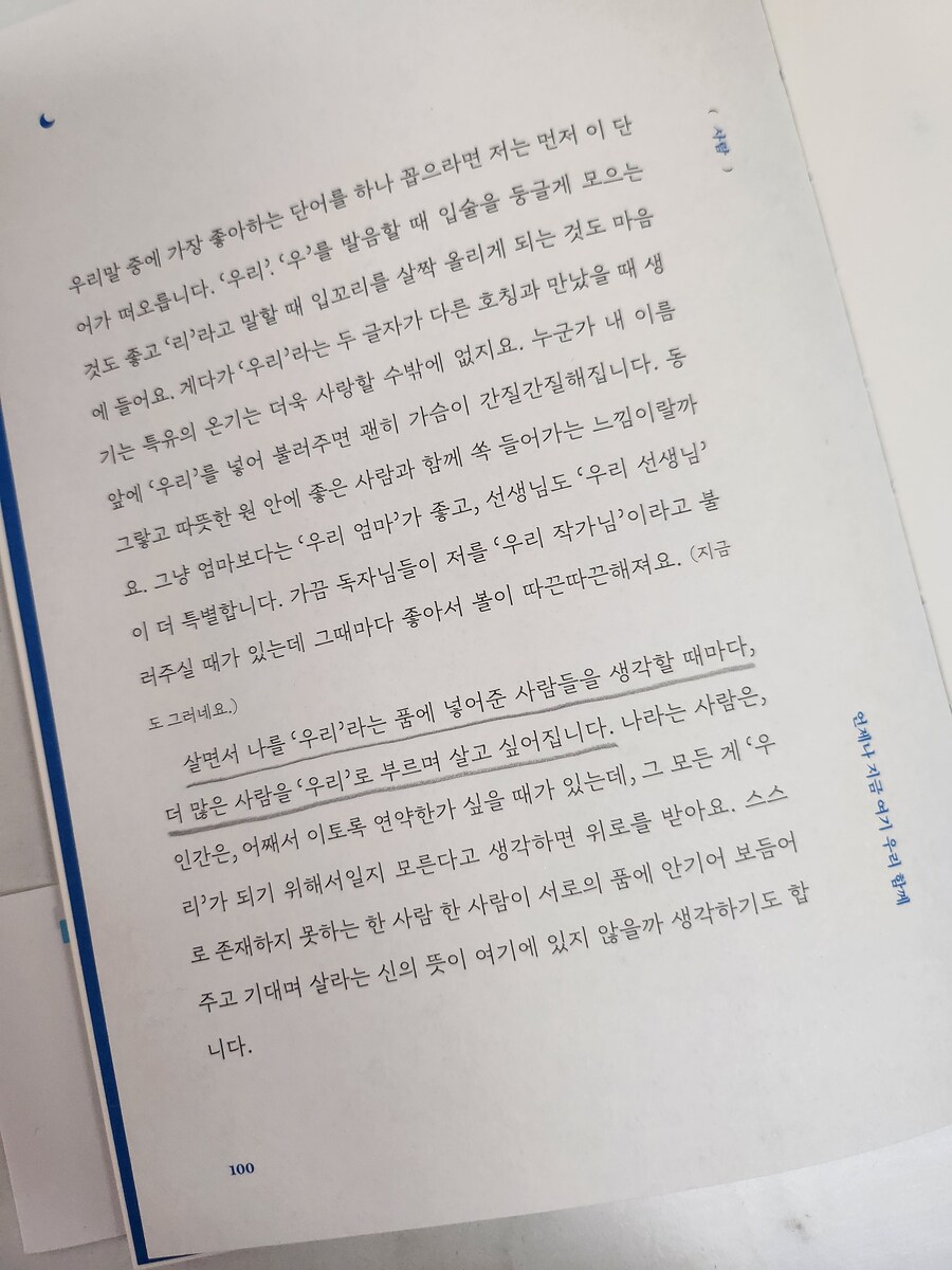 ✍️시간은 앞으로만 가는데 마음이 자꾸만 따라와주지 못할 때 그런 때가 있죠? 모지라고 멍청이같았던 시간 속의 나를 끄집어 내고, 여전히 꽁꽁 얼어붙어 가시돋힌 마음을 날카롭게 쏟아내기도 했죠. 이런 나를 읽고나면 뭐야 이거 하며 백스페이스를 눌러버릴거야, 친해지고 싶은 사람 목록에서 제거되겠지? 하는 염려는 보기좋게 날아가버렸어요. p.100저를 '우리' 라는 이름 안에 넣어준 작가님과 글벗들의 존재는 오랜 시간 삶에서 도망쳐 고개숙이고 있던 저에게 안전지대가 되어주었어요. p.101이렇게 자신의 상처를 들여다보며 글로 써내려갈 수 있는 사람이라면 강한 사람이라고, 좋은 사람이라고 다독여주던 그 말을 믿고싶어지더라고요. |