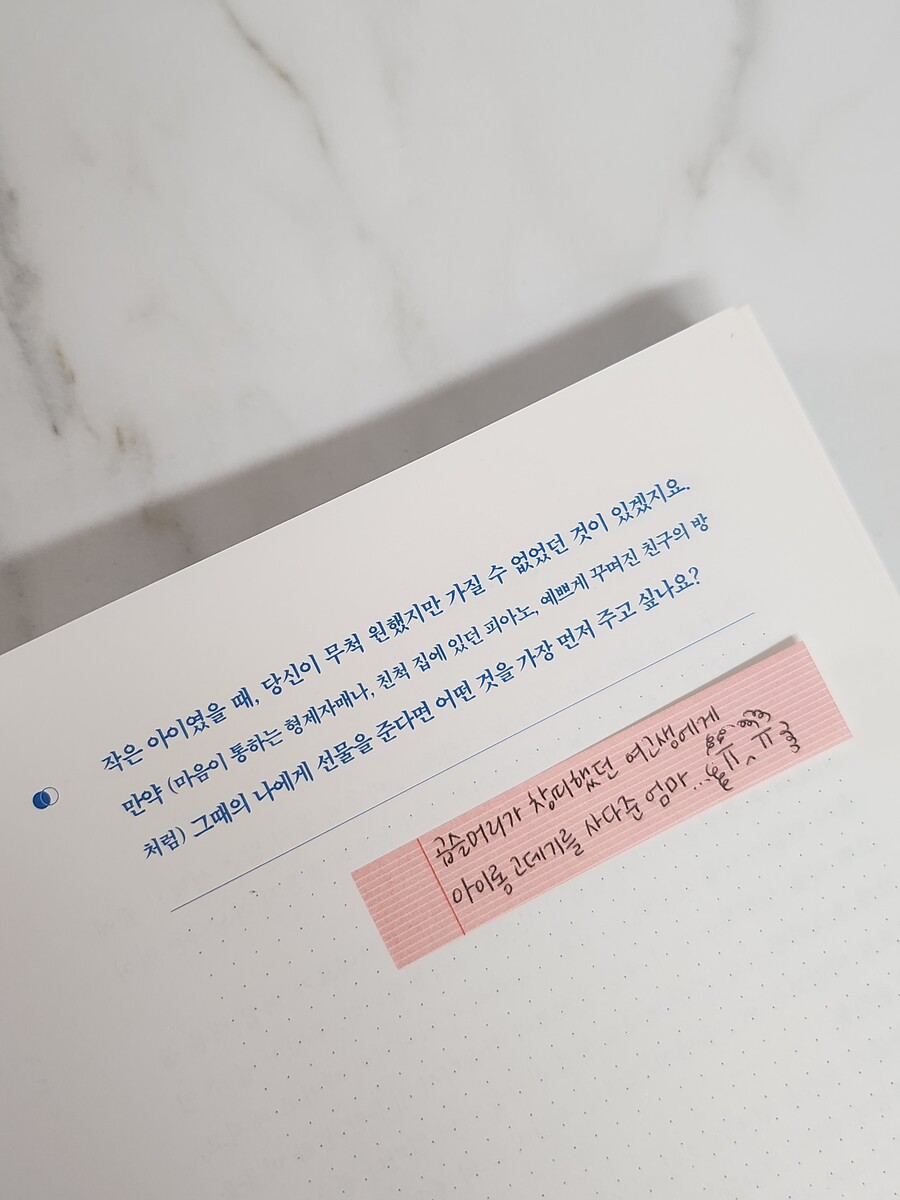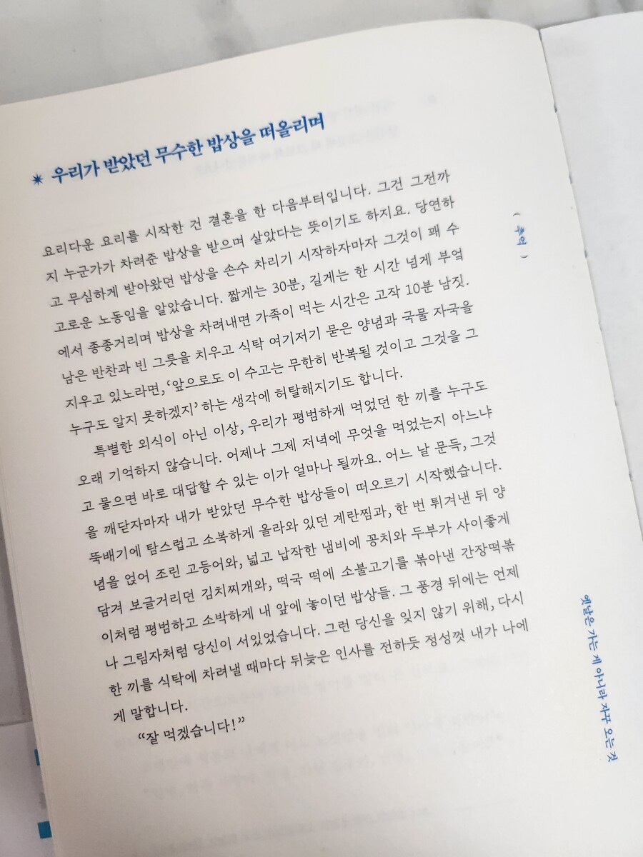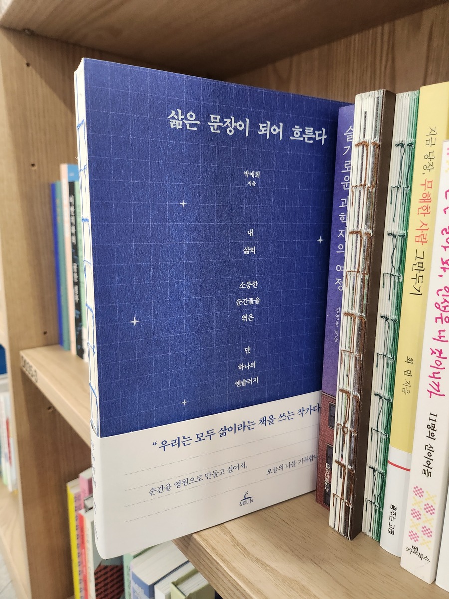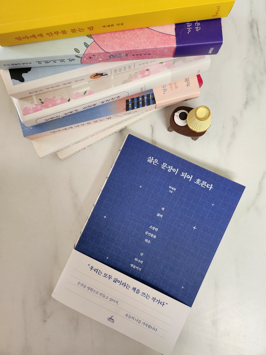 만날천날 내가 끓이는 된장찌개만 보다가 정성 들여 정석대로 끓인 된장찌개를 감상하는 기분. 박애희 작가의 ‘삶은 문장이 되어 흐른다’ 이 책을 읽는 내내 딱 그런 기분이 나를 감쌌다. 일상의 한 장면 한 장면을 세밀하게 들여다보고 거기에 흐르는 감정을 찾아내고 우리에게 꼭 필요한 다정함으로 재생산하는 과정이 이렇게 정성스러울 수가 없다. 공항에서 비행기를 기다리며 사부작거리는 아이가 신경 쓰이는 작가에게 ‘잘 크고 있는 거’라고, ‘아이가 가만히만 있으면 어디 아픈 거’라고 말해주던 할머니를 통해 우리가 들었던 ‘별것 아닌 것 같지만 도움 되는 말 한 마디’를 끄집어내게 한다. ‘이 나이 먹도록 잘하는 게 하나도 없다’는 흔한 탄식 속에서도 ‘사실 잘 살펴보면 누구나 잘하는 게 있고, 당신이 잘하는 것은 무엇인지 생각해보라’는 줄기를 뽑아낸다. 그뿐인가. 작가는 책 한 줄도 허투루 읽지 않아서, ‘나는 늙었고 엄청나게 많은 불행에 대해 알고 있지만 그 대부분은 일어나지 않았다’고 했던 마크 트웨인의 말에서 불행을 견디는 가장 좋은 방법이 바로 삶을 긍정하는 웃음이라는 이야기를 끌어내고 우리가 가장 크게 웃었던 때를 되새기게 한다. 내 생각에 작가의 눈에는 고배율의 돋보기가 달렸고, 심장에는 최첨단 센서가 달린 게 틀림없다. 그래서 이렇게 평범하게 스쳐갈 것들을 세밀하게 들여다보고 거기서 우리에게 필요한 따뜻함을 찾아낼 수 있는 거 아닐까. 나처럼 덜렁거리며 대충 사는 사람으로서는 그가 보여주는 감정의 미시적 세계가 감탄스럽기만 하다. 그런데 책장을 넘길수록 숙제가 잔뜩 생기는 기분이다. 솔직히 고백하면 이 책을 끝까지 읽을 수나 있을지 모르겠다. 아니 이 책은 작가가 묻고 독자가 대답해야 하므로 ‘읽는다’는 표현보다는 ‘함께 완성한다’는 표현이 더 맞을 텐데 그게 가능할지 잘 모르겠다. 책의 오른쪽에 붙은 파란색 질문에 일일이 답하기가 어려워서 대충 건너뛰며 책의 왼쪽 장만 다 읽은 채 지금 독후감을 쓰고 있기 때문이다. 안드로메다로 떠나버린 청춘의 나에게 응원의 메시지를 던지라고? 어제 먹은 반찬도 기억이 안 나는데 인생에서 특별히 기억에 남는 선물과 사연을 되새기라고? ‘설렘’이란 그저 아이스크림 이름인가 싶은데 그동안 나를 가장 설레게 했던 말과 대답을 추억하라고? 작가가 묻는 말에 응답하려면 시간의 구멍이 숭숭 뚫린 나의 삶을 되짚어봐야 하는 데.. 영 쉽지 않을 것 같다.