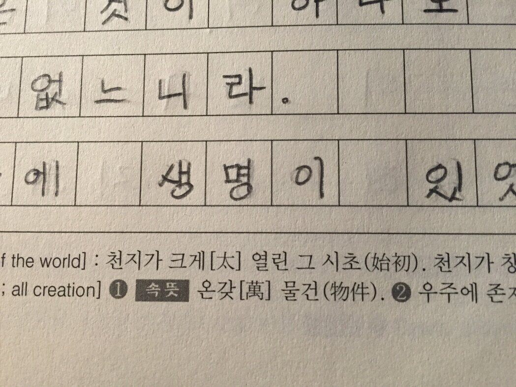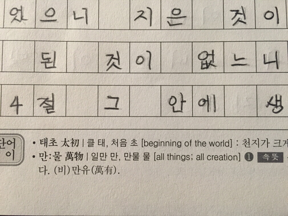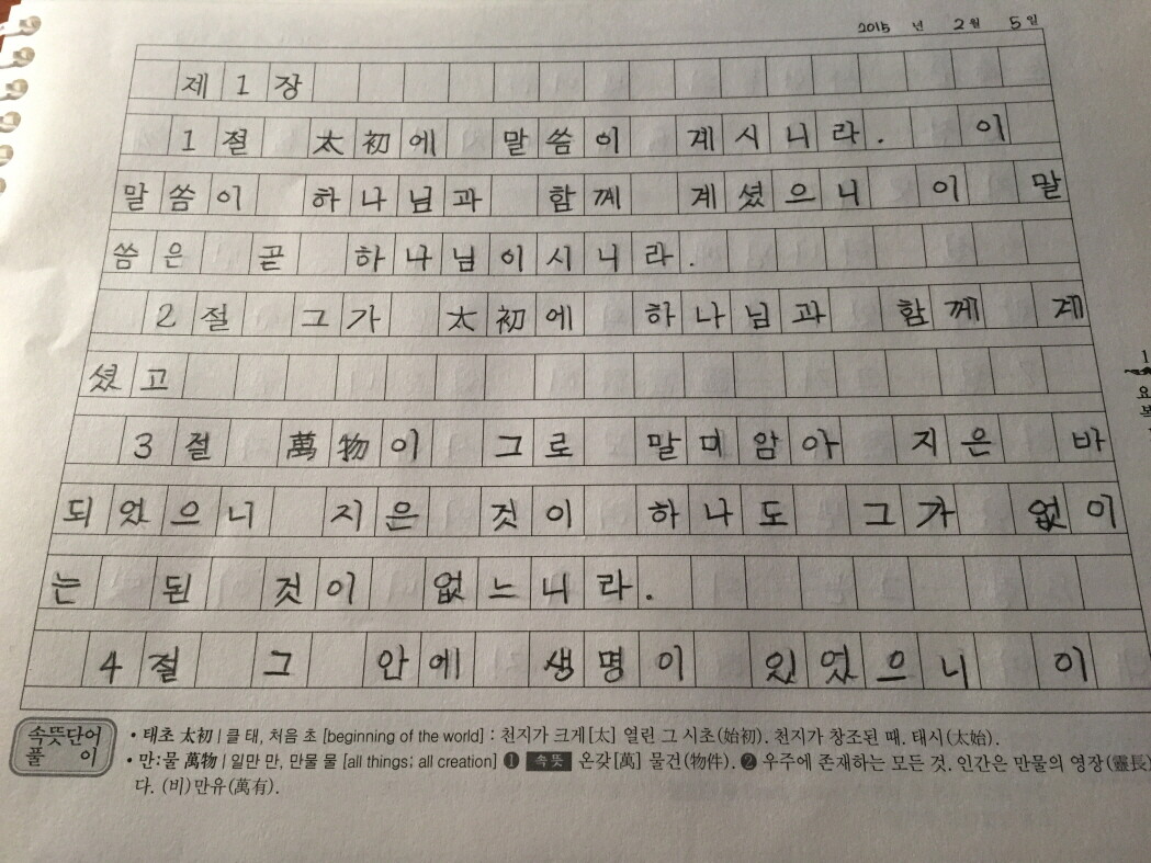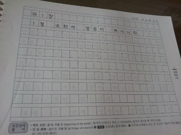 ![]() 1장 1절부터 시작 되었어요~ 태초에 말씀이 계시니라. 보시는 바와 같이 원고지형으로 되어 있어서 사이 띄어쓰기를 자연스럽게 익힐 수 있어요. 상단에 보시면 날짜를 적을 수 있게 되어 있구요~ 한자로 된 글자 중 한글 표기가 아닌 한자 표기로 따라 쓸 수 있게 되어어서 참 유익하다는 생각을 했어요~ 책 아래를 보시면 어려운 단어에 대한 속뜻풀이를 해서 단어에 대해 더욱 자세하고 쉽게 설명되어 있답니다. 아이와 목표를 정할 때 바닥수로 정할지, 절 수로 정해서 쓸지에 대해서는 아직 결정하지 못했지만, 각 가정마다 아이의 상황을 고려해서 지혜롭게 정하면 될 것 같아요~