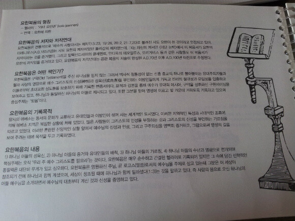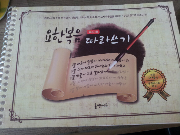 요즘은 초등학생인 저희 아이도, 엄마인 저도 손 글씨 보다는 타이핑에 익숙해 져서, 손글씨를 쓴다는 것이 점점 힘들어져 글씨쓰기에 대한 고민을 하고 있던 중 홈스쿨러들을 위한 커뮤니티인 “아임홈스쿨러”에서 발행한 “요한복음 따라쓰기”를 접하게 되었습니다. 일단 외형부터 보면, 일반 노트와 달리 스프링으로 되어 있어서 넘기기에 편하게 되어 있어요~ 표지를 보는 순간, 마음을 다잡게 됩니다~