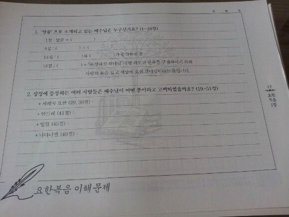 각 장이 끝날 때마다 이해문제가 있어서 다시 말씀을 되새길 수 있어서 좋아요~ 아직 여기까지는 못했지만 아이에게 각 장이 끝날 때마다 이해 문제가 있다고 이야기를 했더니, 조금 더 신경써서 글씨를 쓰는 모습을 볼 수 있었답니다~ 요한복음은 21장까지이니 이렇게 각 장이 끝날 때 마다 풀 수 있는 이해문제가 21번이 있겠지요? ^^