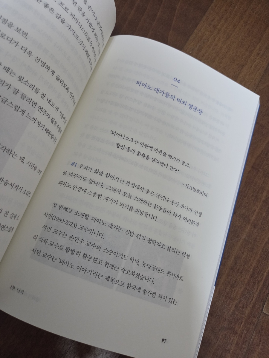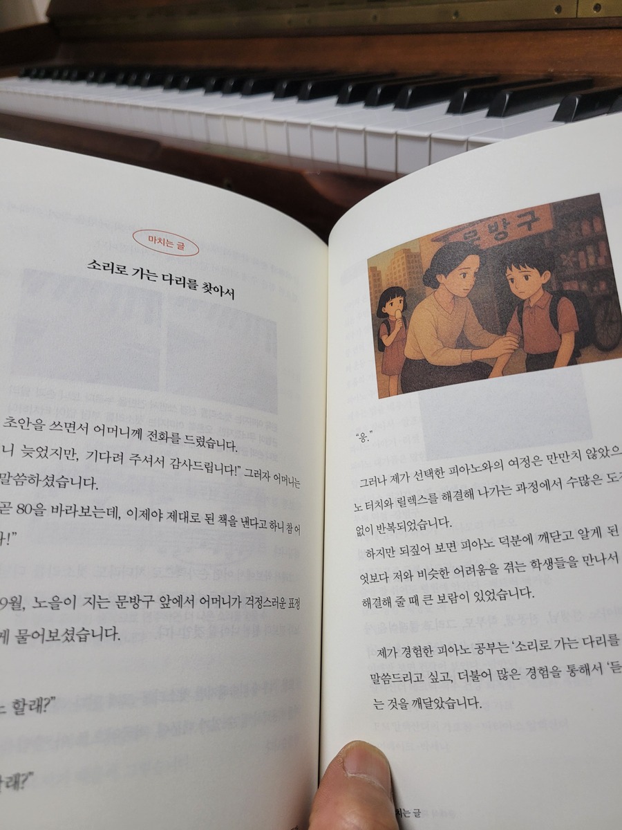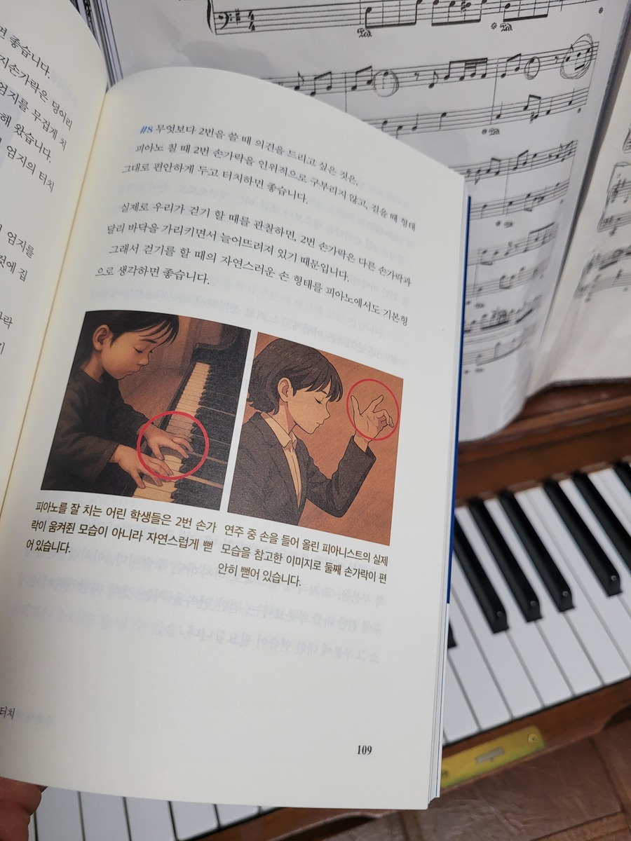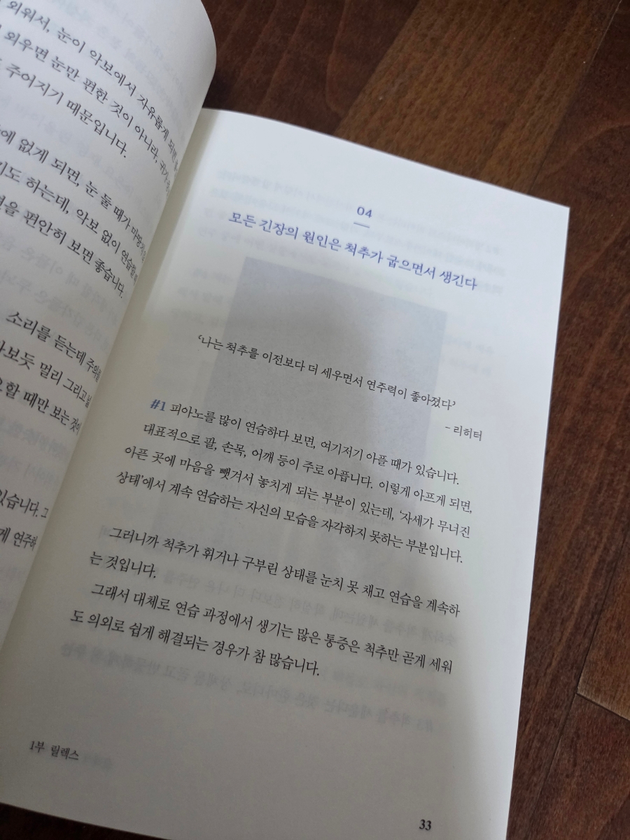 이 책을 읽으며 가장 인상 깊었던 부분은 저자가 강조하는 ‘명상하듯 연주하는 감각’이에요. 우리는 흔히 피아노를 잘 치기 위해 ‘손가락 힘’과 ‘반복 연습’에만 집중해요. 하지만 저자는 손끝의 힘이 아닌 올바른 자세와 편안한 호흡, 균형 잡힌 감정에서 진정한 연주력이 나온다고 강조하죠.