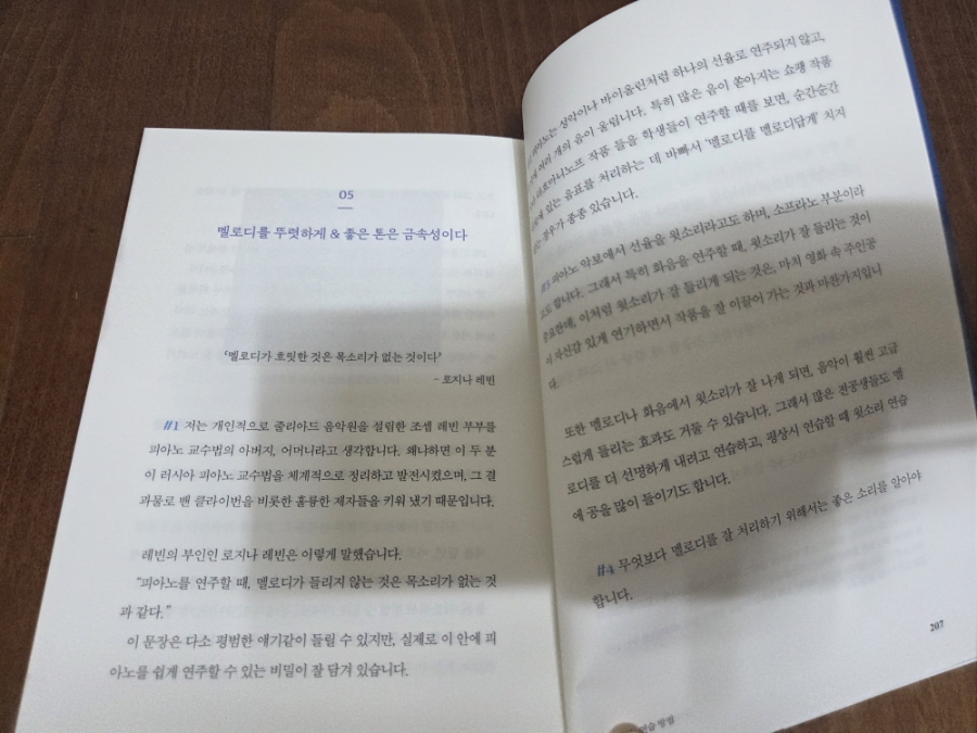 멜로디를 멜로리답게 연주하게 되면 피아노 연주가 한결 품격 있고 고급스럽게 들립니다. 더불어 피아노에서 좋은 톤이란 금속성에 가까운 소리라 말할 수 있는데 피아노 칠 때 소리를 머리 위로 보낸다고 생각하면 좋은 소리를 내는데 도움이 될 것입니다. 소리의 본질과 음악적 감각의 깊이를 담고 있다. “멜로디를 멜로디답게”라는 말이 참 아름답게 다가온다. 그 말 속에는 단순한 기술이 아닌, 음악의 성격을 이해하고 존중하는 마음이 담겨 있다. 멜로디의 흐름을 자연스럽게 살려낼 때, 피아노는 단순한 악기가 아니라 감정을 전달하는 목소리가 된다. 또한 “소리를 머리 위로 보낸다”는 표현은 단순한 이미지 이상의 의미로 느껴진다. 그것은 소리를 들어 올리는 의식, 즉, 마음과 감각을 높여 음악을 ‘위로’ 올리는 행위이기도 하다. “소리를 높이면, 마음도 함께 높아진다.” 기술을 넘어, 소리에 품격을 입히는 마음가짐을 일깨워주는 문장이다. 이 책은 클래식 피아노 특강을 통해 단순히 연주 기술만이 아니라, 음악을 대하는 마음의 태도를 배운 시간이라고 한다. 손끝의 움직임보다 중요한 것은 소리에 귀 기울이는 마음, 그리고 그 마음을 지탱해 주는 바른 자세와 기본기임을 다시 느꼈다. 연습이란 완벽을 향한 길이 아니라, 수많은 시행착오 속에서도 조금씩 자신만의 소리를 찾아가는 여정이라는 말이 깊이 남는다 피아노의 건반 위에서 흐르는 소리는 결국 내 안의 마음이 반영된다는 것이라는 걸 깨달았다. 🎶 이 책을 읽으면서 어릴 때 피아노를 배웠던 기억이 가물거렸다. 피아노를 배우면서 허리는 꼿꼿하게 바로, 손은 둥글게, 연습하러 올 때는 조금만 먹고 오라고.. 피아노 음이 위에서 들린다 생각하고, 한음한음 정확하게 쳐야한다. 박자 맞추고, 기본기에 충실하자 피아노 선생님이 한 말들이 어렴풋이 기억났다 선생님이 왜 그런 말을 했는지 이 책을 읽고 이해하게 되었다.